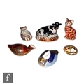 Six assorted Royal Crown Derby paperweights to include a Fresian Cow Buttercup, a cat and a duck, all marked as seconds, all with silver stoppers. (6)