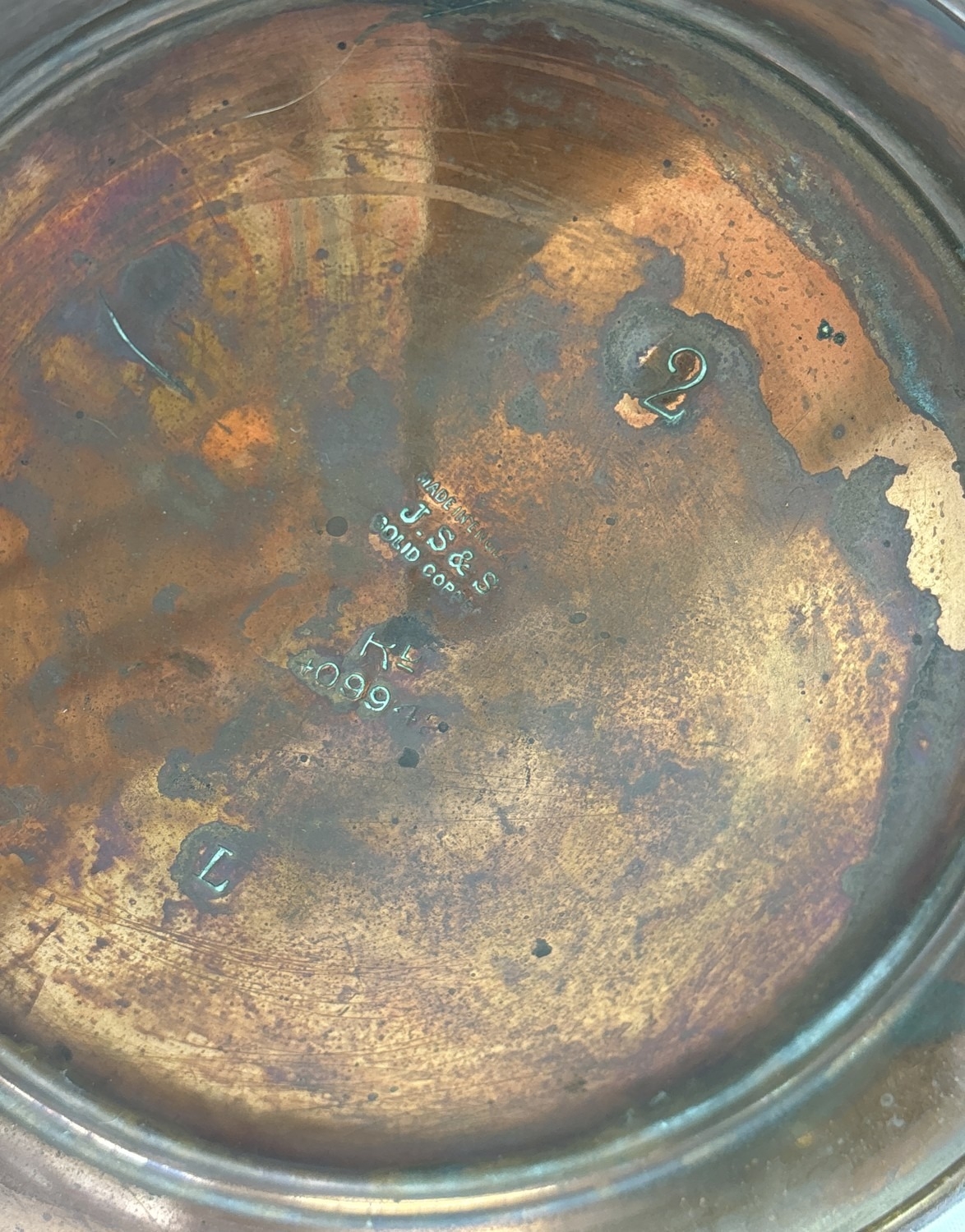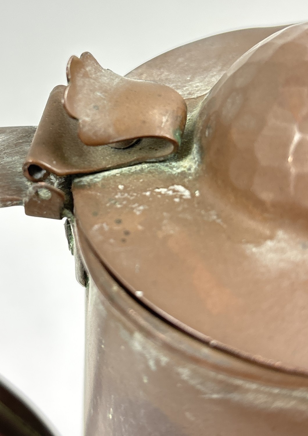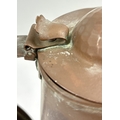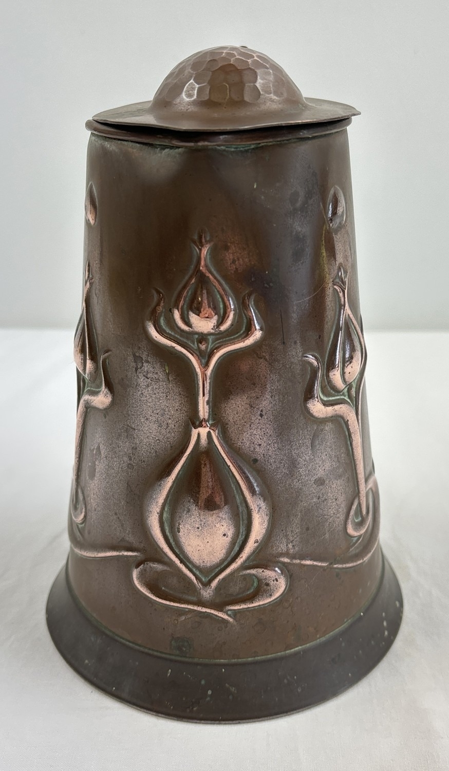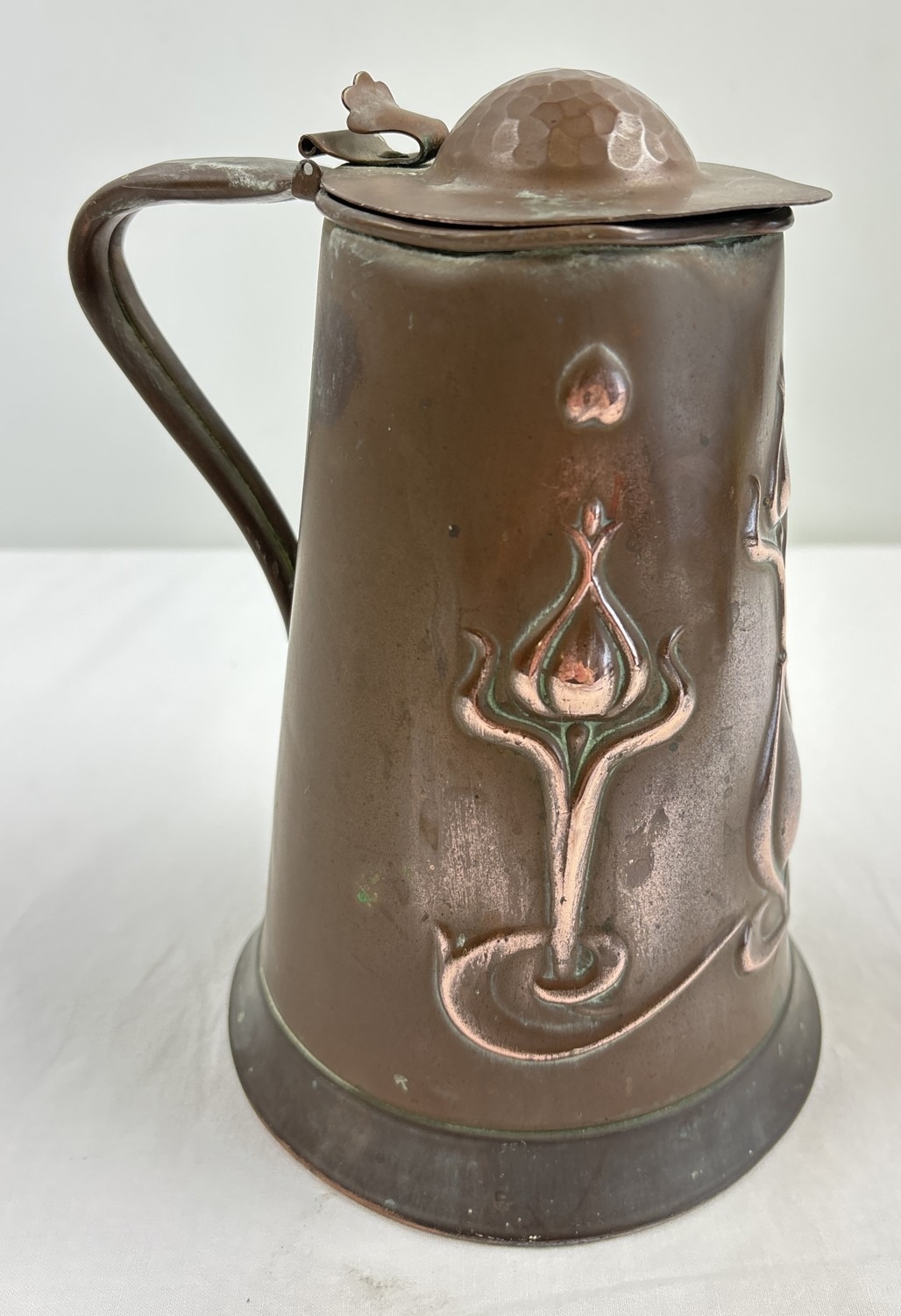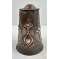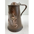 An Art Nouveau copper 2 pint lidded water jug by Joseph Sankey & Sons. Hammered detail to lid and stylized tulip design to body with small heart detail. Pin from lid hinge missing. 2 small dents to handle with 3 small dents to body. Approx. 19.5cm tall including lid. Makers name, registered number and pint size to base.