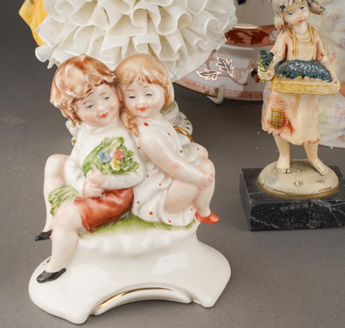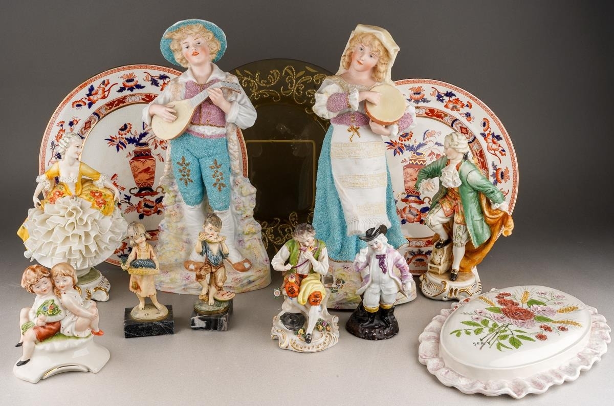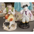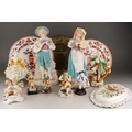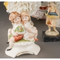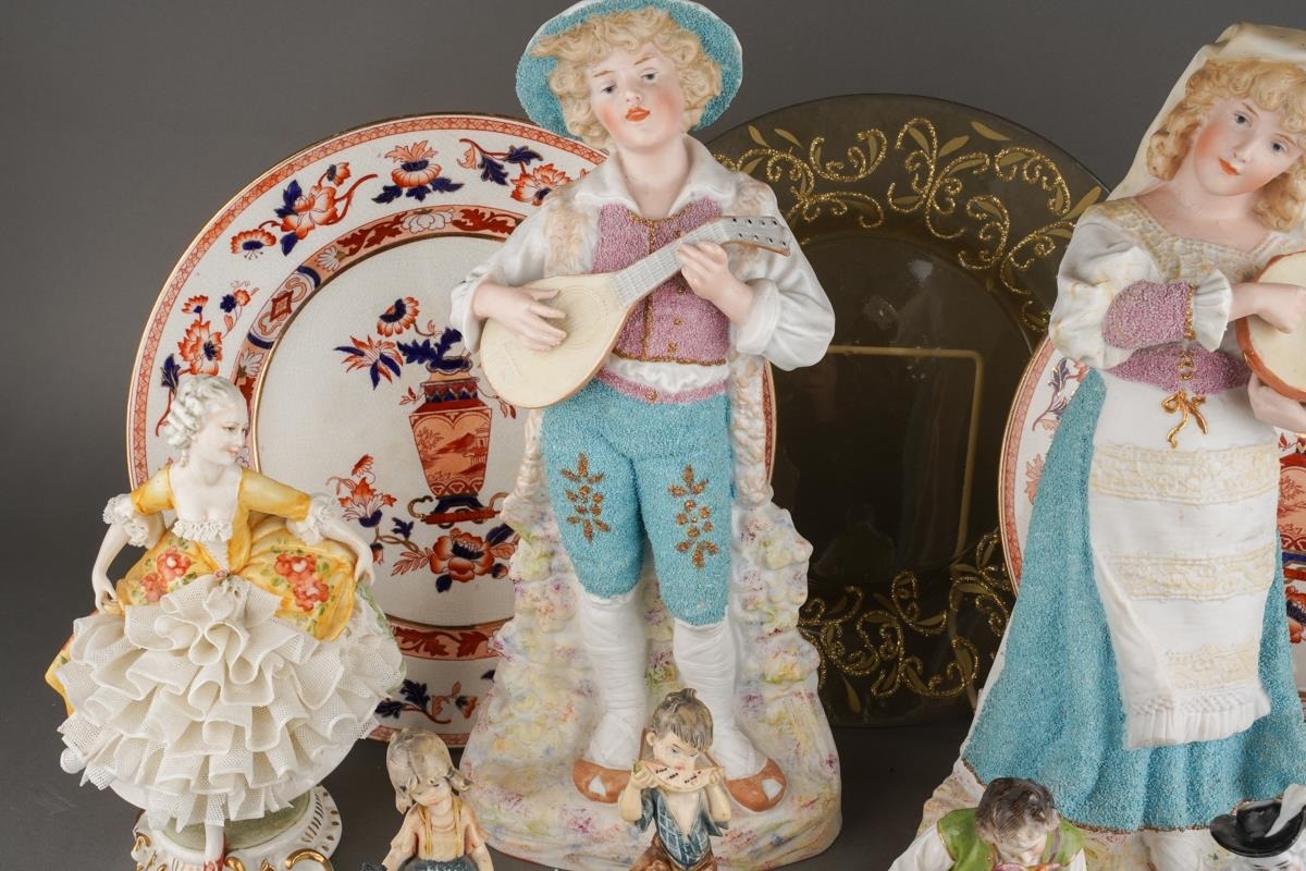 A box of figural ceramics and other ceramics and glassware, including a pair of Heubach bisque figures, s.d., height 32cm approx, a Capodimonte figure group of two children, figure of a boy with a bird, broken cage, two porcelain encrusted lace figures, s.d, etc (1 box)
