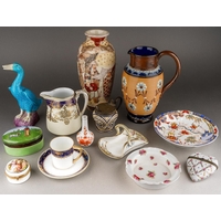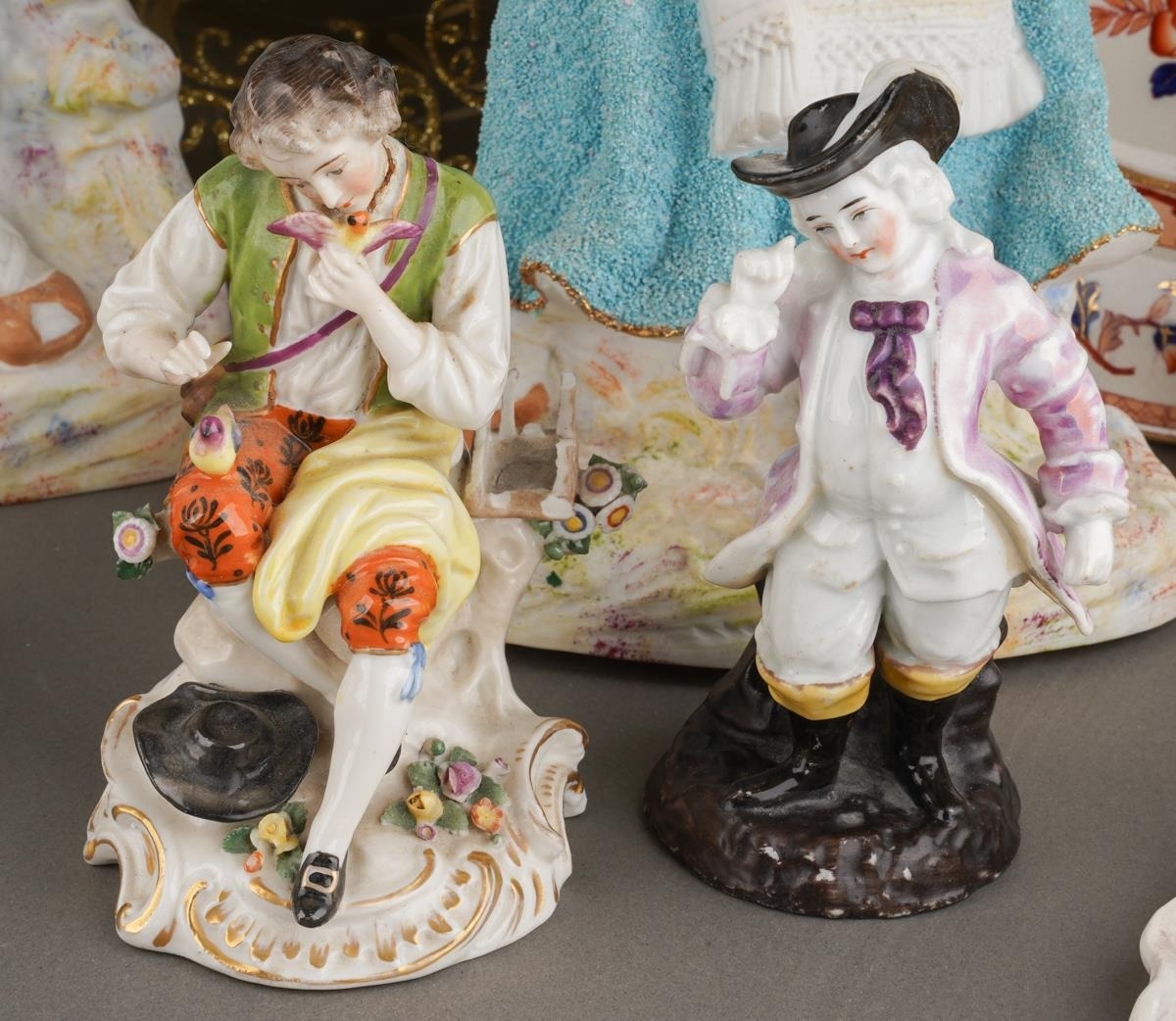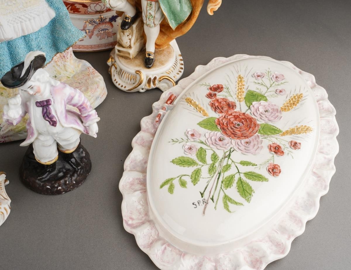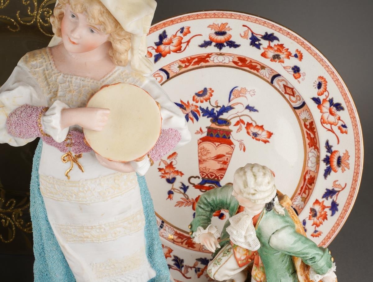A box of figural ceramics and other ceramics and glassware, including a pair of Heubach bisque figures, s.d., height 32cm approx, a Capodimonte figure group of two children, figure of a boy with a bird, broken cage, two porcelain encrusted lace figures, s.d, etc (1 box)