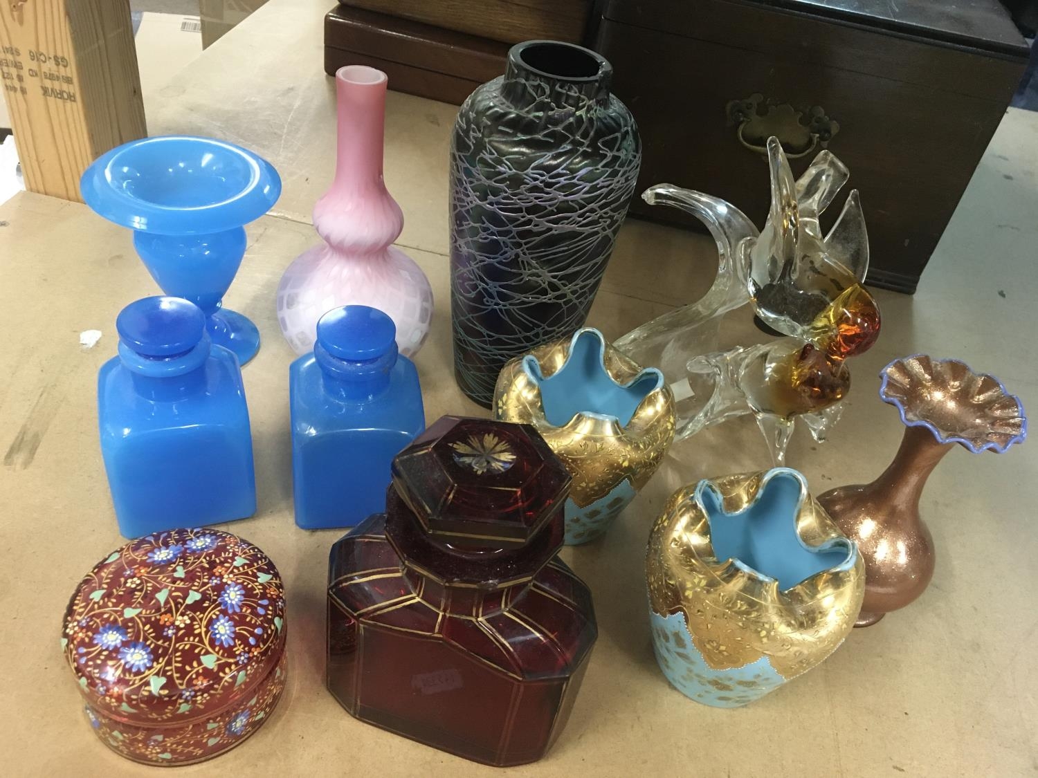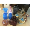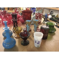 A collection of Victorian glassware including a cranberry perfume bottle with stopper