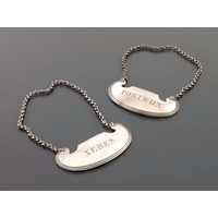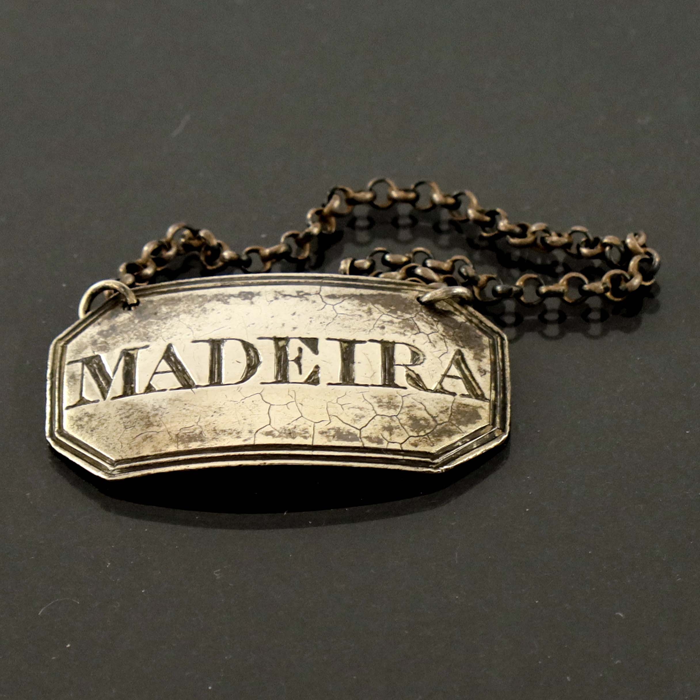 A George IV Scottish silver wine label for Madeira, J W Howden and Co., Edinburgh 1821, chamfered rectangular form, suspended on a rolo chain, 4.2cm, 0.28ozt