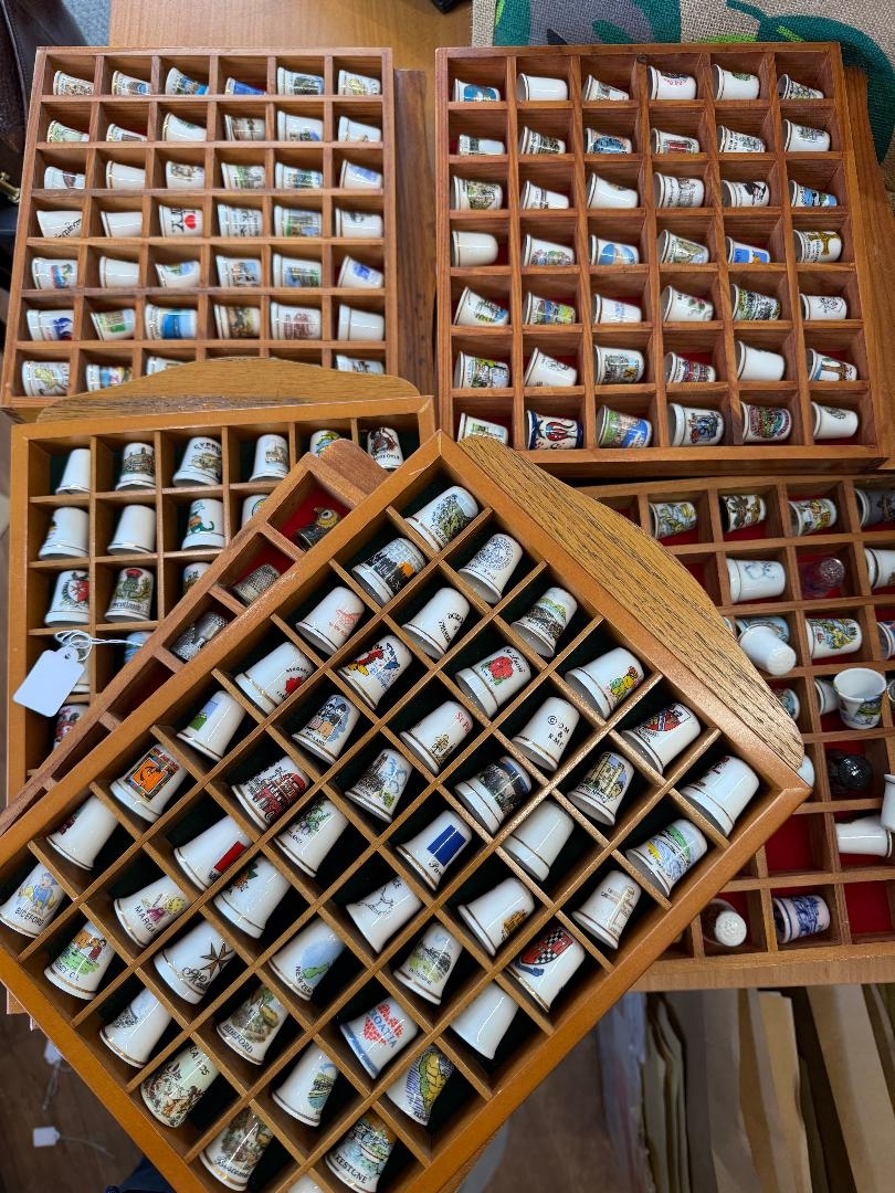 THIMBLES, large collection of china thimbles, various designs in 15 display cases, (BUYER COLLECT) over 550 thimbles