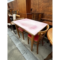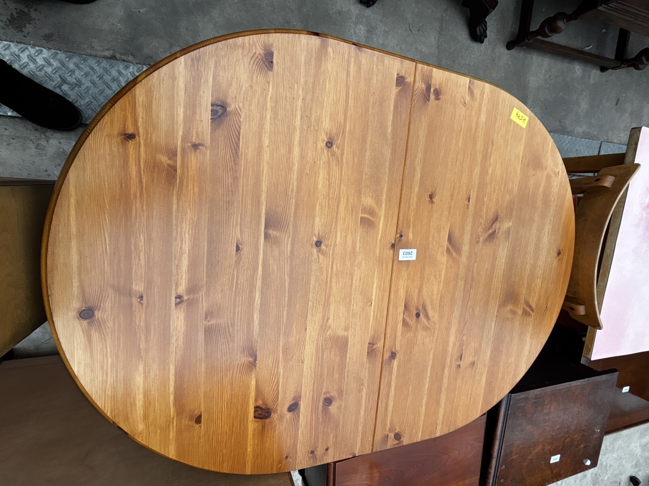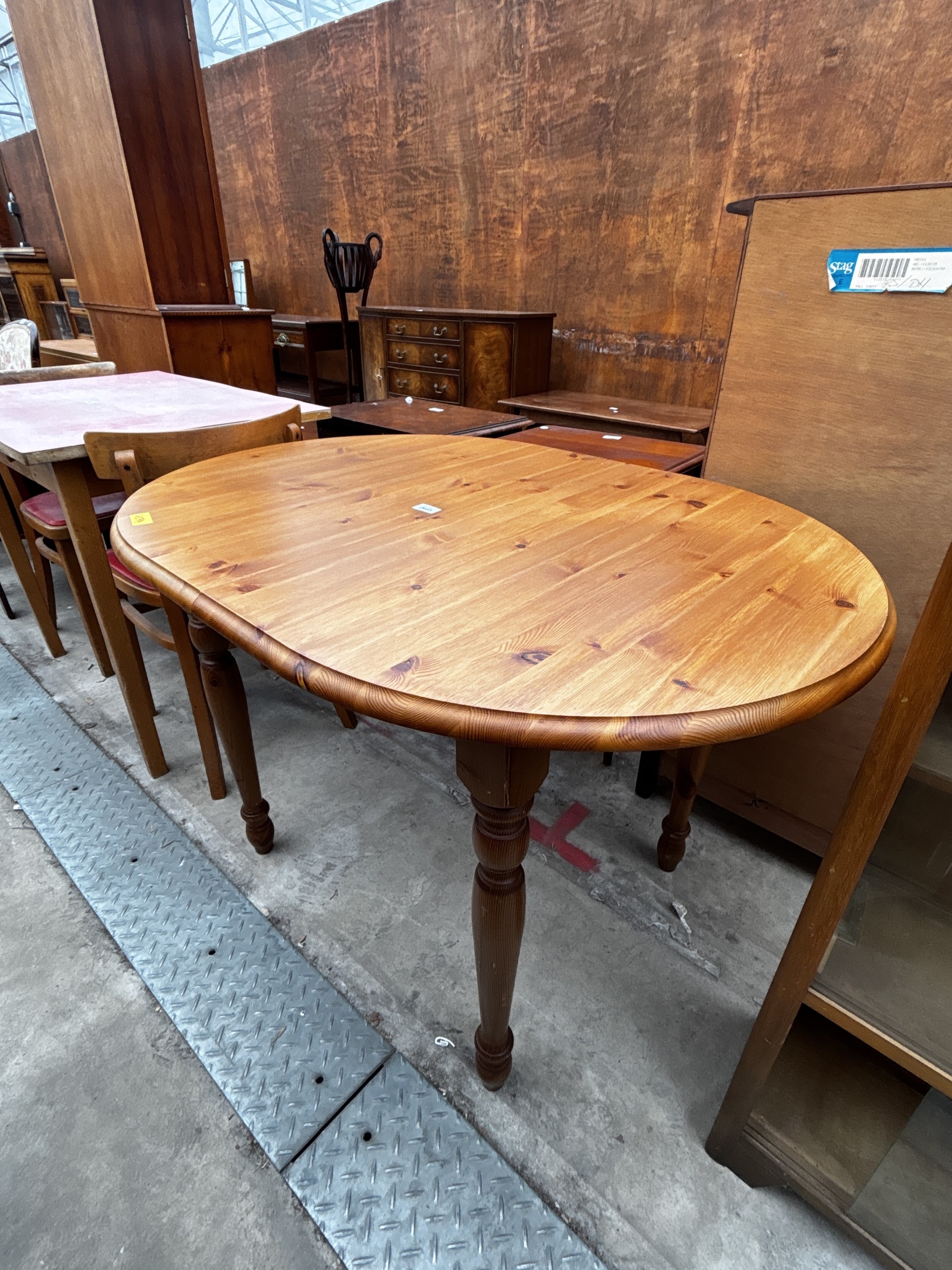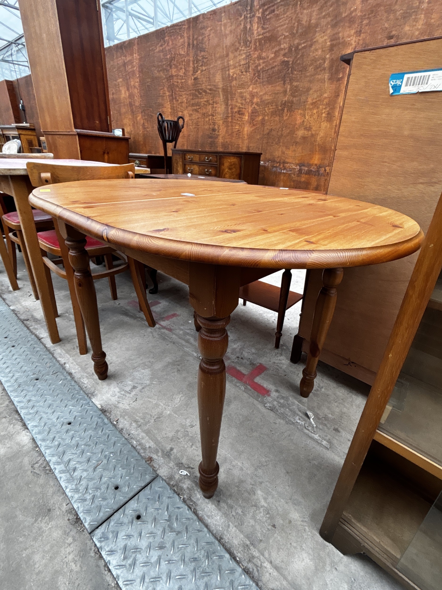 A PINE OVAL EXTENDING KITCHEN TABLE ON TURNED LEGS, 43" X 31" (LEAF 14")