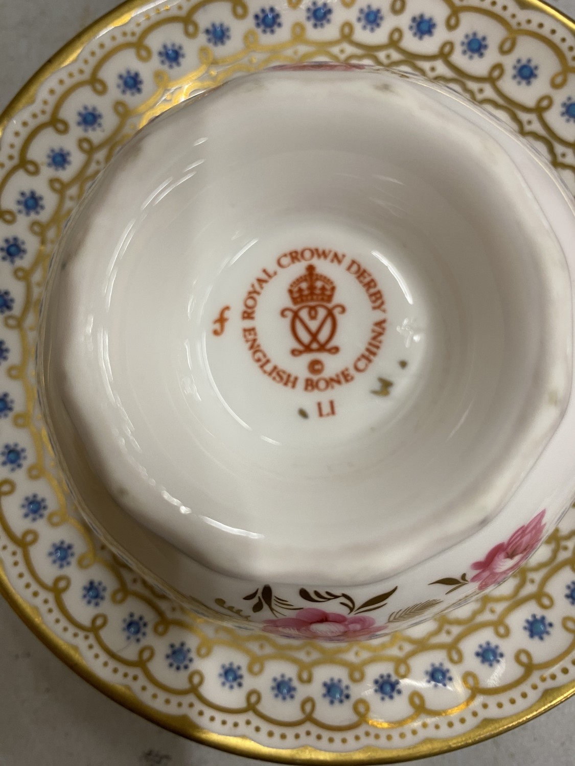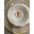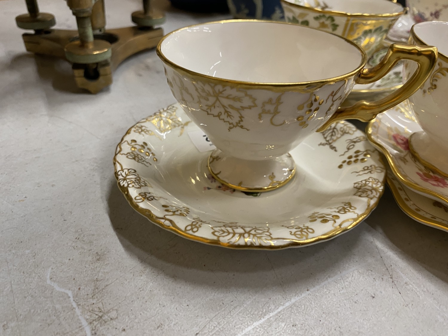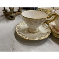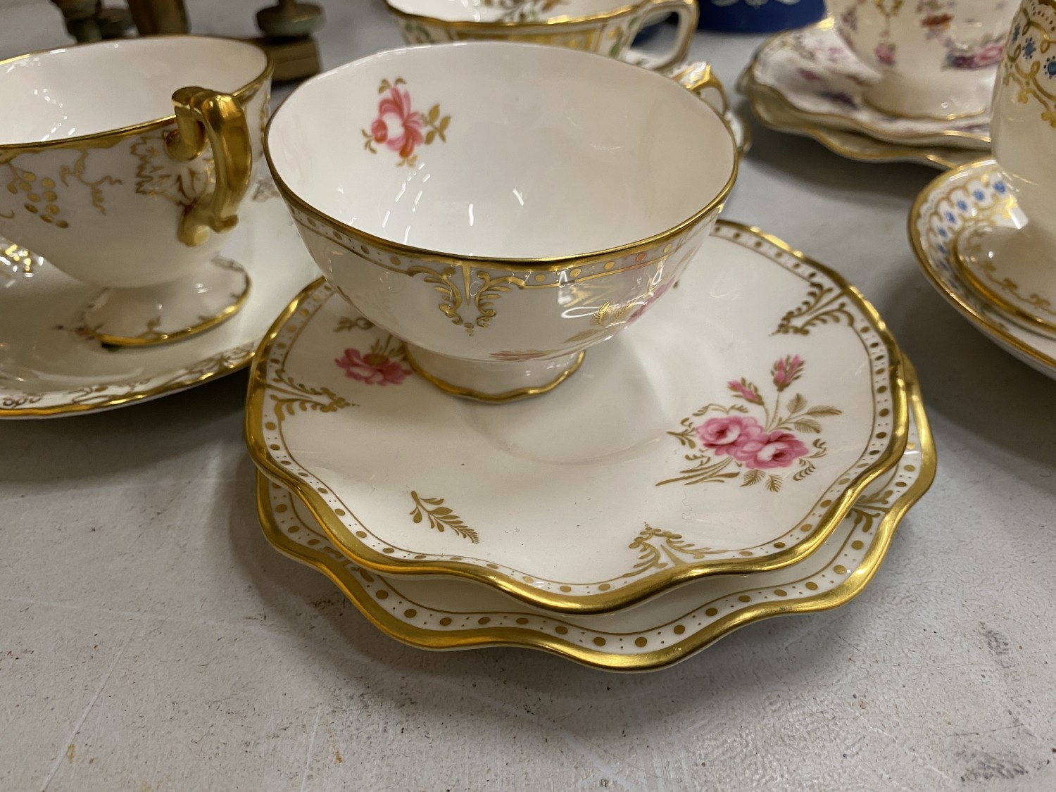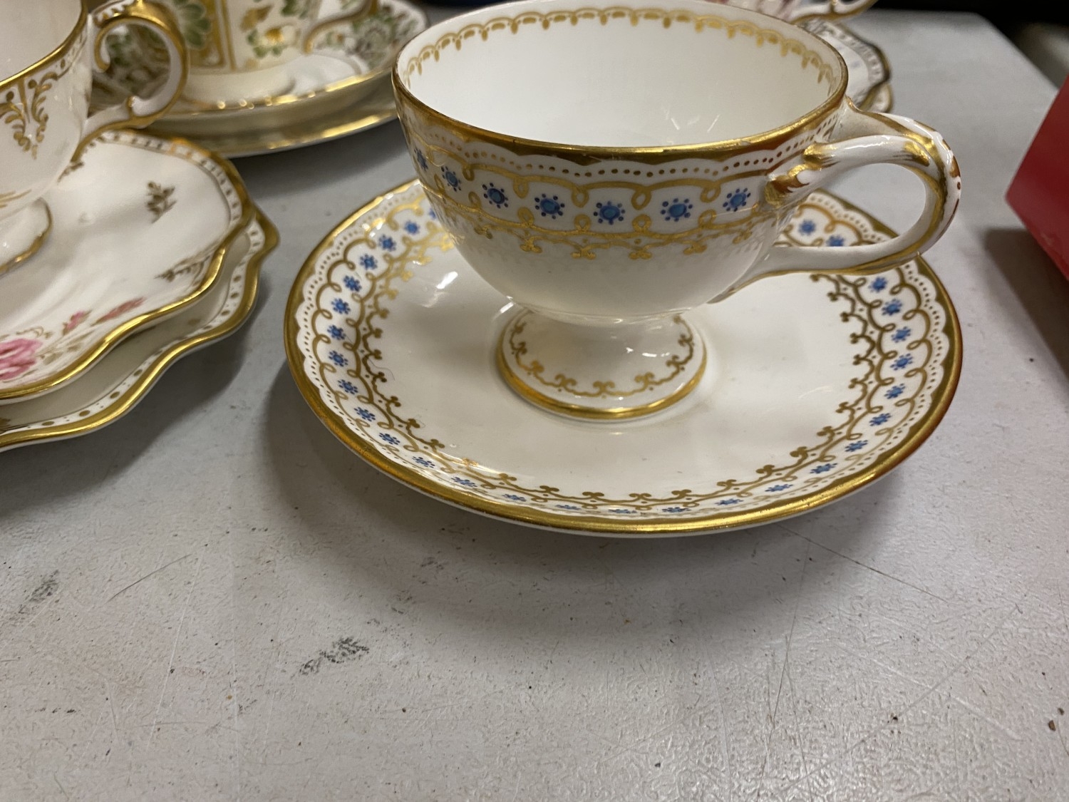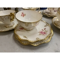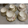 A COLLECTION OF CUPS AND SAUCERS TO INCLUDE, A ROYAL CROWN DERBY 'ROYAL PINXTON ROSES' TRIO, 'ANTOINETTE' TRIO, 'GREEN PANEL' TRIO FEATURING GREEN FLOWERS AND FOLIAGE, ETC