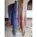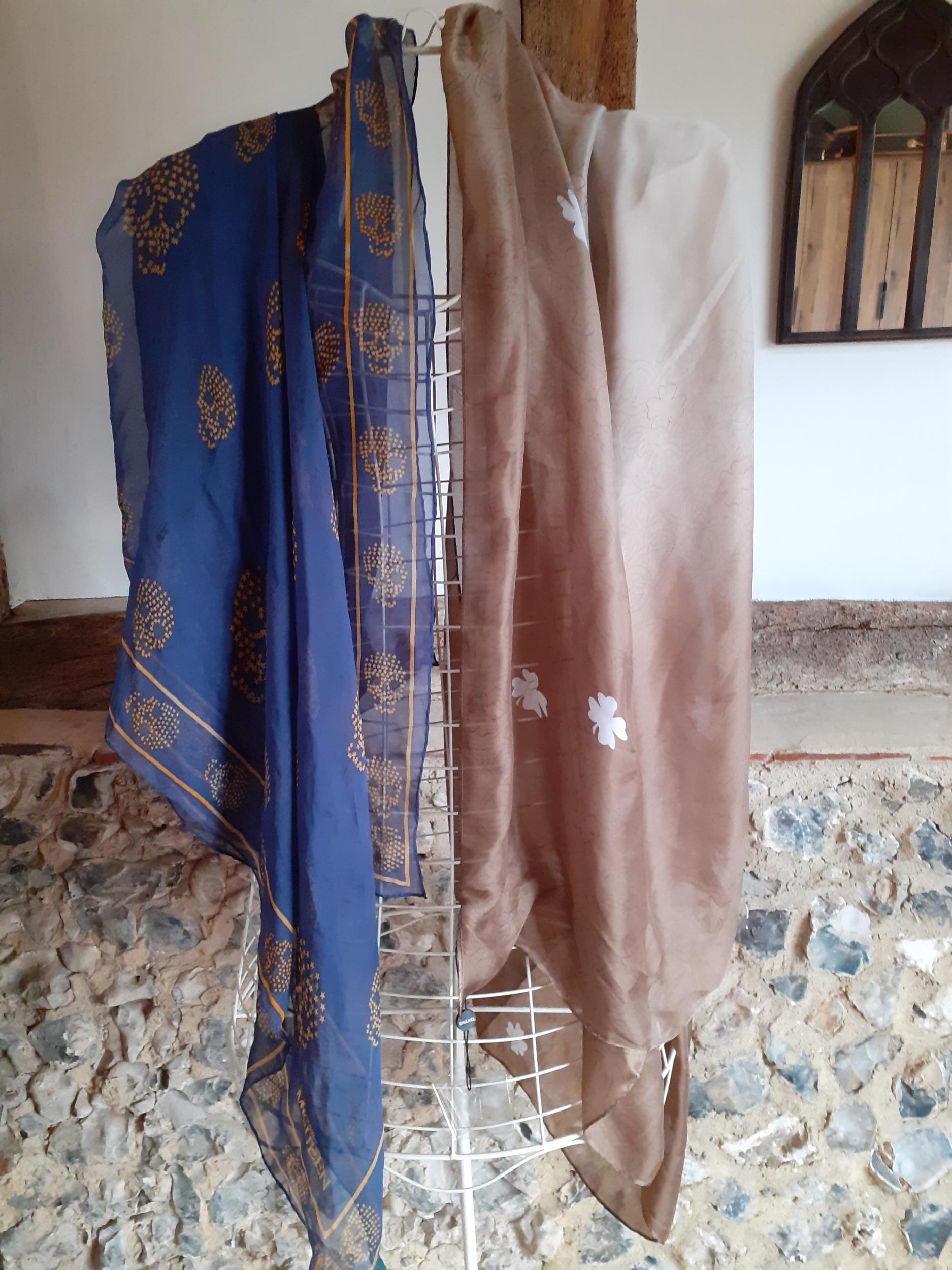 Alexander McQueen-A blue silk shawl having images of skulls and the designer's name together with a cream and brown silk scarf in the style of a French fashion house