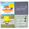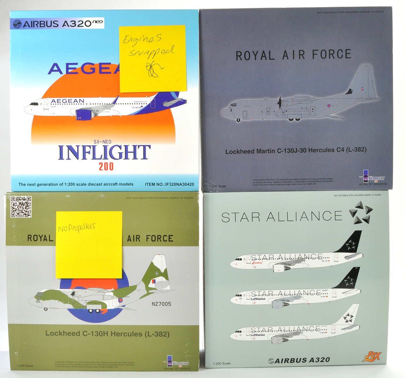 Four boxed diecast Model Aircraft comprising various issues including RAF Hercules. Some damage including no propellers and engines broken a couple, otherwise assumed, (but with no guarantee) generally excellent ex-shop / Factory return. Further images can be provided if necessary.