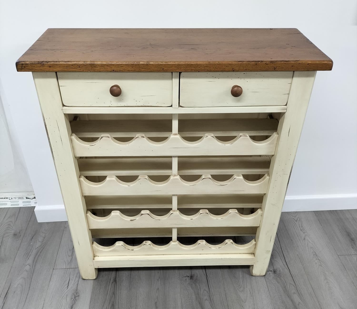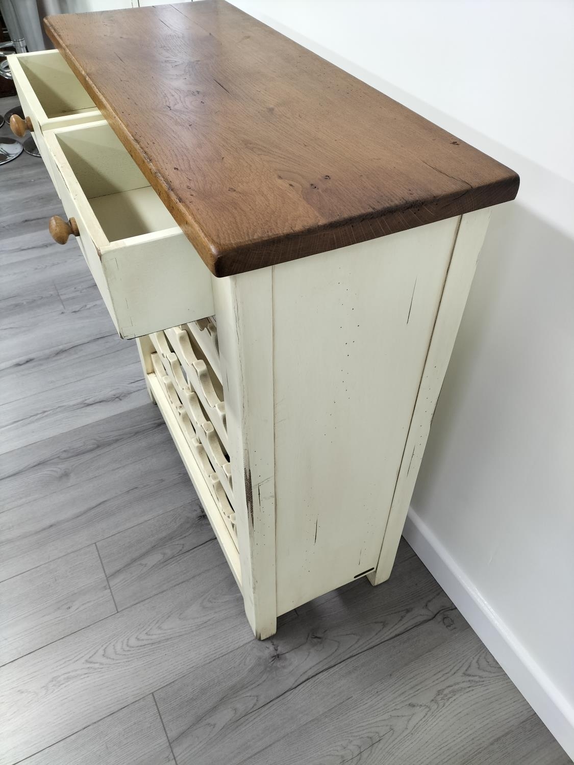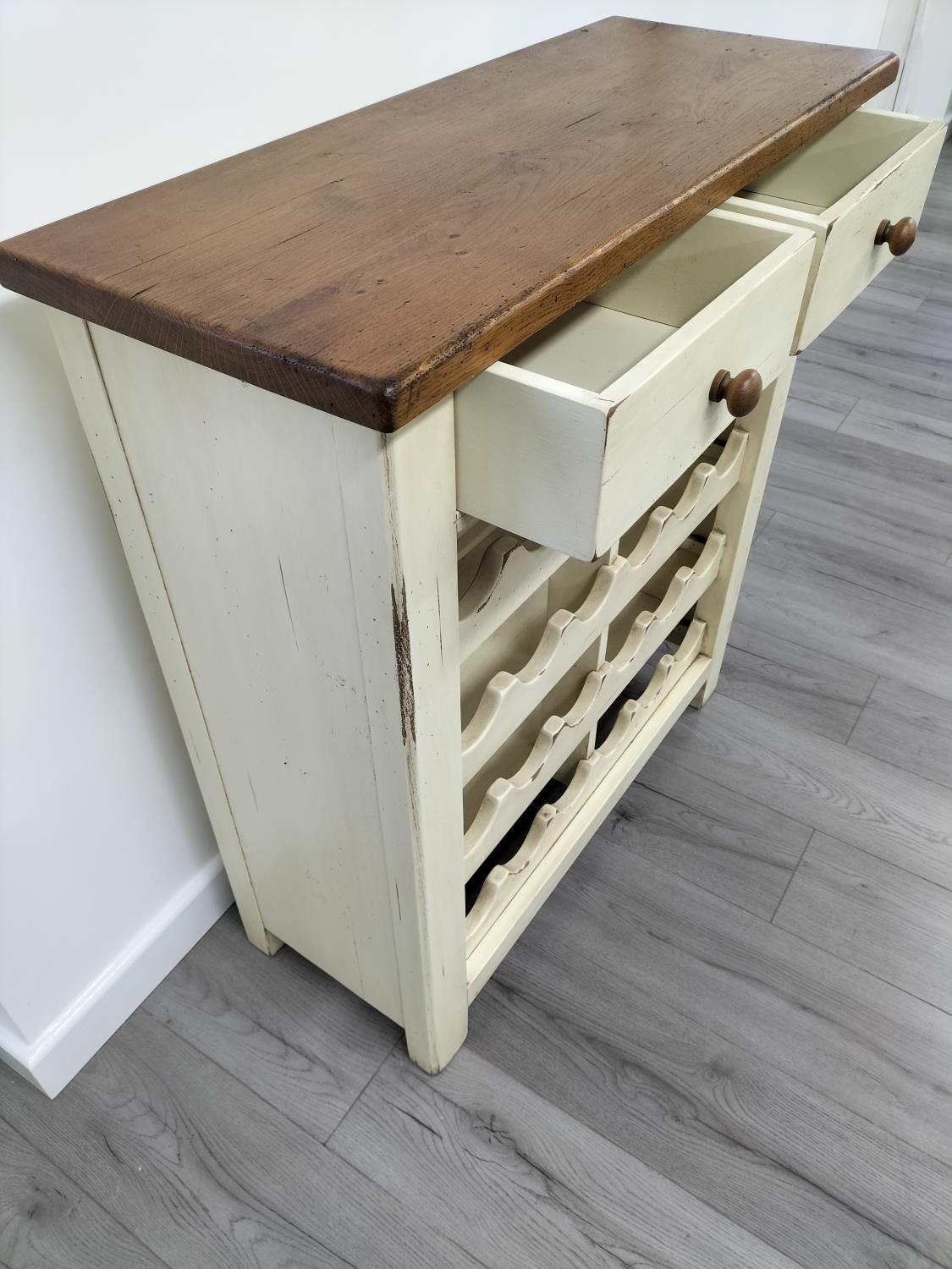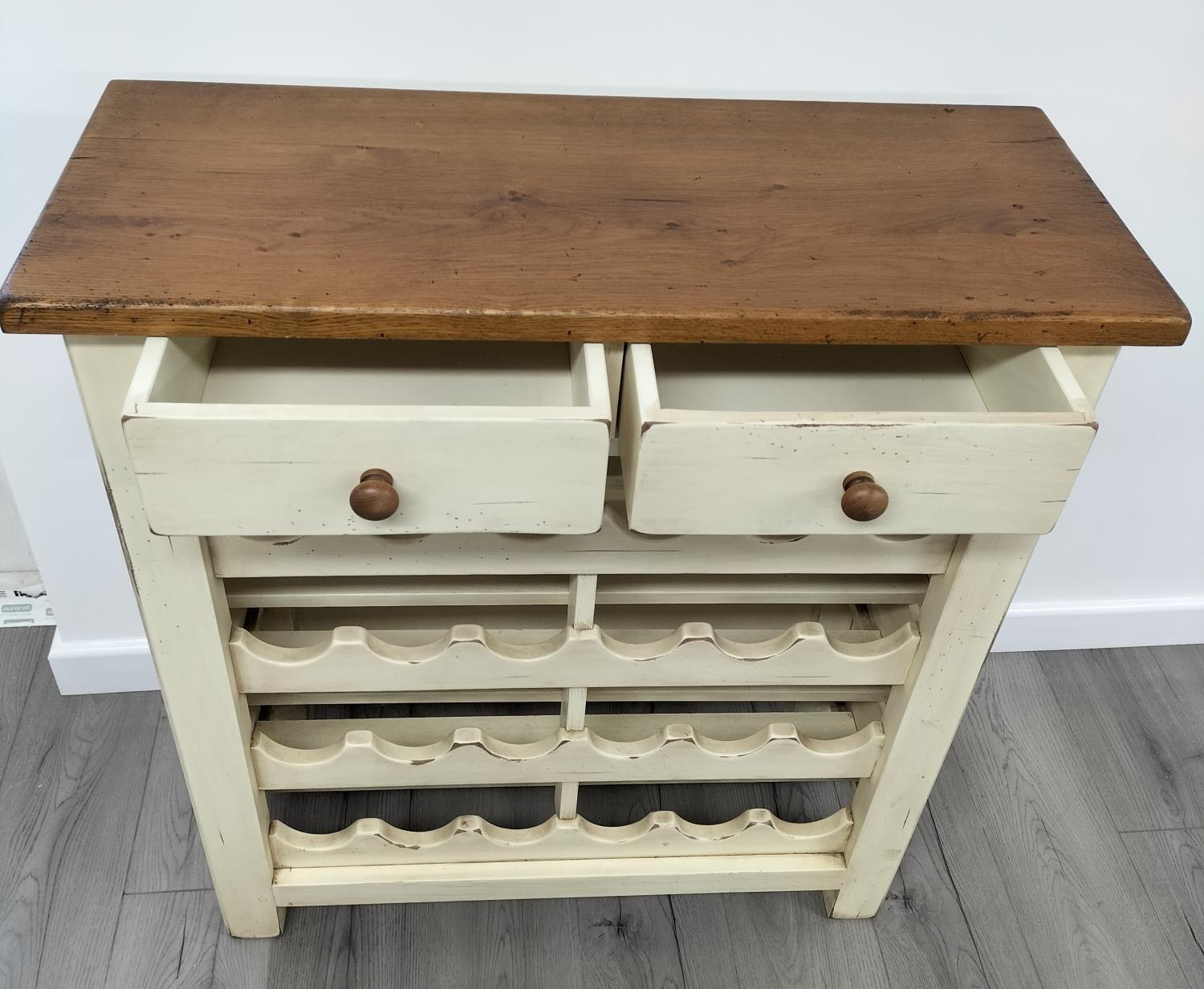 Farmhouse Style Oak Wine Rack Unit with 2 Upper Drawers. 100cm high, 90cm x 36cm. Collection Only.