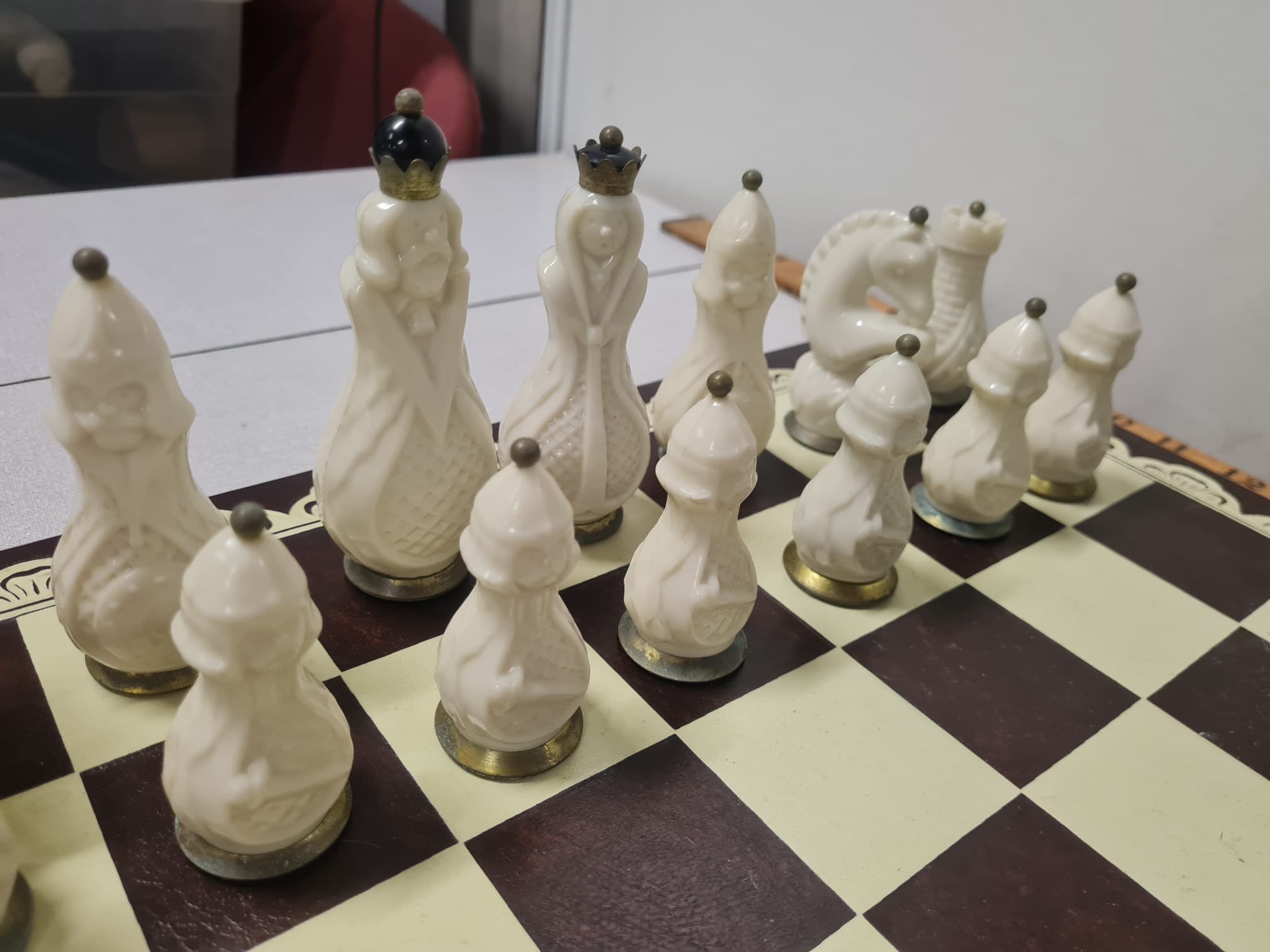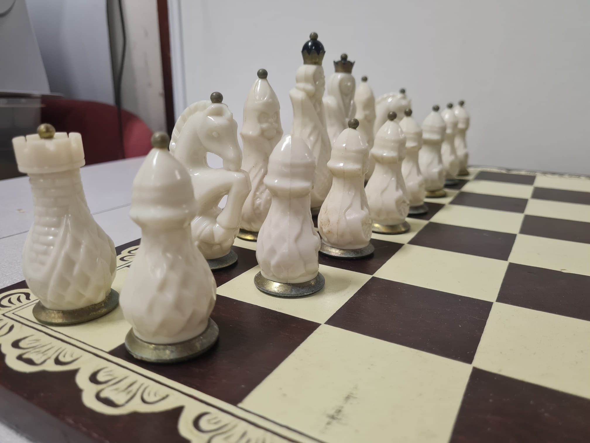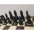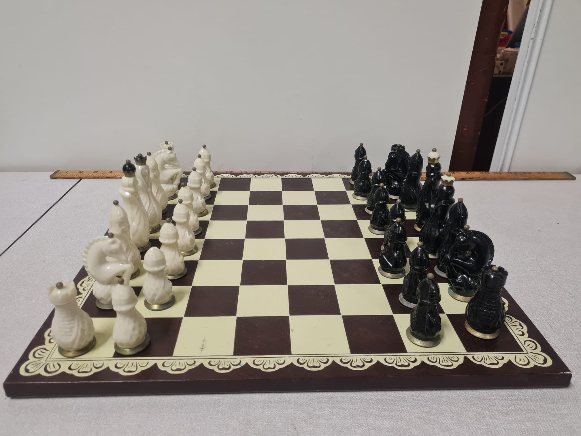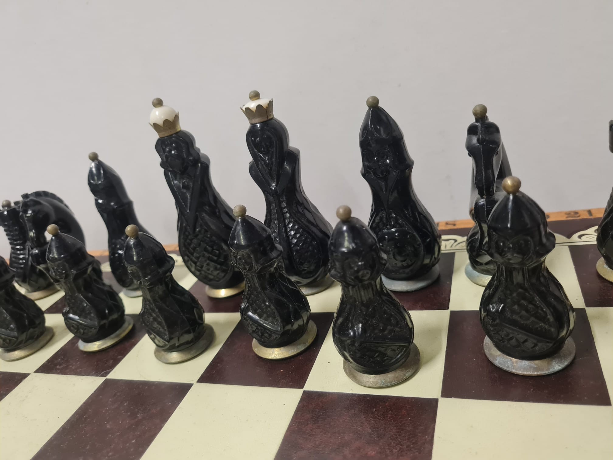 Vintage Soviet carbolite/bakelite black & white chess set USSR to include board.