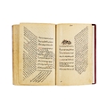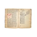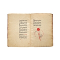 The text is composed in a diagonal and marginal layout, with explanatory glosses surrounding the main body of script. Illuminated headings in red script mark important sections and transitions. Bound in a red leather.