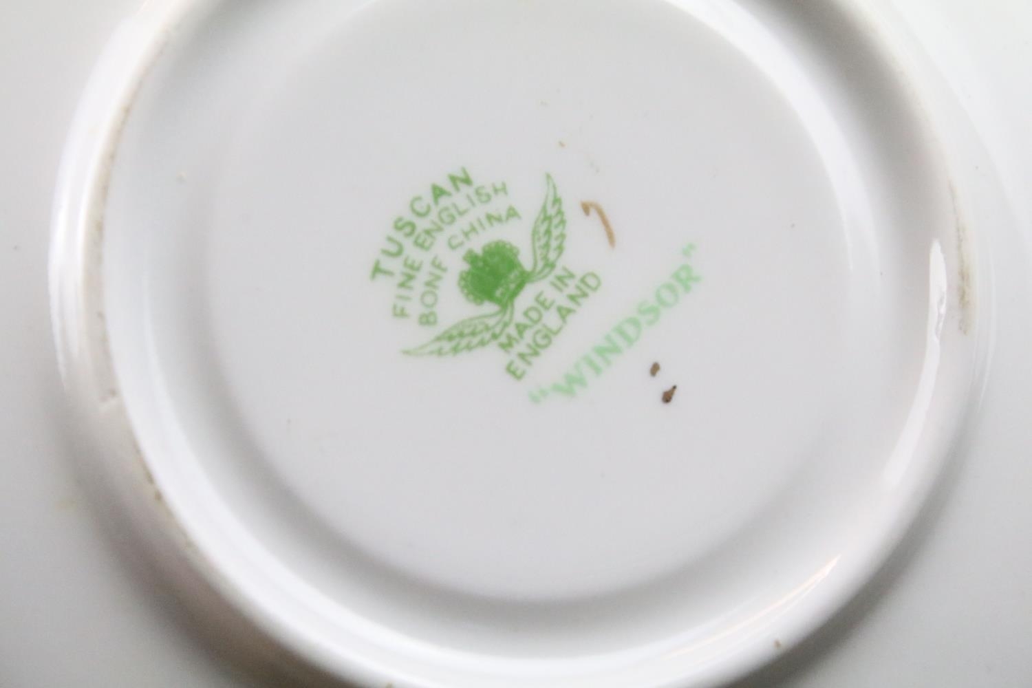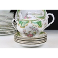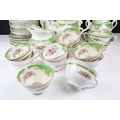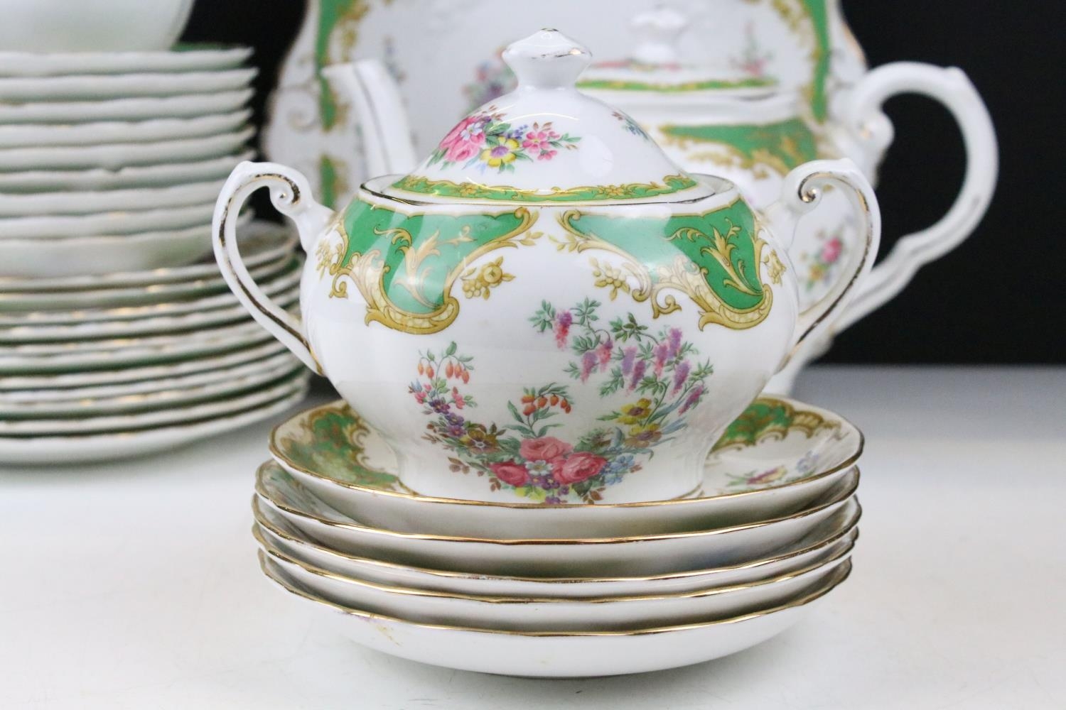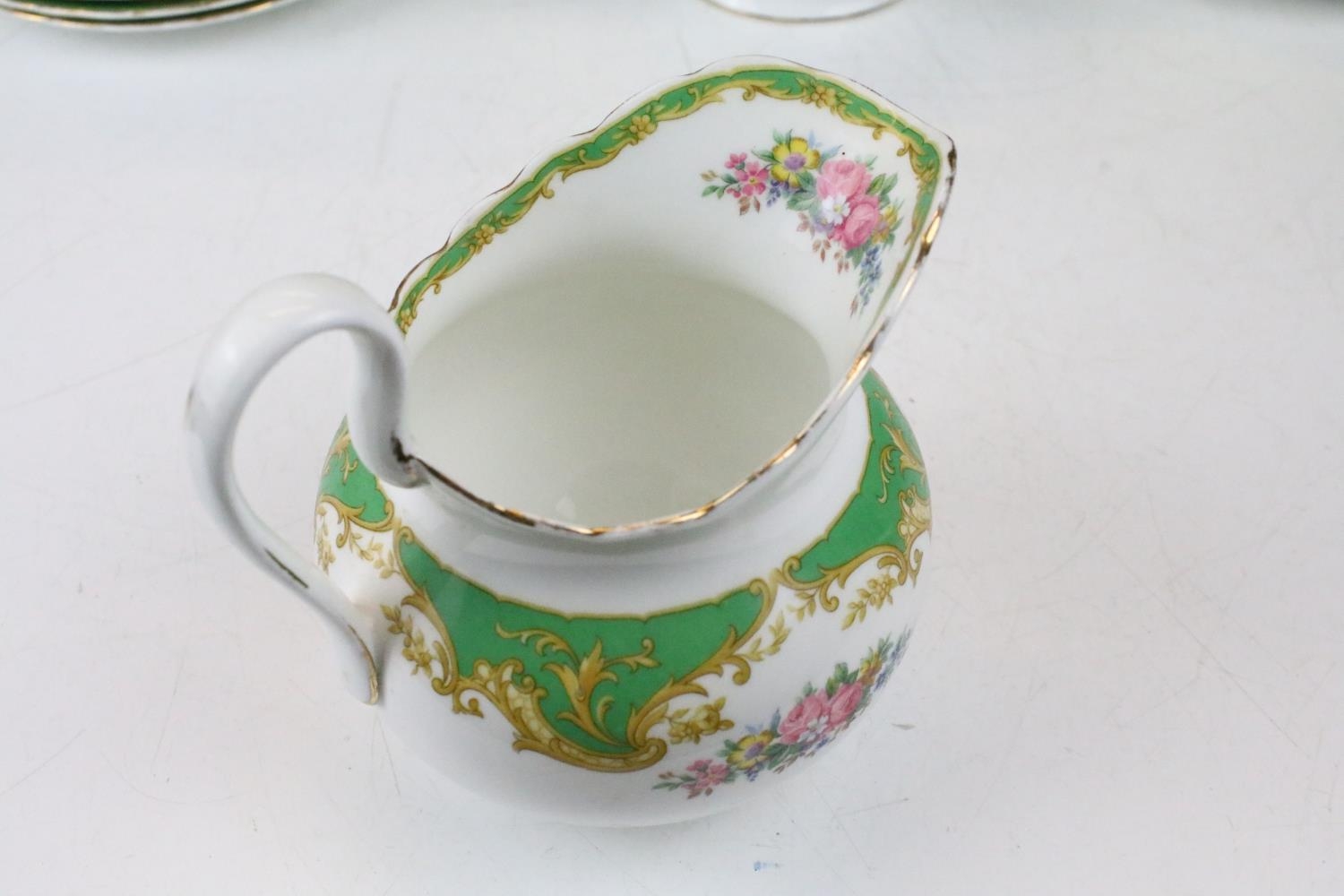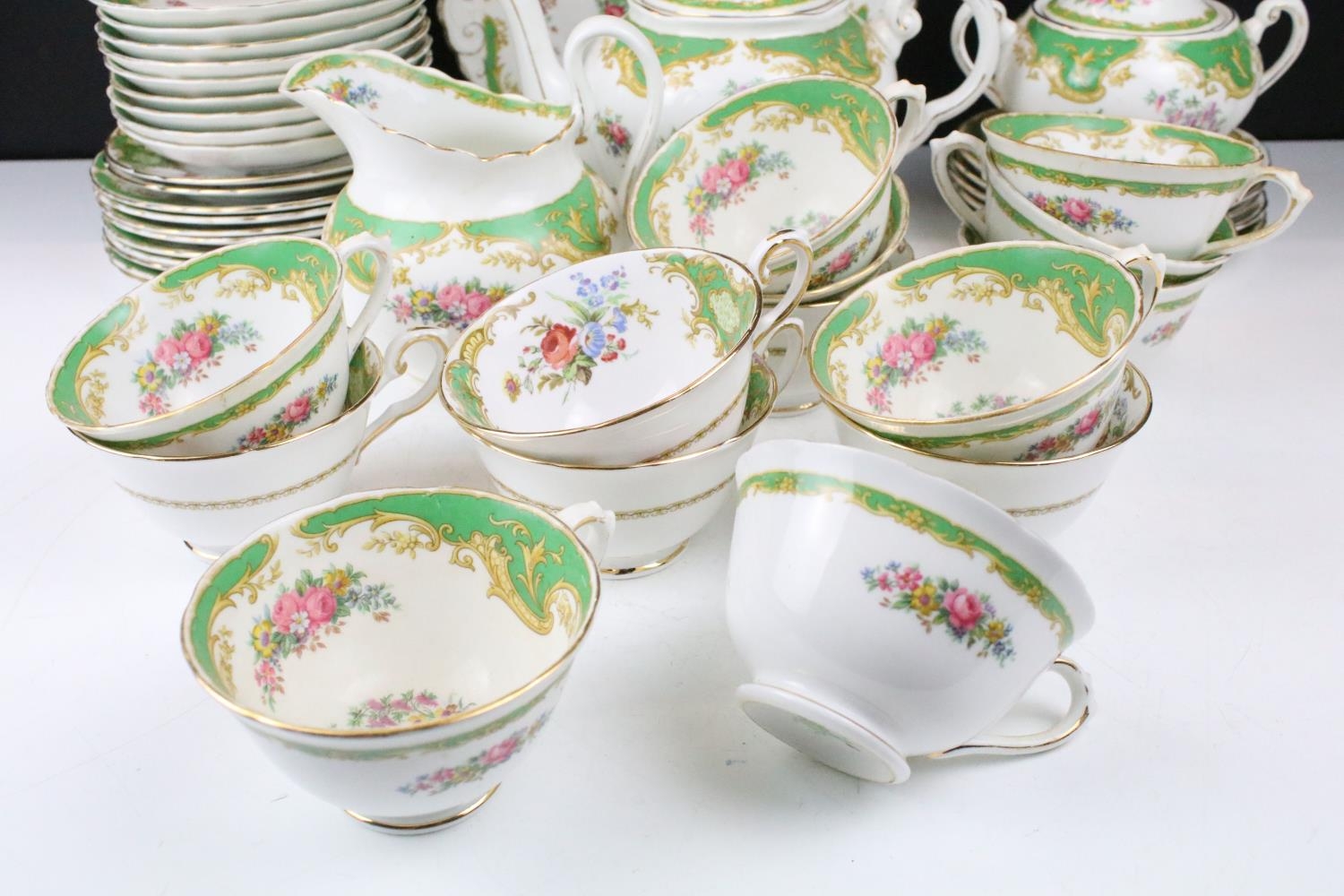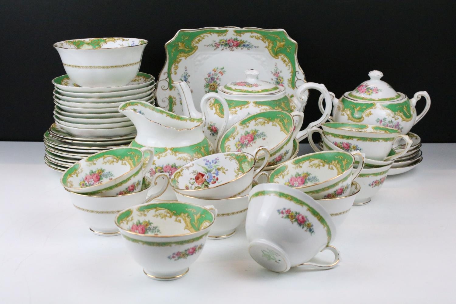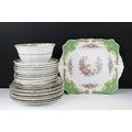 Tuscan green ground floral tea ware to include 'Naples' and 'Windsor' pattern, featuring tea pot, sugar basin, cups & saucers, tea plates, etc