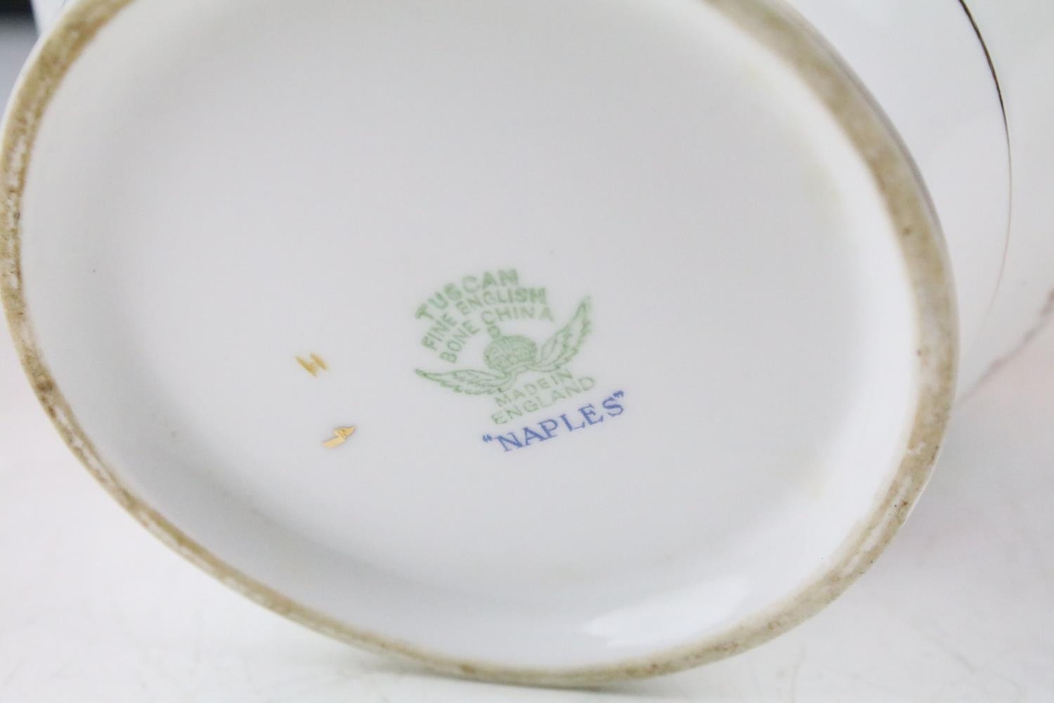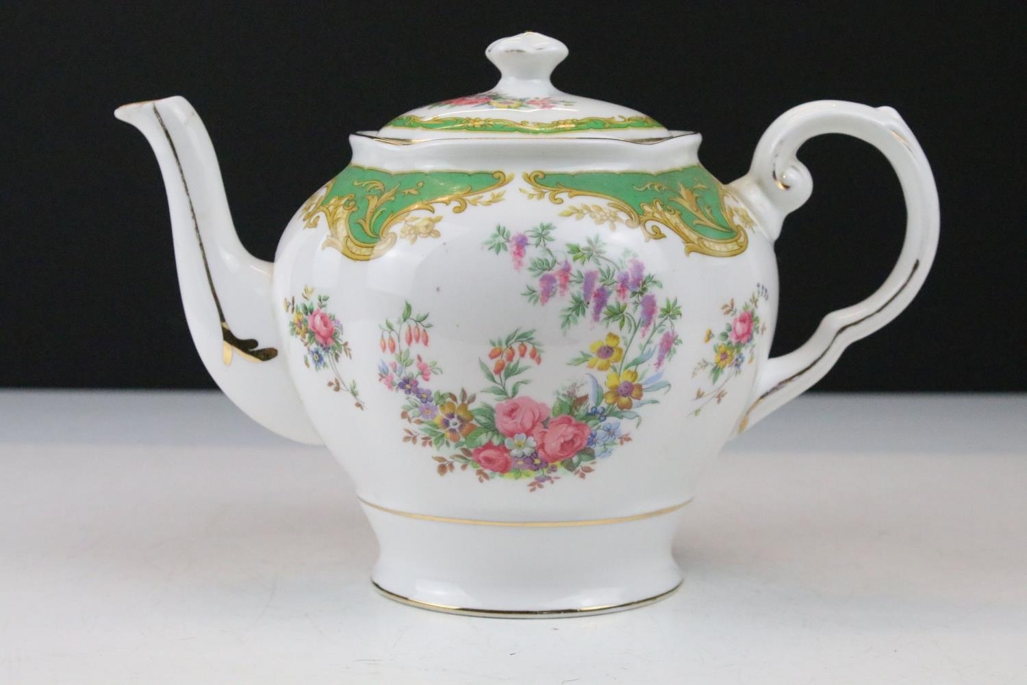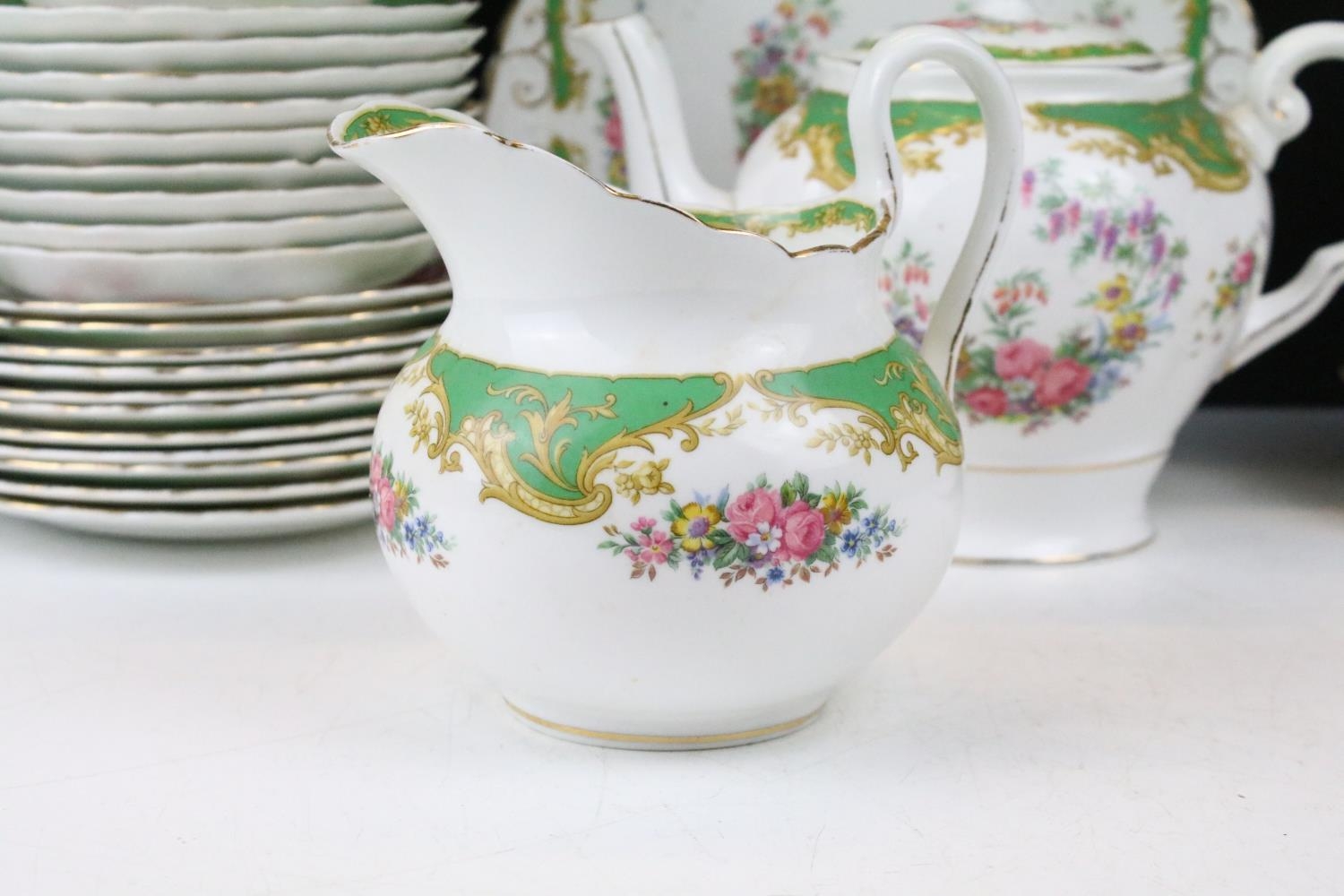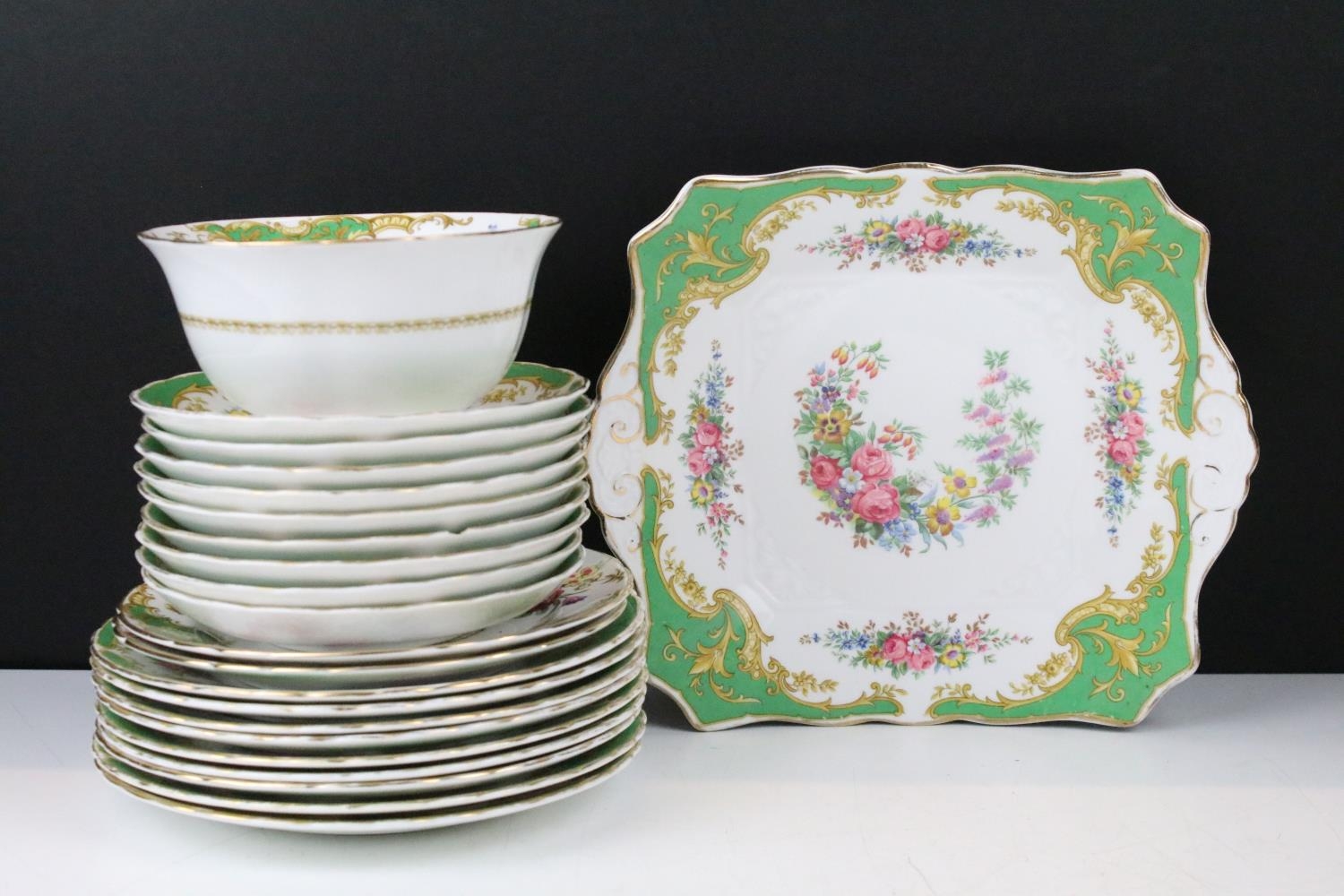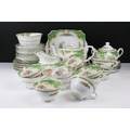 Tuscan green ground floral tea ware to include 'Naples' and 'Windsor' pattern, featuring tea pot, sugar basin, cups & saucers, tea plates, etc