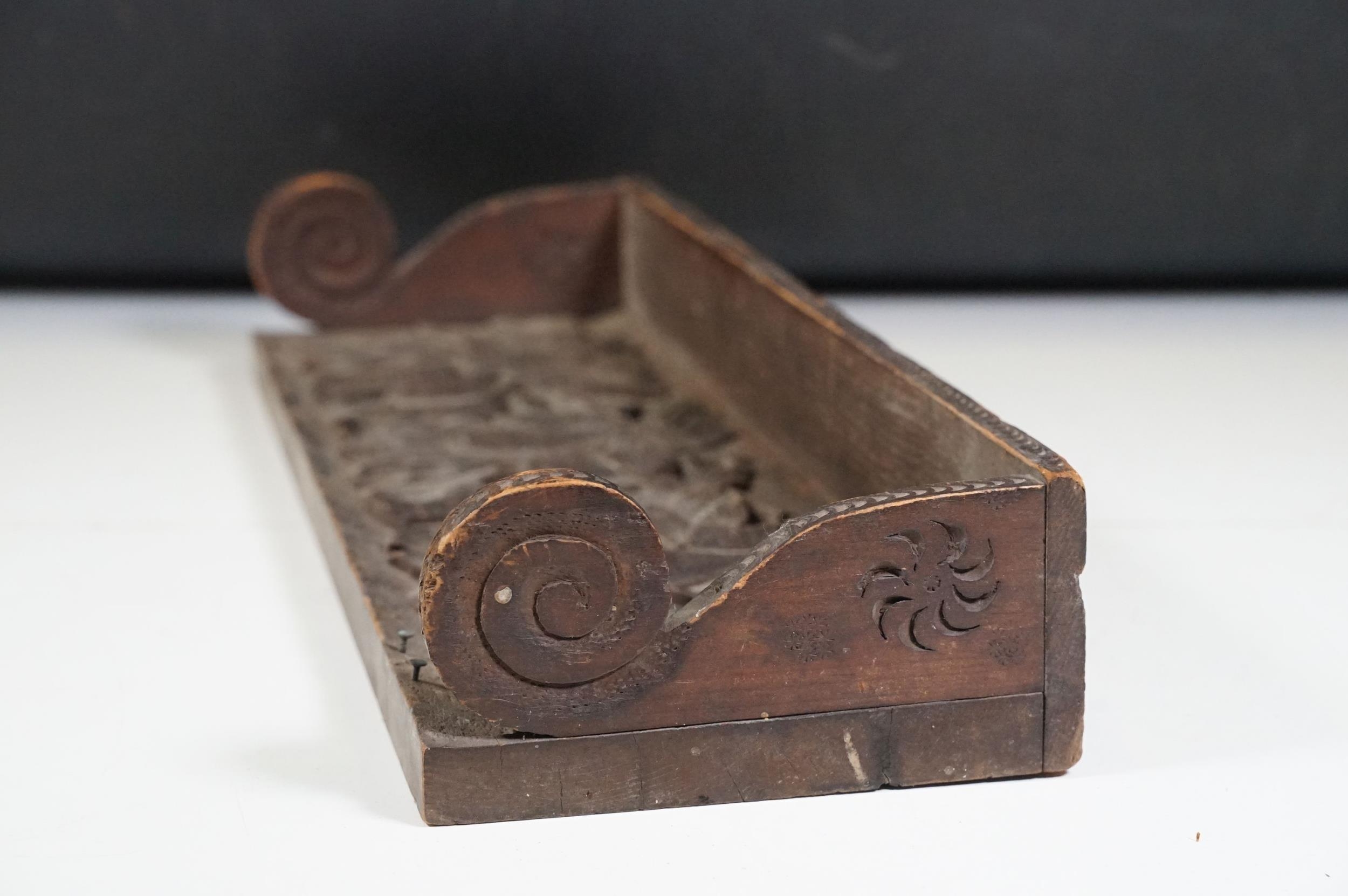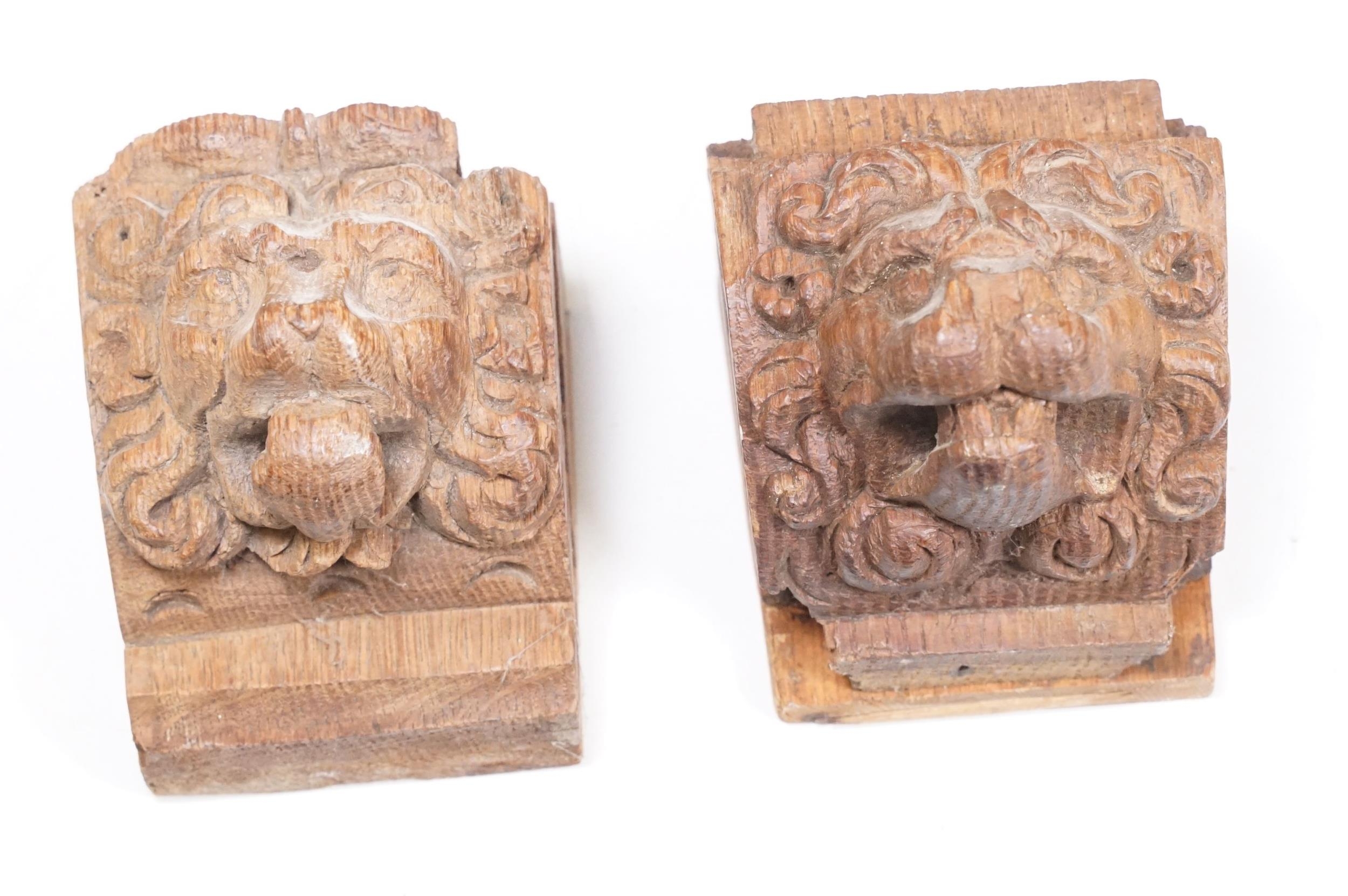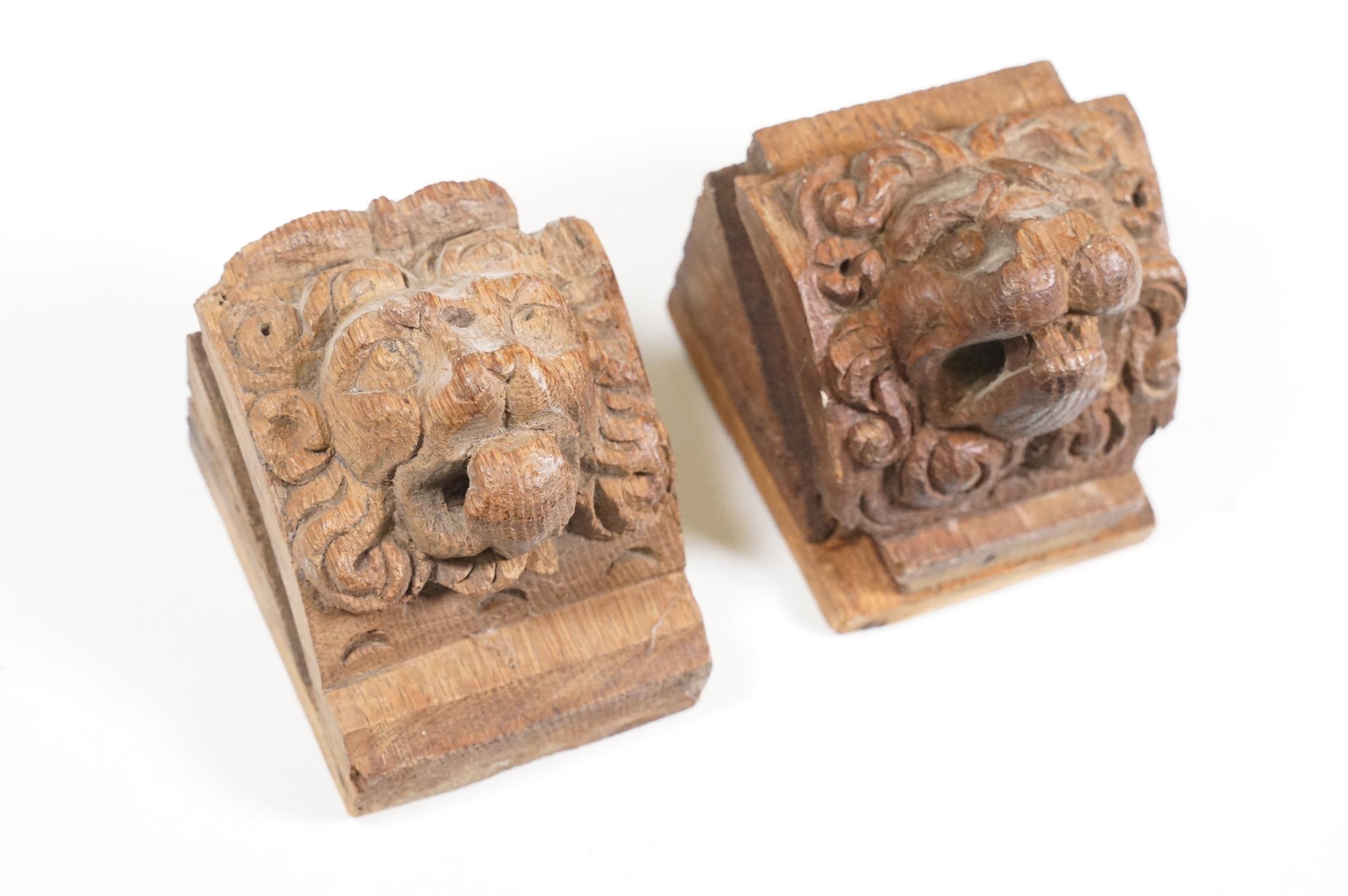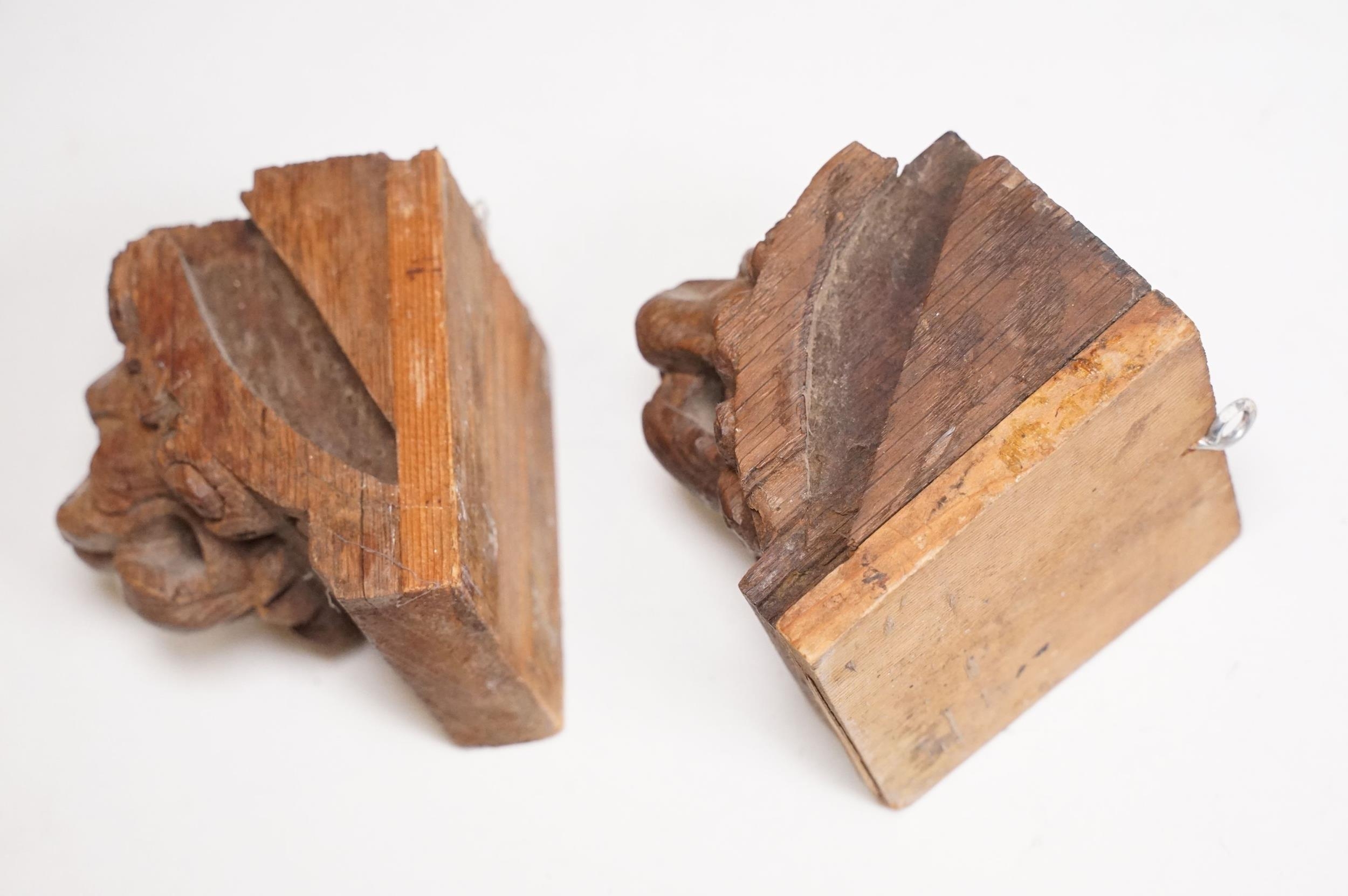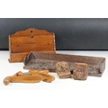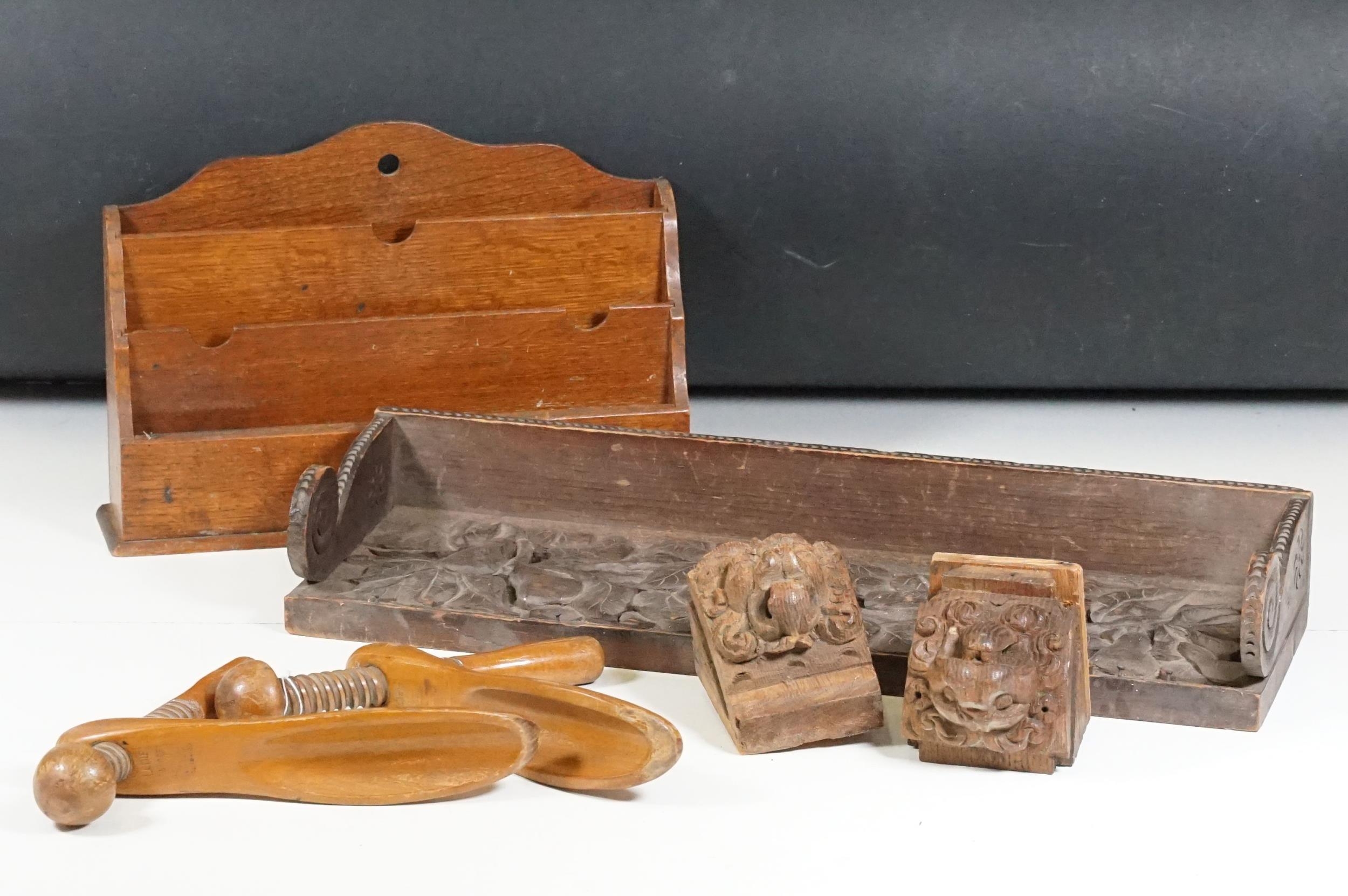 Collection of treen items to include Early 20th Century Edwardian letter rack, pair of carved lion head masks, carved mahogany display panel with leaf decoration and pair of ladies shoe lasts