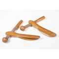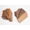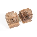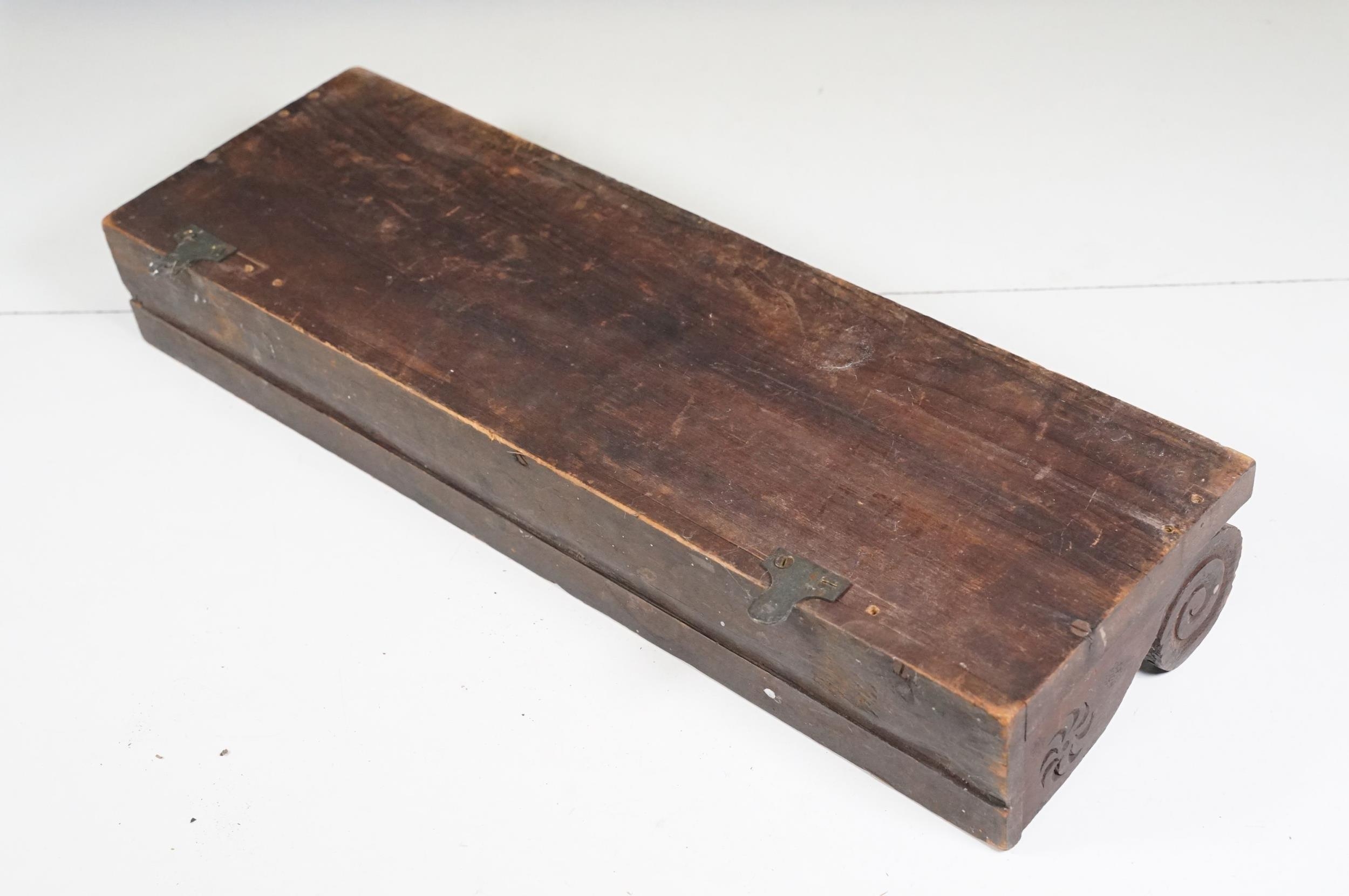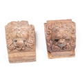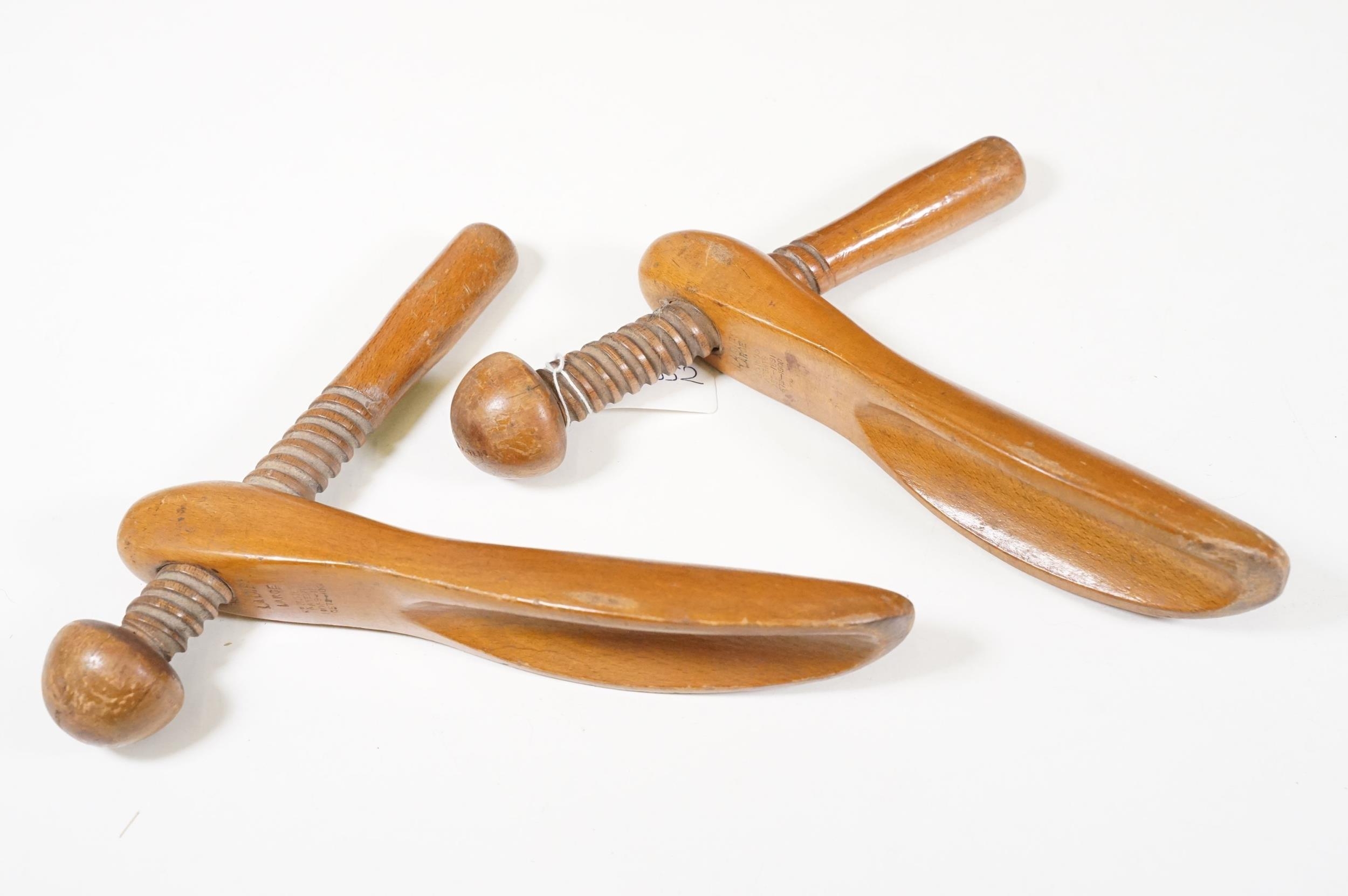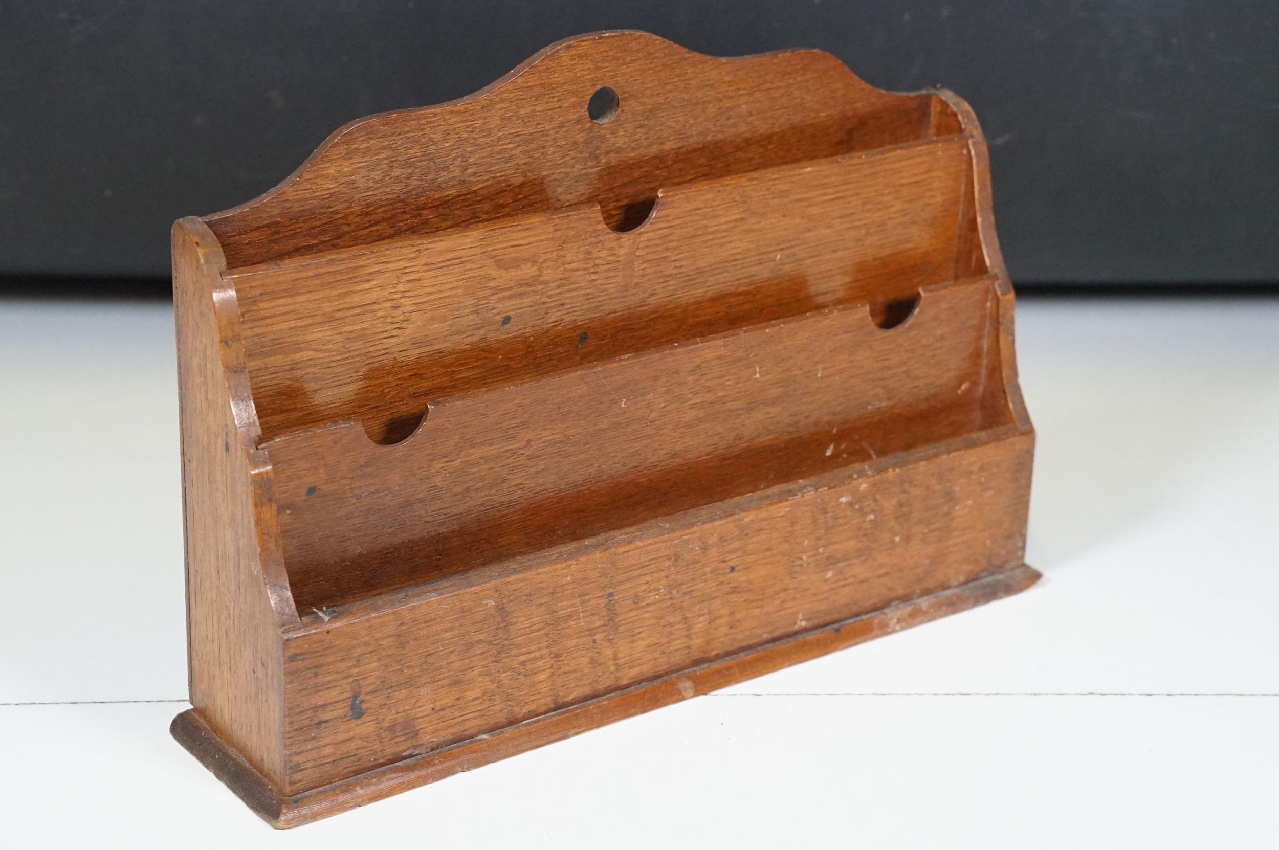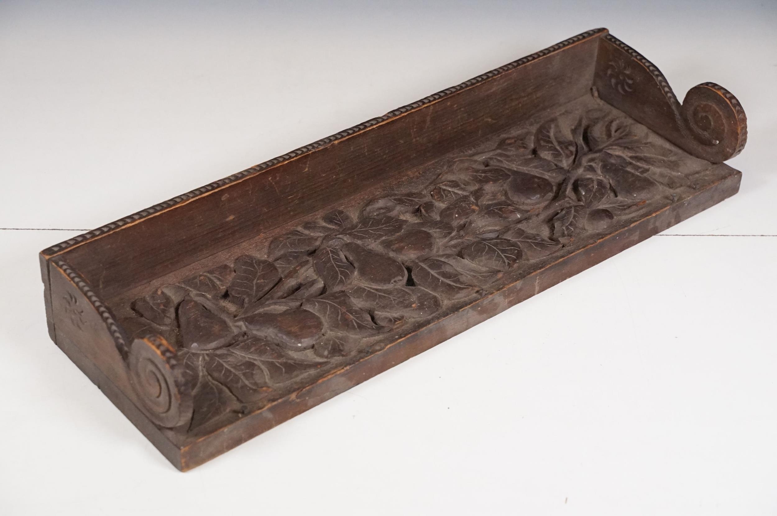Collection of treen items to include Early 20th Century Edwardian letter rack, pair of carved lion head masks, carved mahogany display panel with leaf decoration and pair of ladies shoe lasts