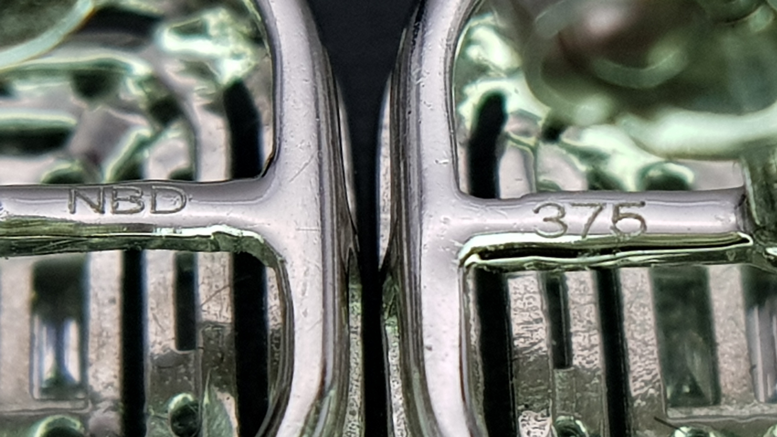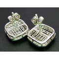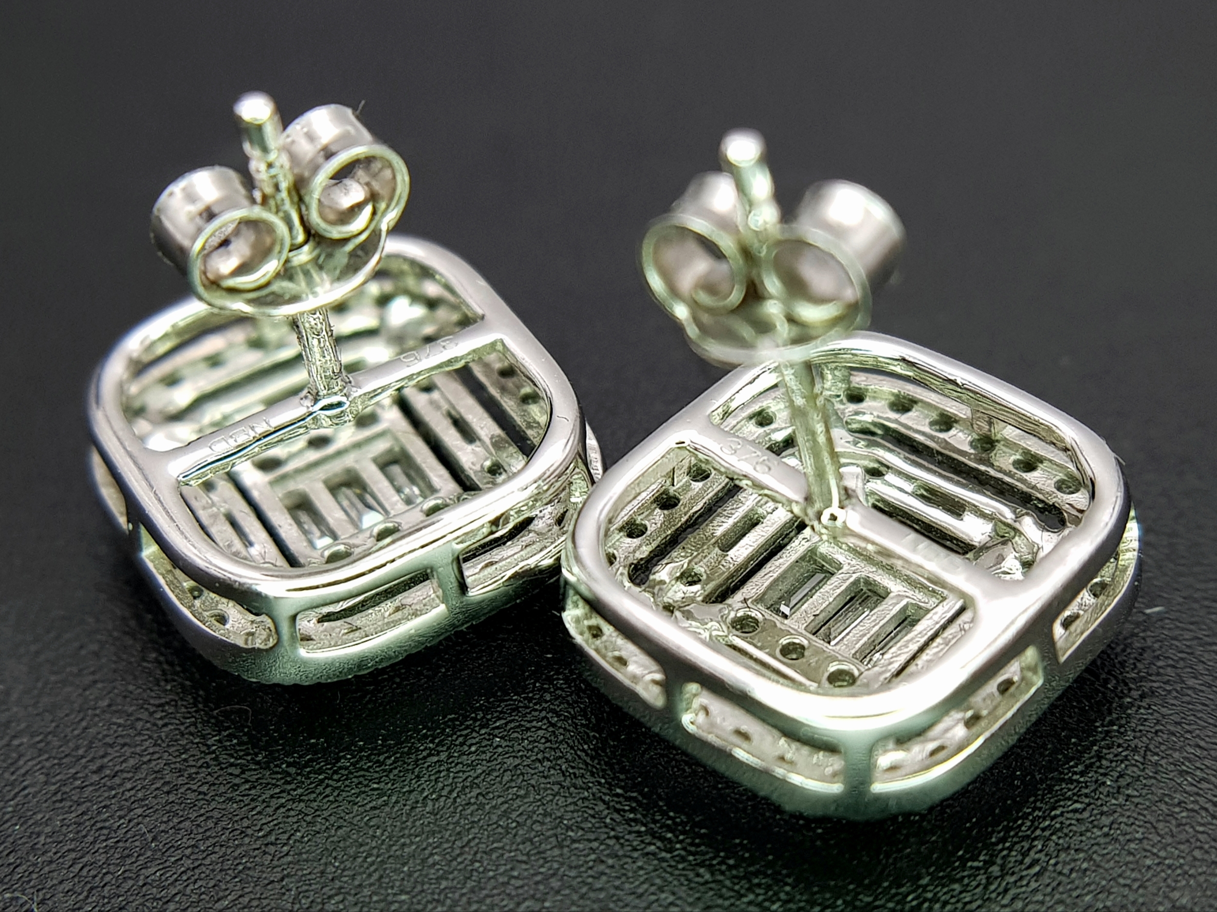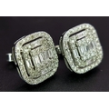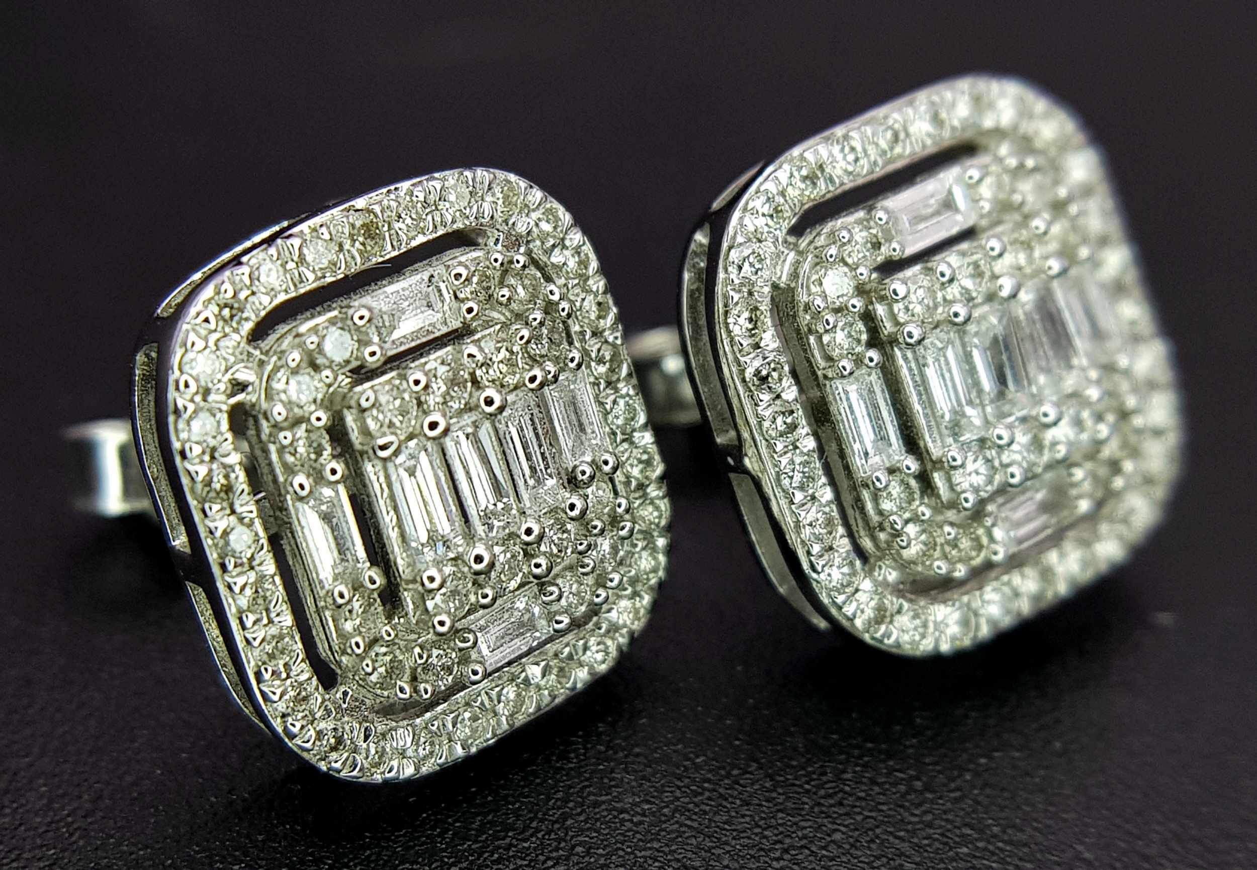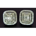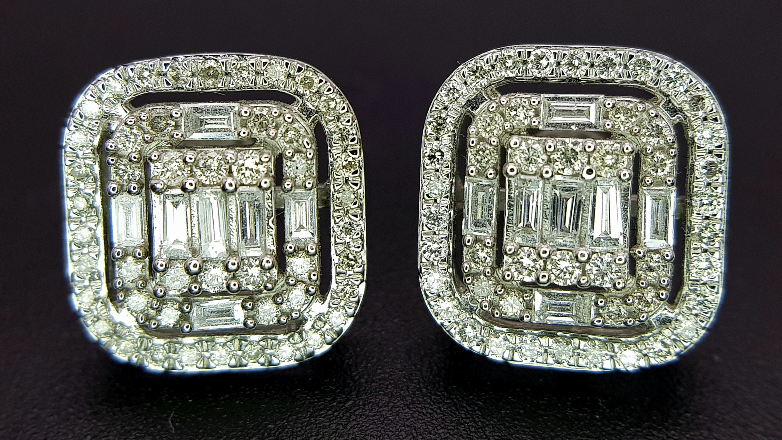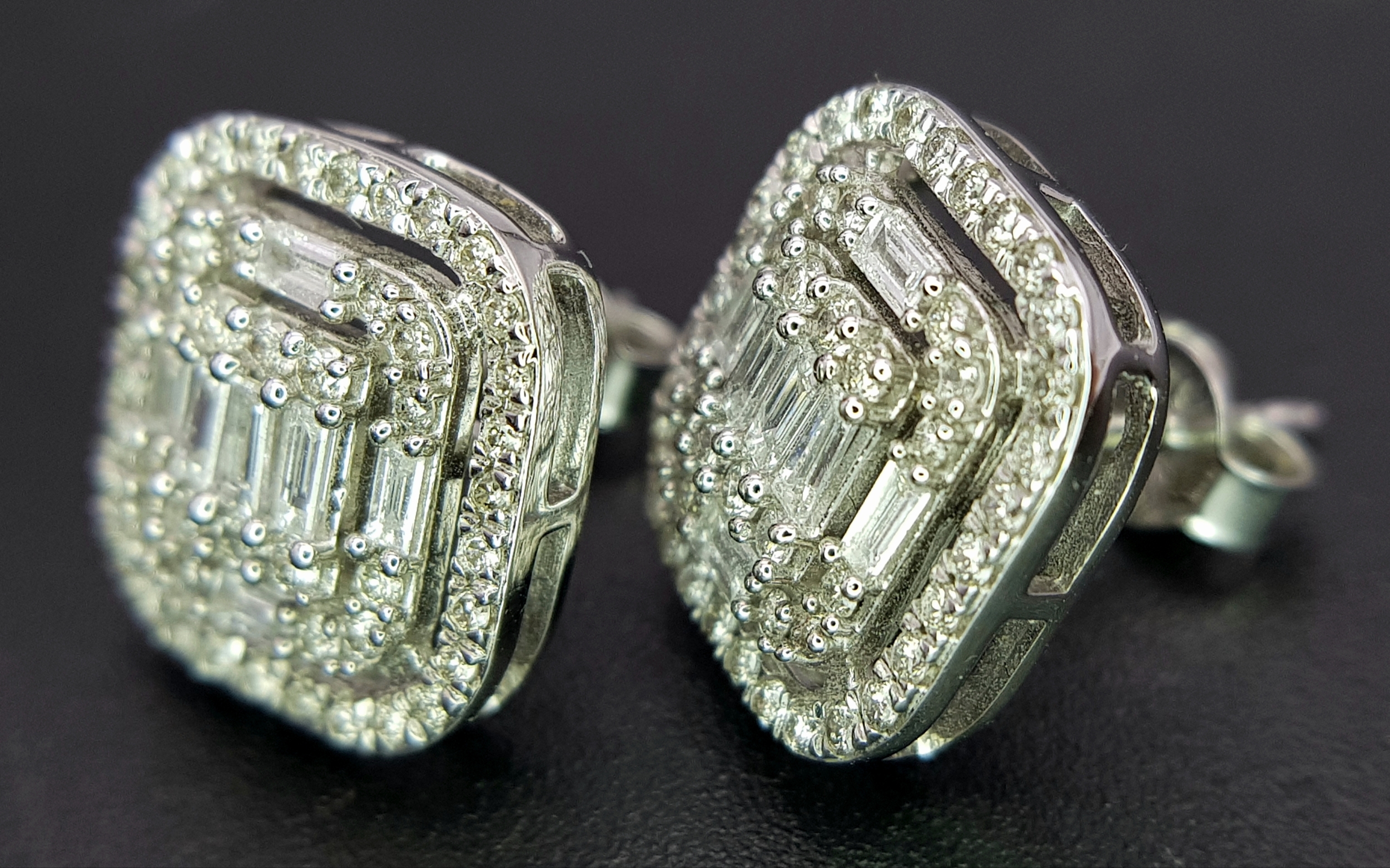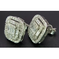 A Pair of 9K White Gold Diamond Dress Earrings. c2ctw of round and baguette cut diamonds. Square stud form - 14 x 13mm. 3.6g total weight. R-284/77008.