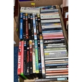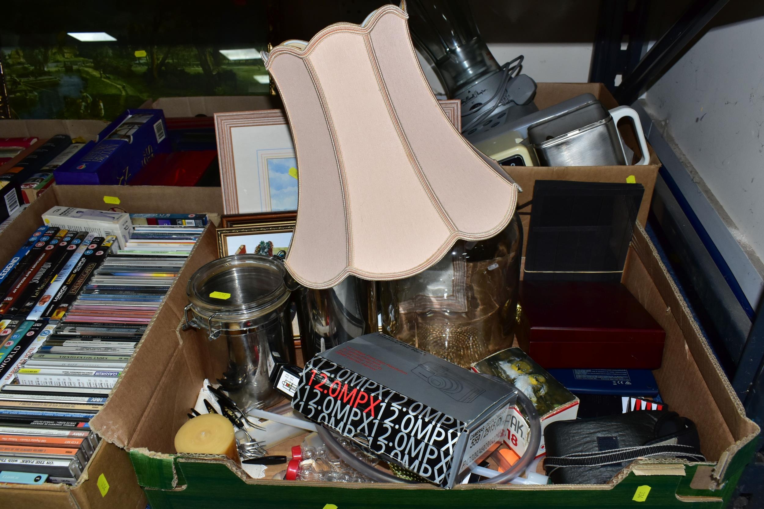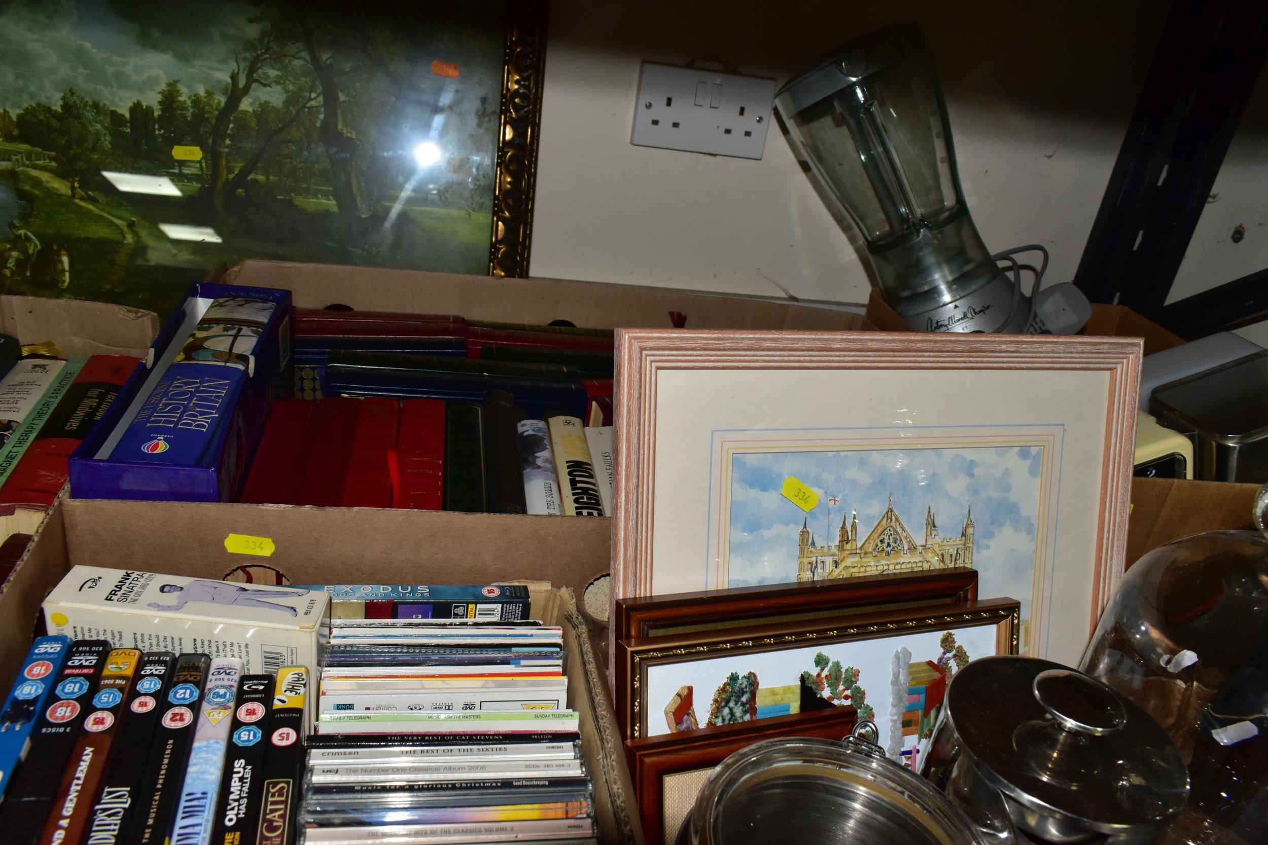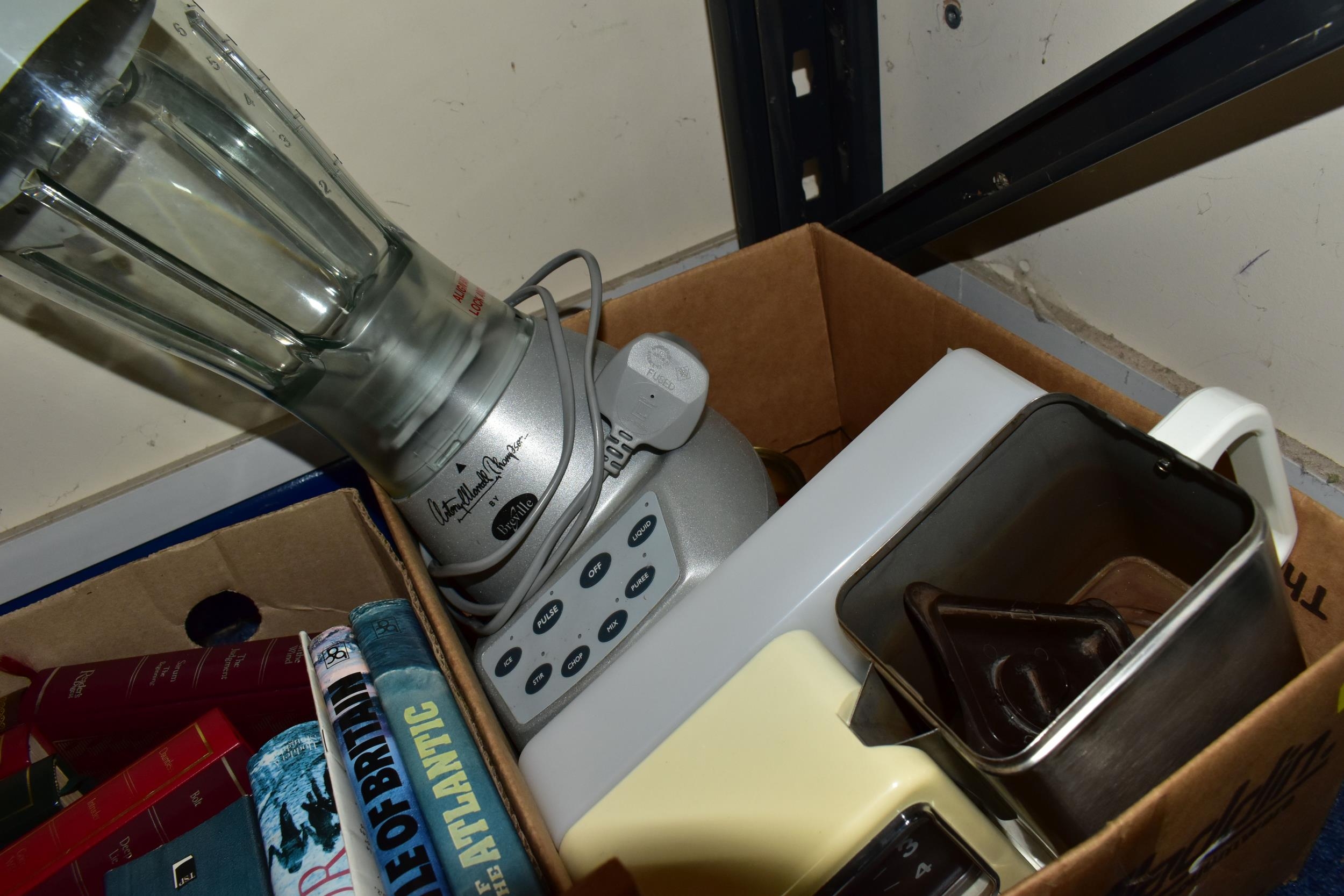FIVE BOXES OF BOOKS, CDS, DVDS AND KITCHEN EQUIPMENT, to include a Russell Hobbs 'Chelsea Teamaker', a Breville 'Anthony Worrell-Thompson' liquidizer, a Minolta Riva Zoom 90C camera, a boxed Olympus Trip 35 camera, approximately thirty assorted books, 1990s CDs and DVDs, etc. (s.d) (5 boxes)