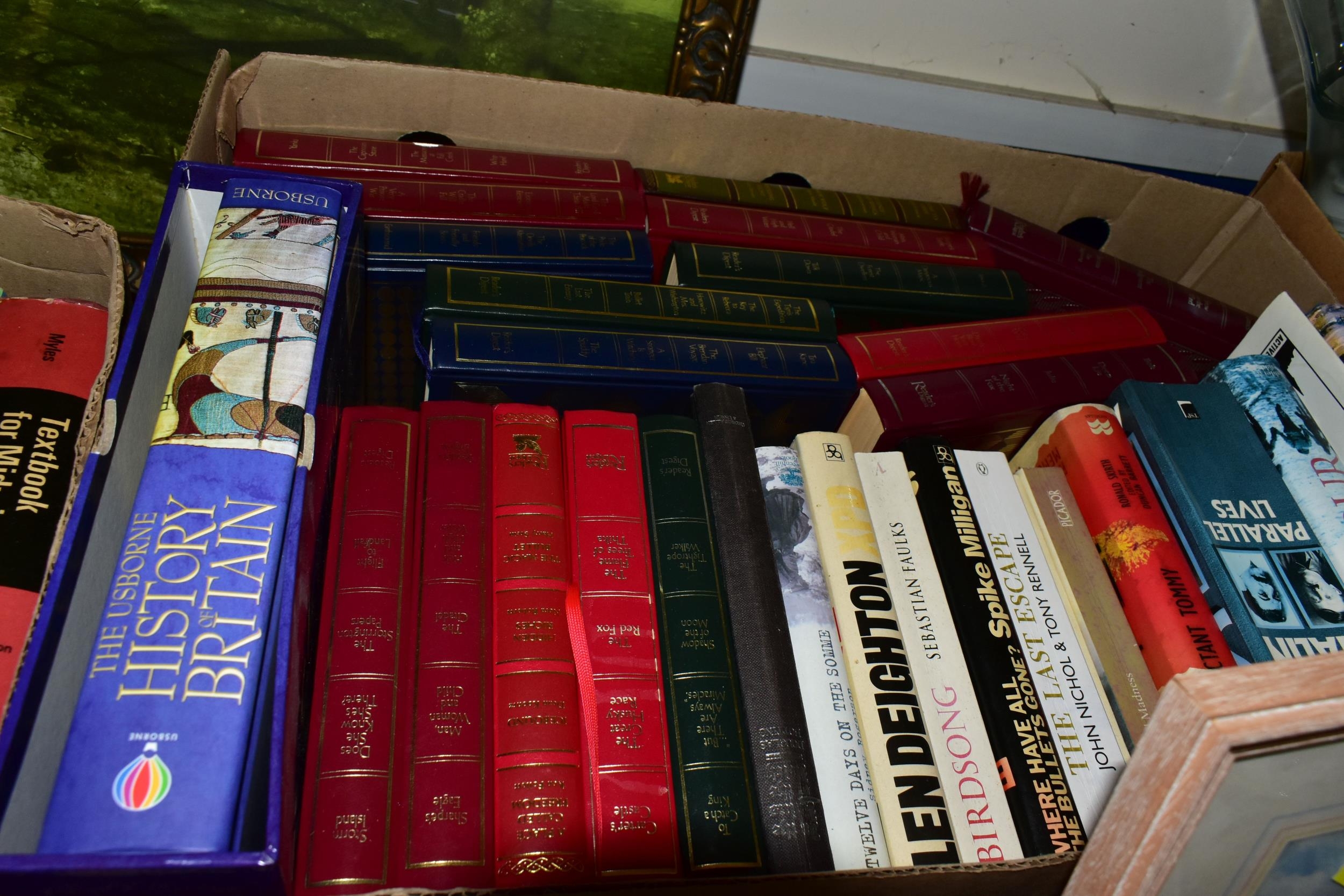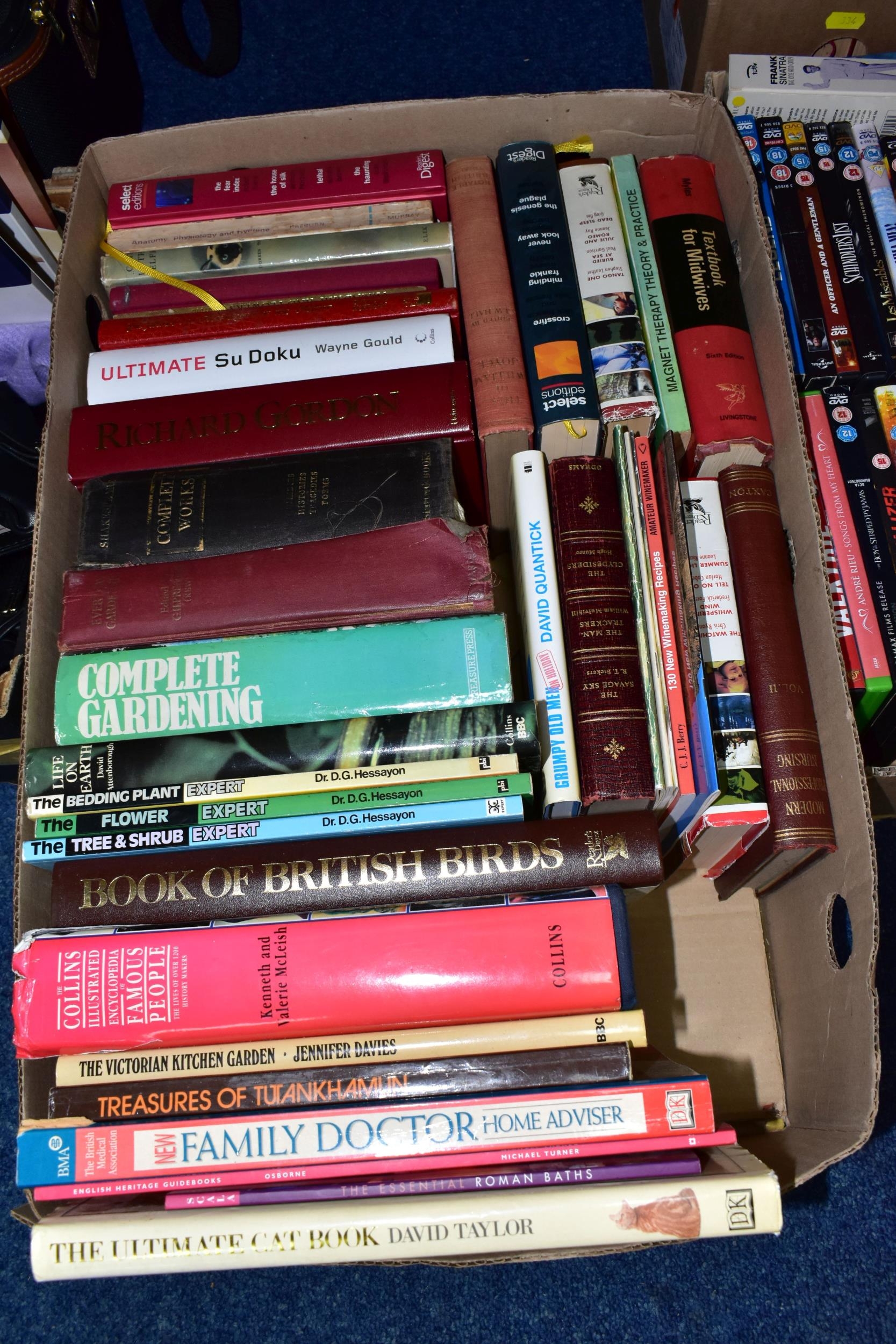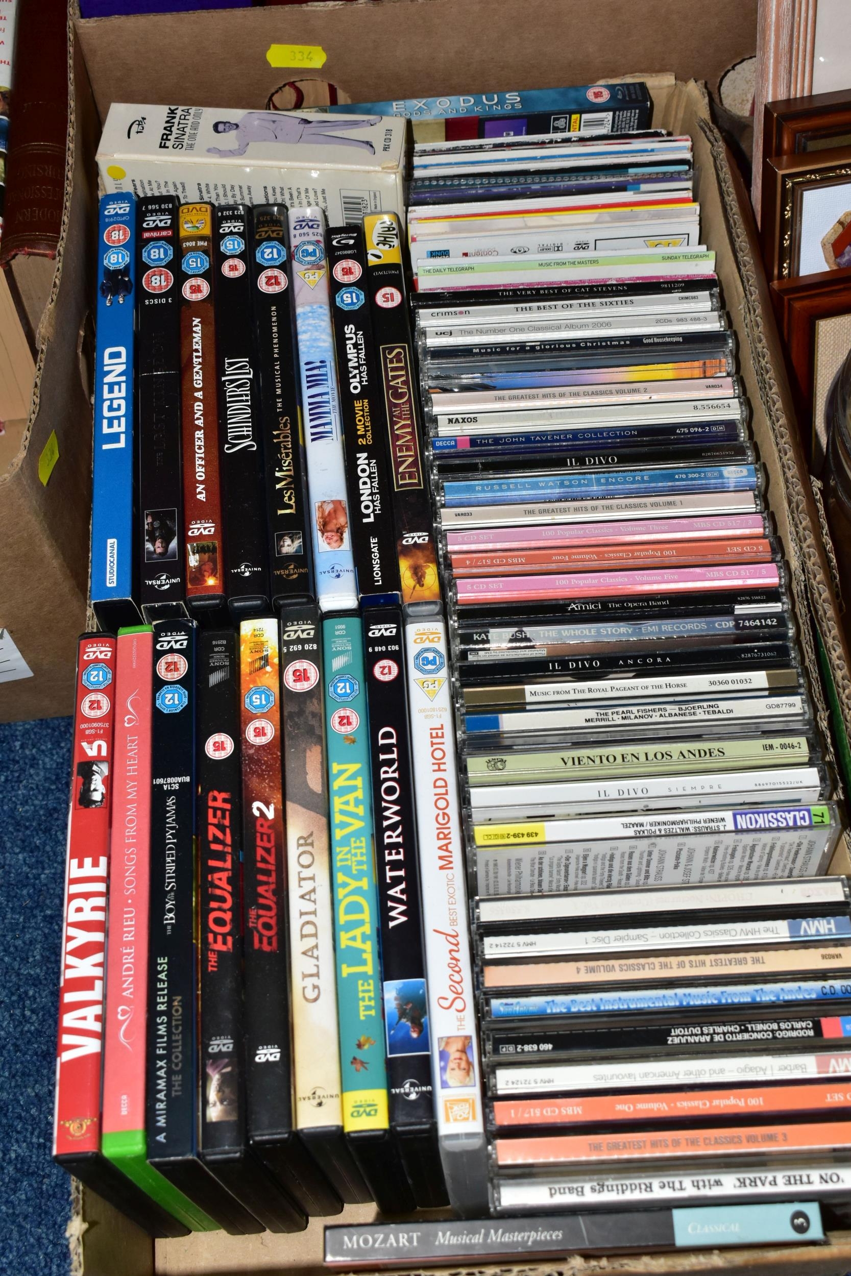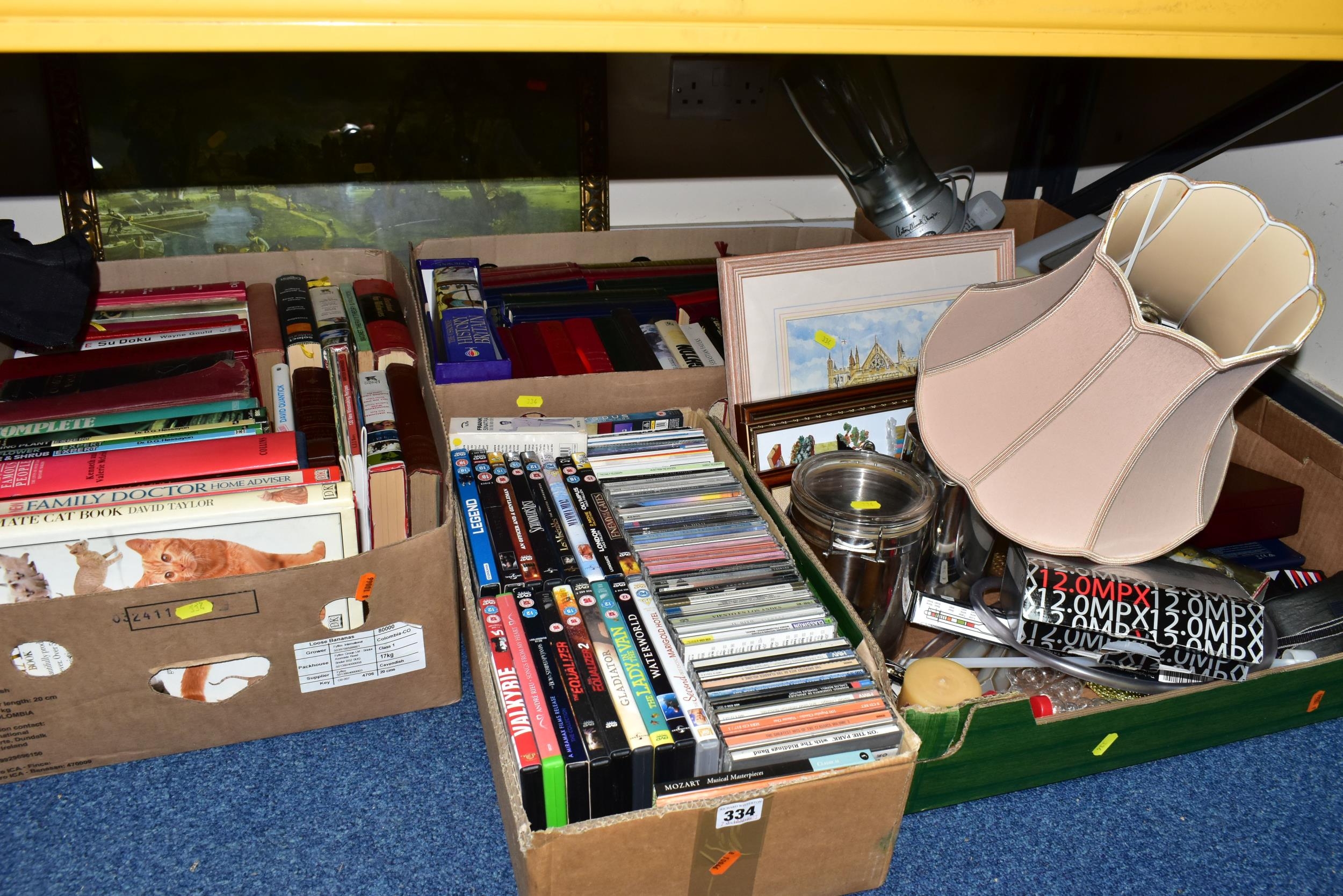 FIVE BOXES OF BOOKS, CDS, DVDS AND KITCHEN EQUIPMENT, to include a Russell Hobbs 'Chelsea Teamaker', a Breville 'Anthony Worrell-Thompson' liquidizer, a Minolta Riva Zoom 90C camera, a boxed Olympus Trip 35 camera, approximately thirty assorted books, 1990s CDs and DVDs, etc. (s.d) (5 boxes)