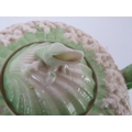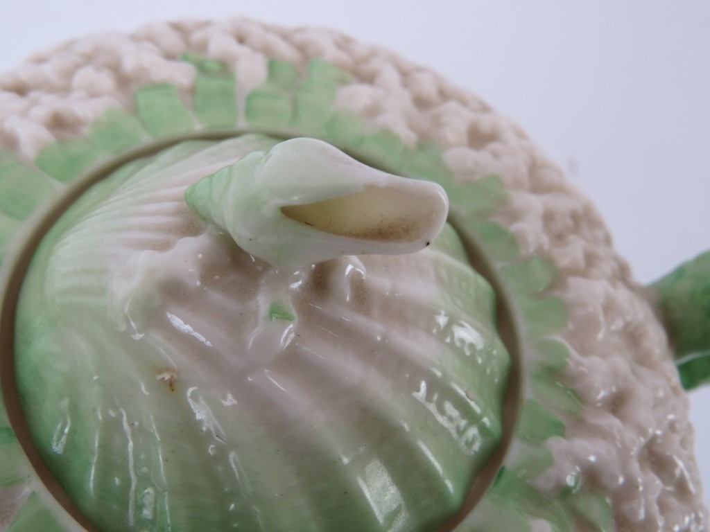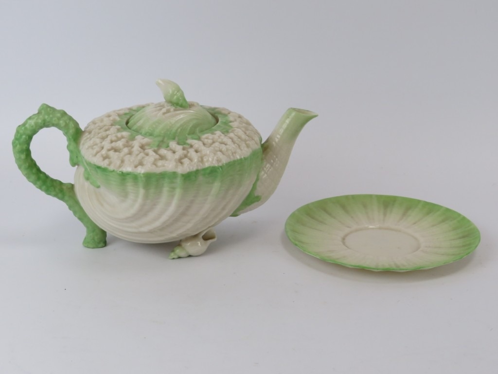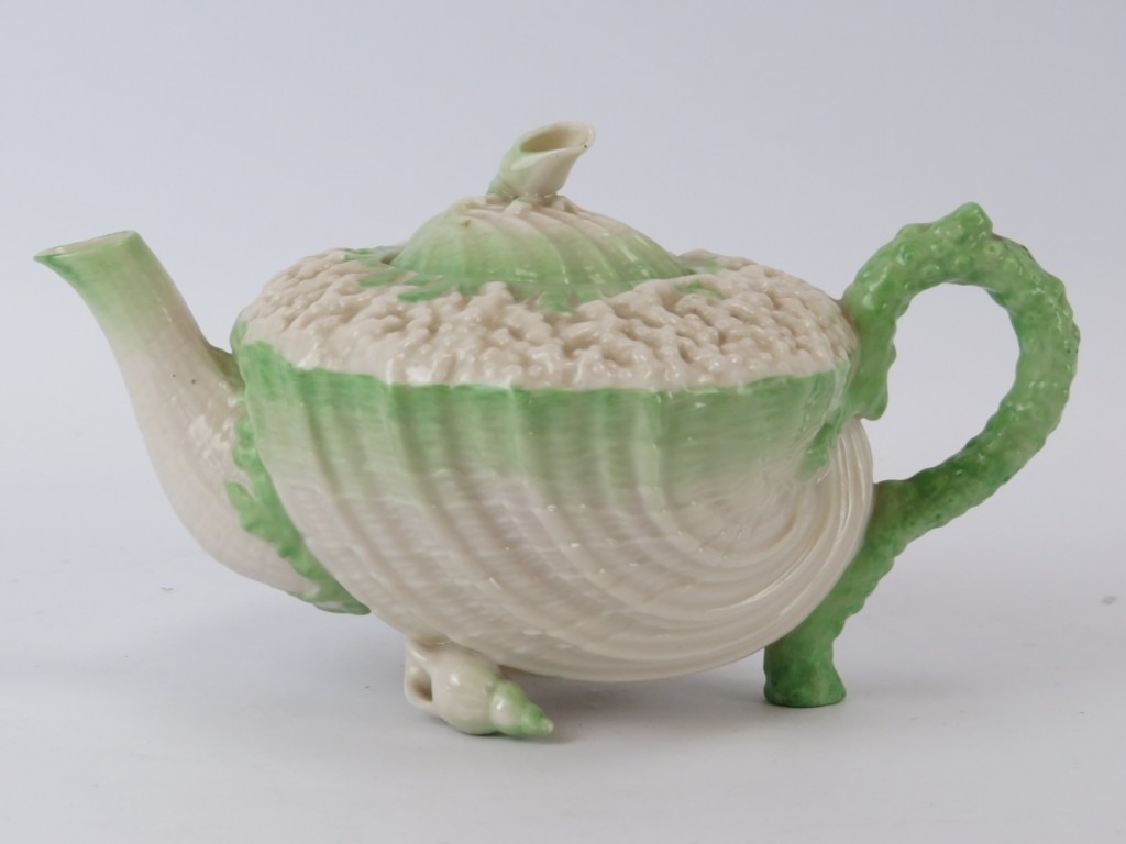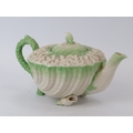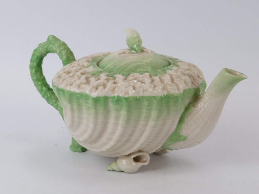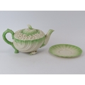 A Belleek ‘Neptune’ shell decorated teapot and a matching saucer. Teapot: 20.8 cm length.