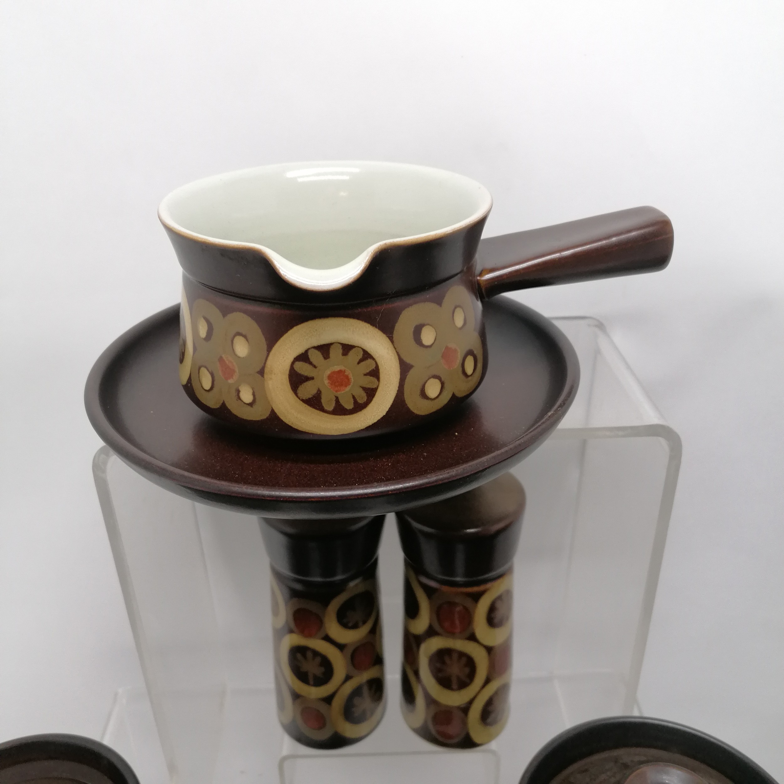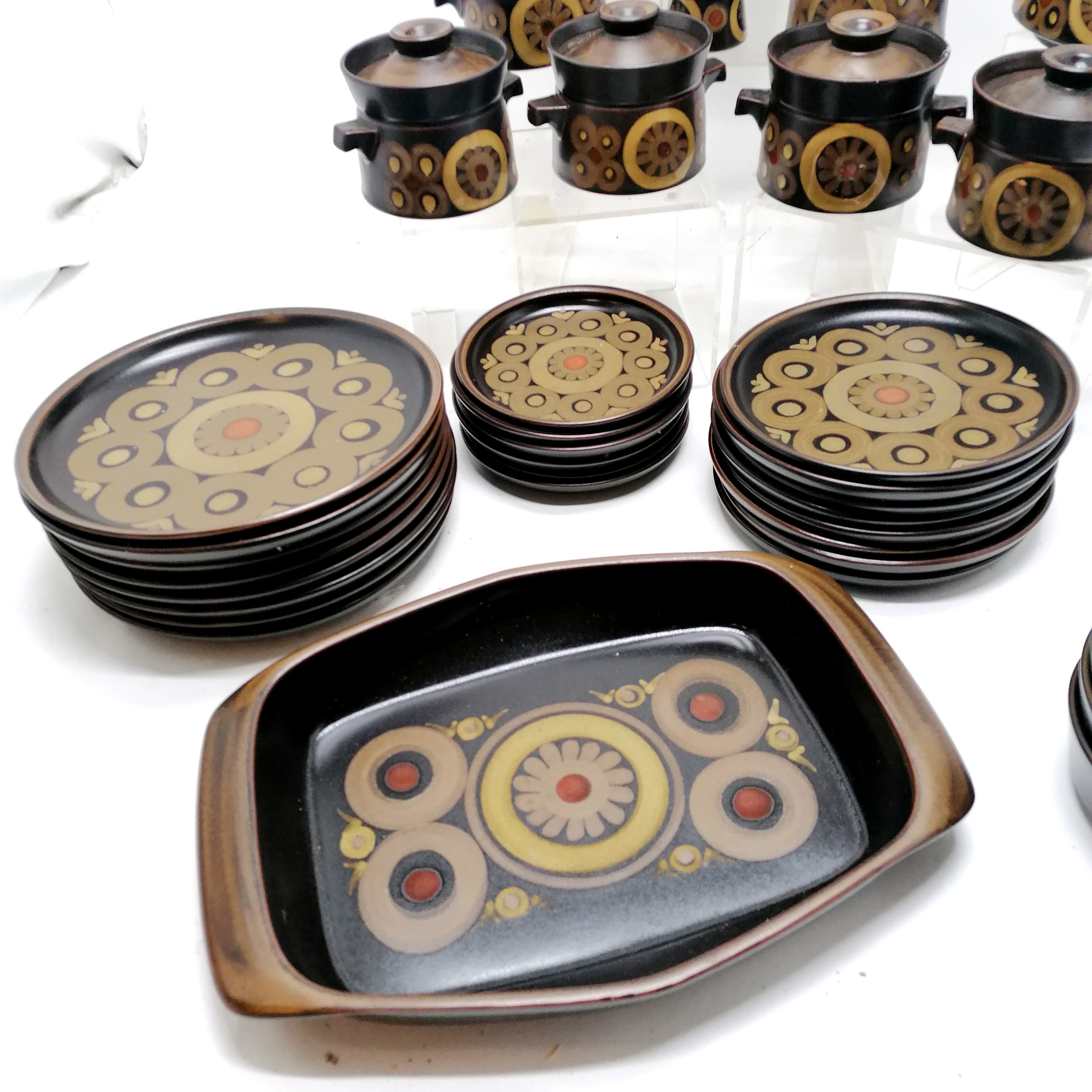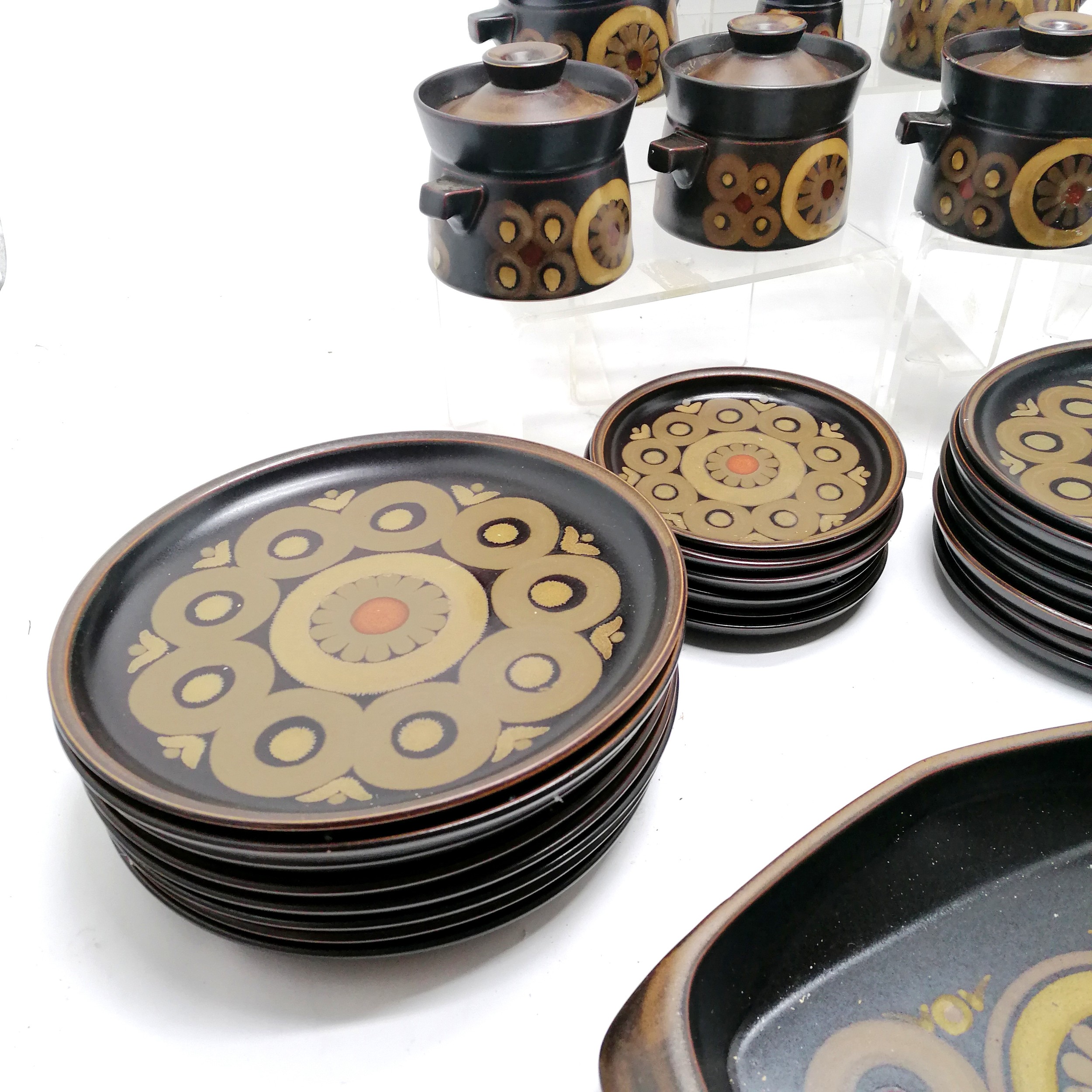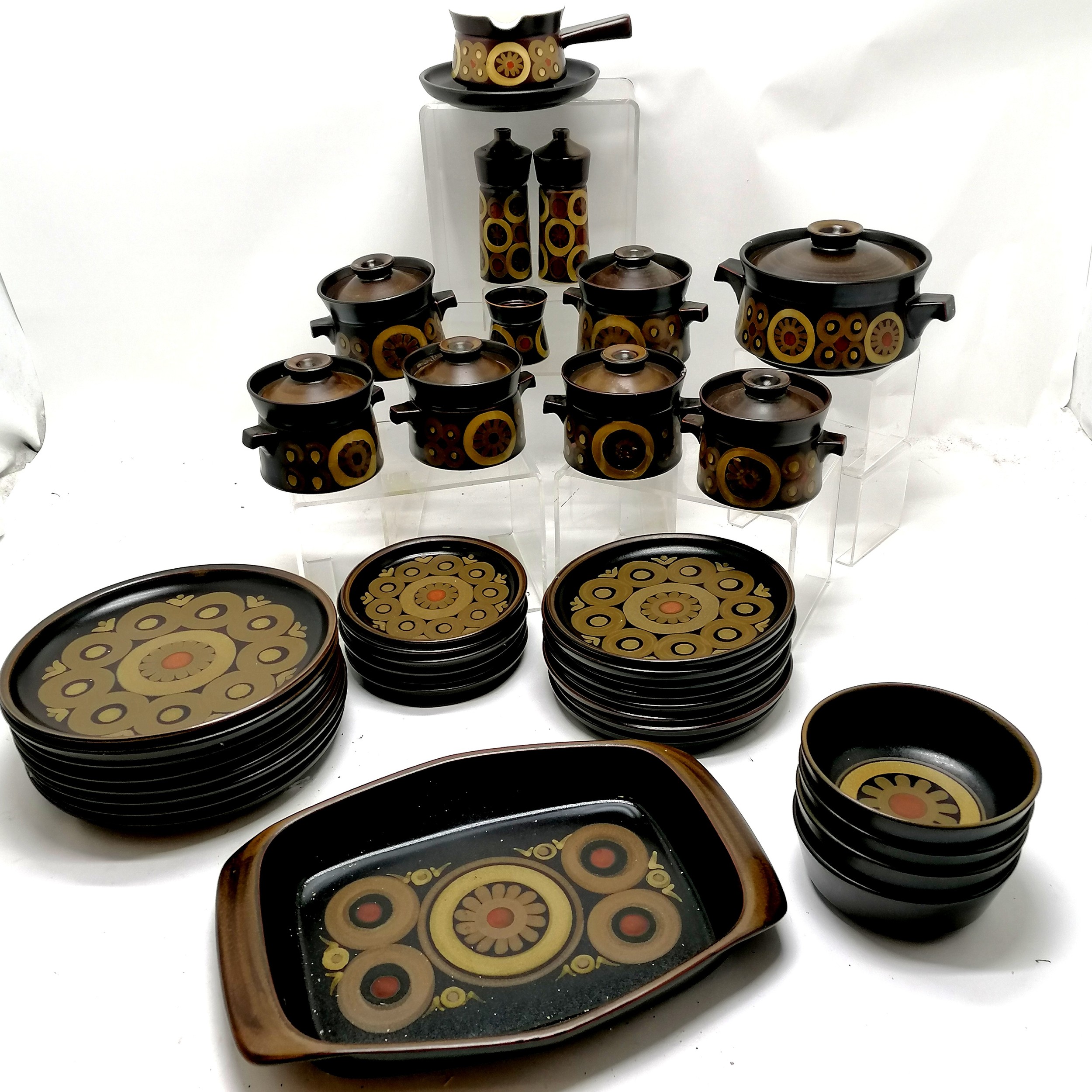 Quantity of Denby Arabesque dinner ware including 8 x 25.5cm dinner plates, 8 x side plates 20.5cm, 6 x side plates 16.5cm, large serving dish, 6 x lidded soup bowls, lidded casserole dish, cruet and gravy boat - no obvious damage