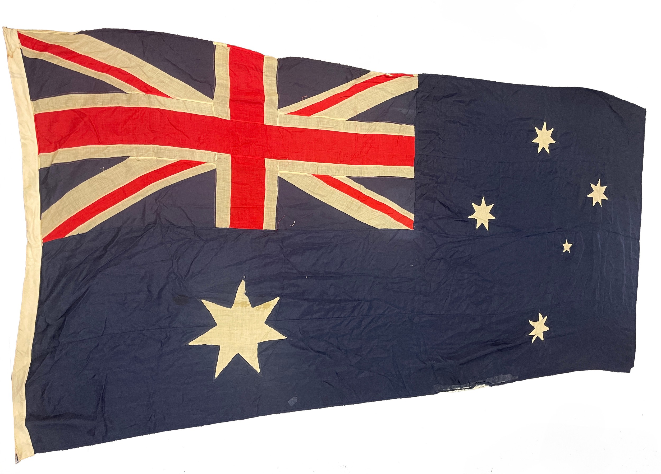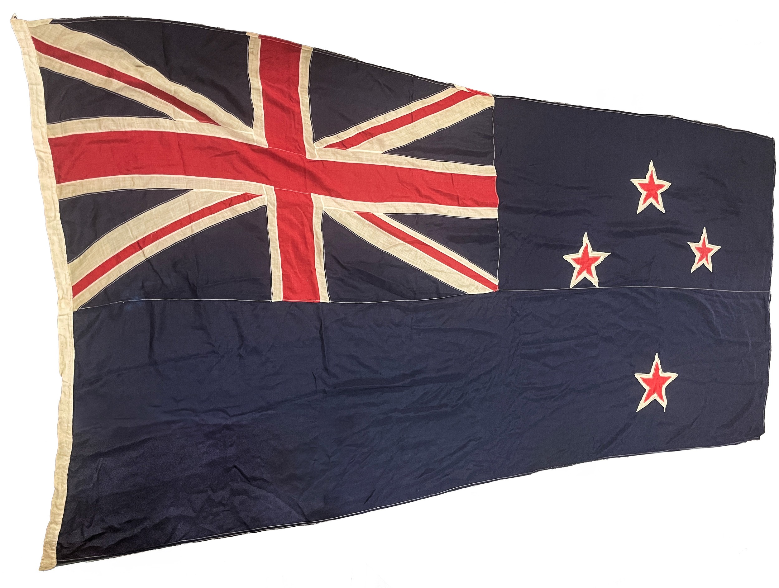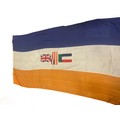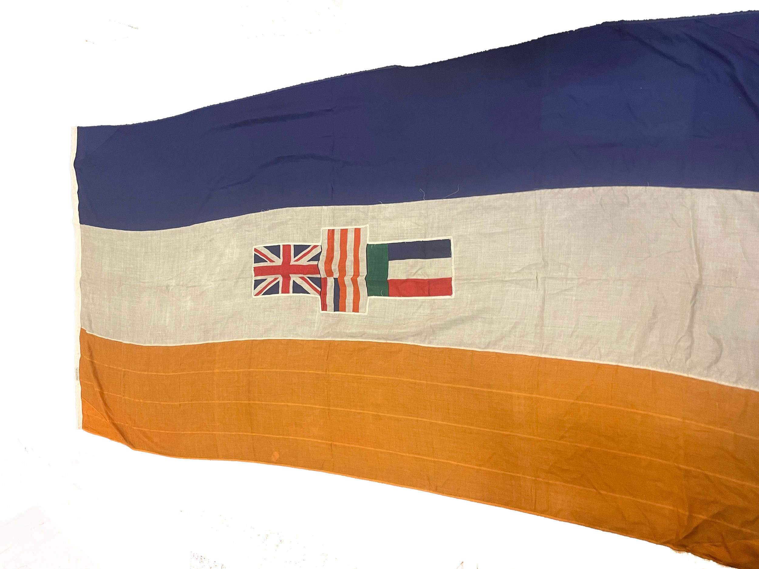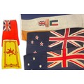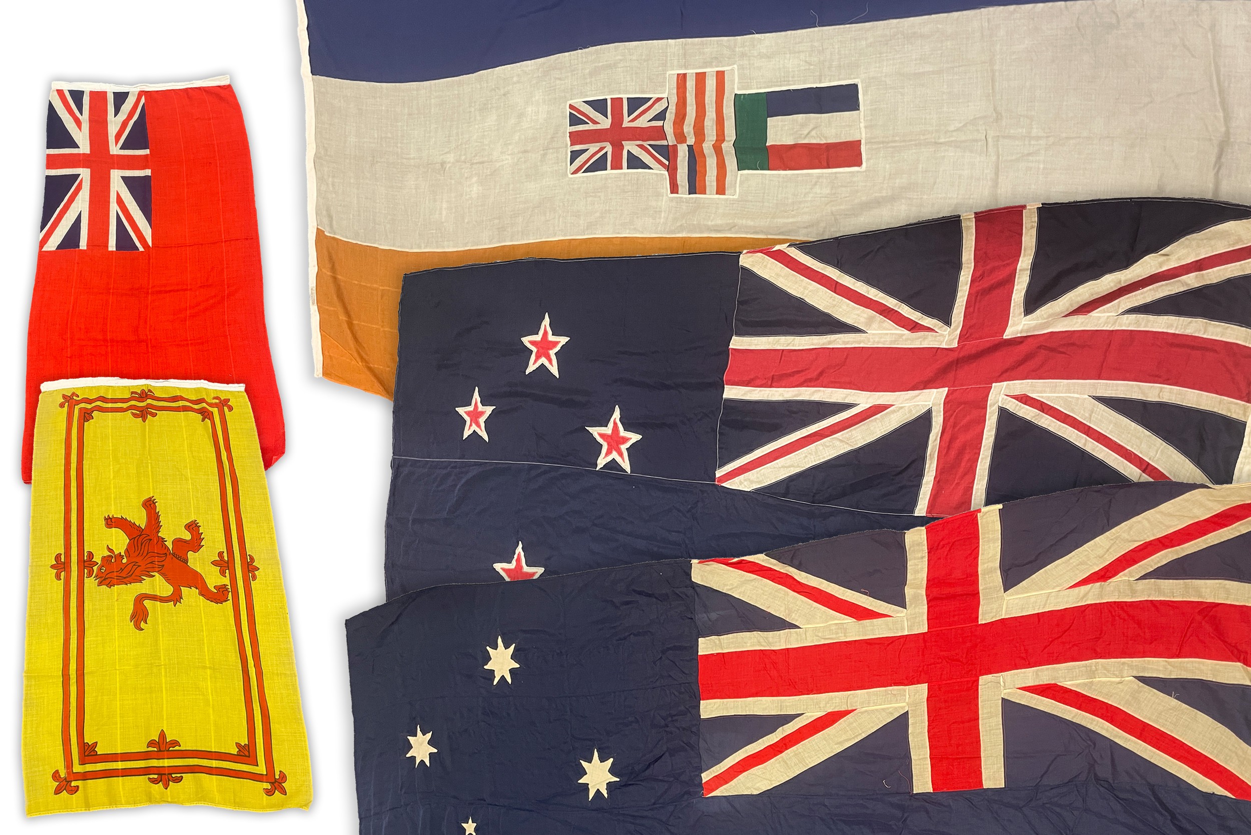 Five flags, including the former flag of South Africa, 360 x 180 cm, a British Red Ensign duster flag, 170 x 90 cm, the flag of New Zealand, 360 x 165 cm, the Royal Banner of Scotland flag, 173 x 94 cm, together with the National flag of Australia, 360 x 175 cm. (5)