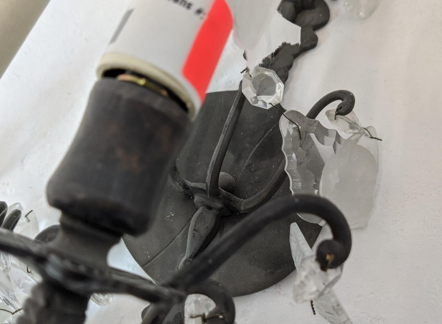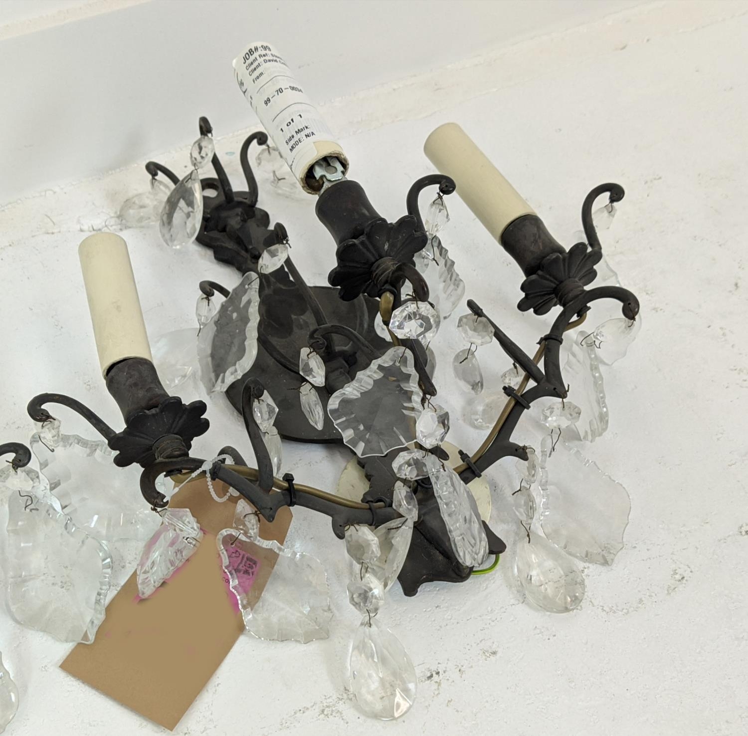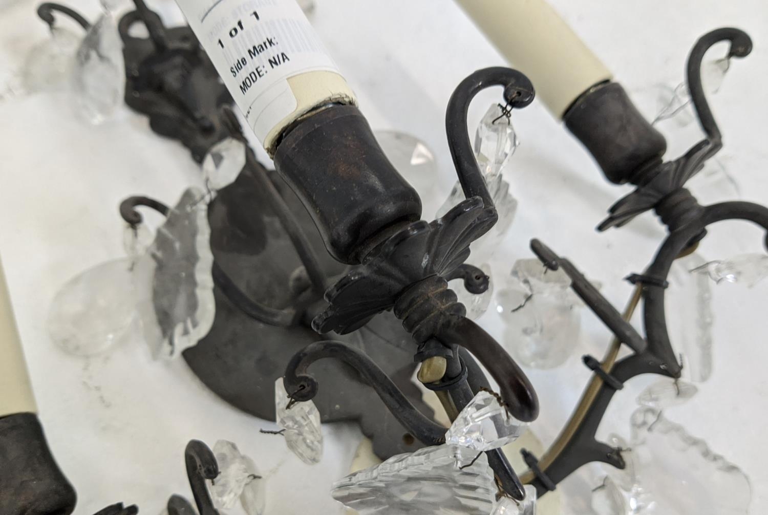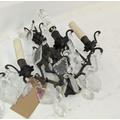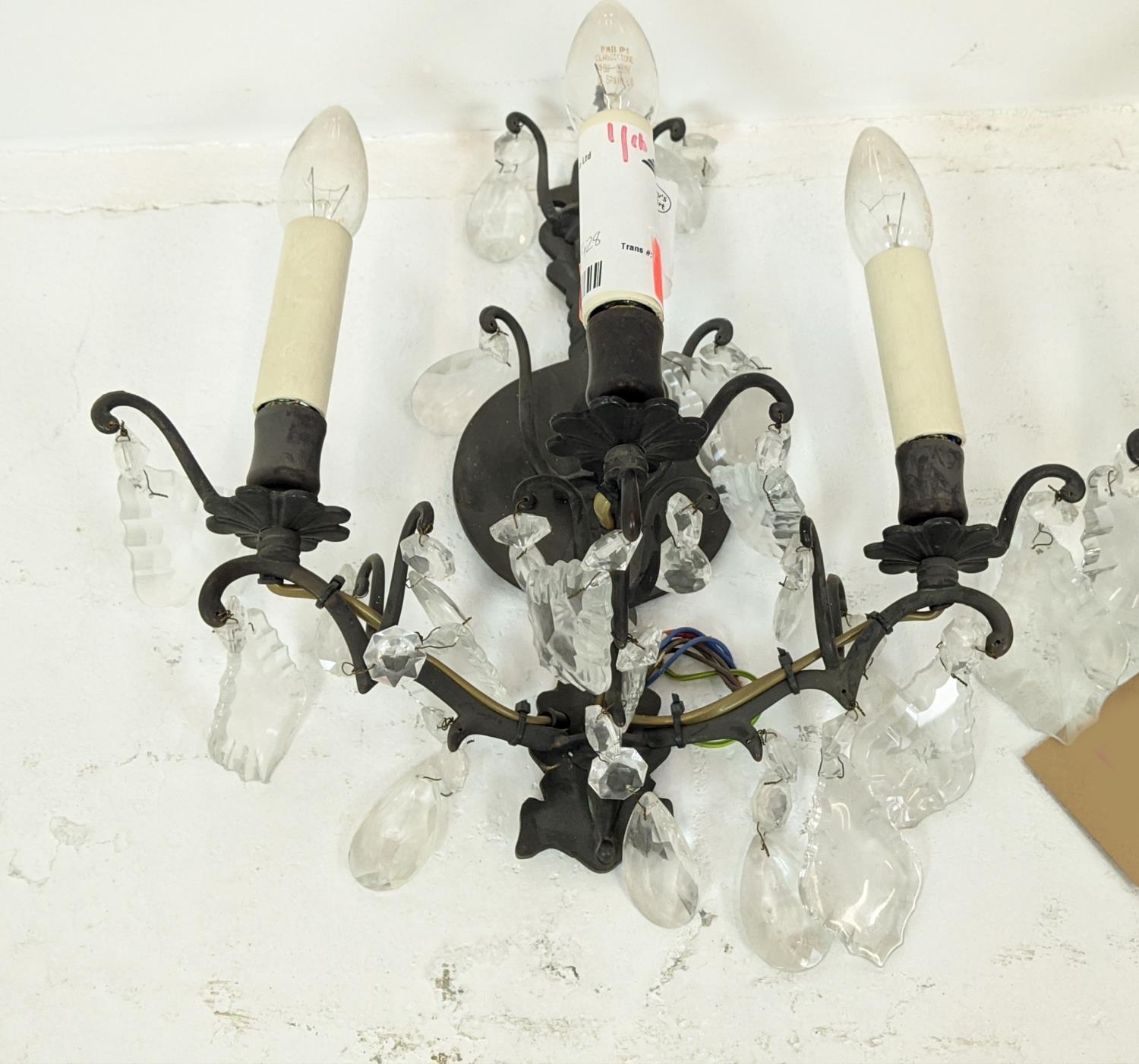 WALL SCONCES, a pair, each with two branches and glass droplets, each 35cm W x 35cm H.