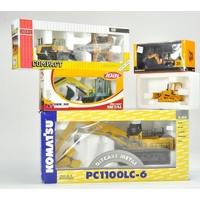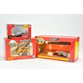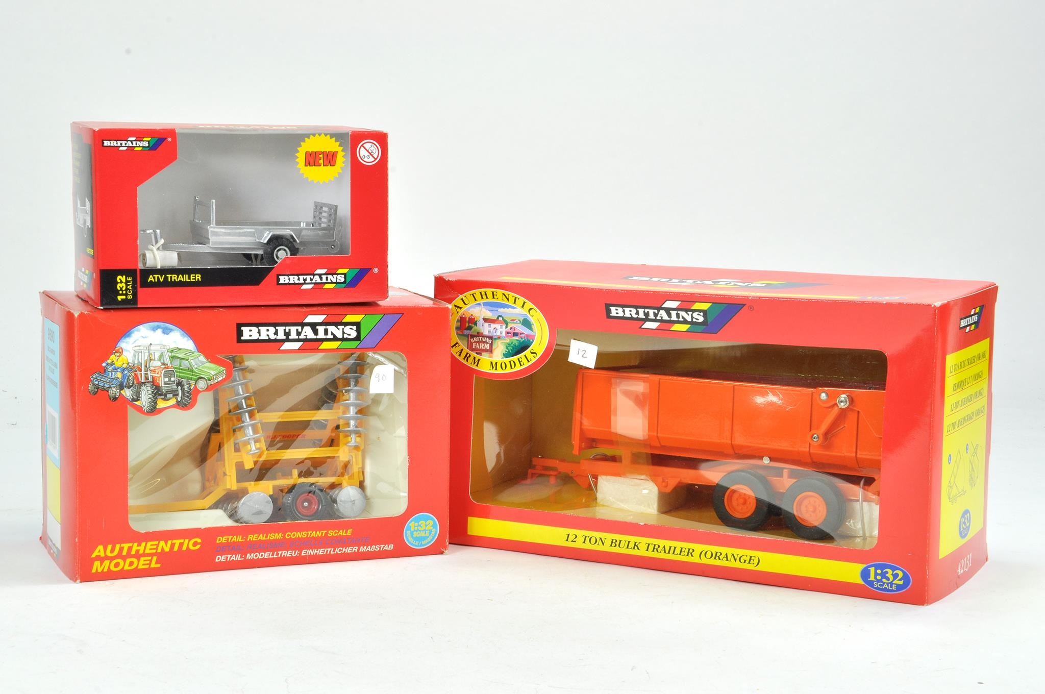 Britains boxed trio including Disc Harrow plus hard to find 12 Ton Bulk Trailer in orange. Excellent with boxes.