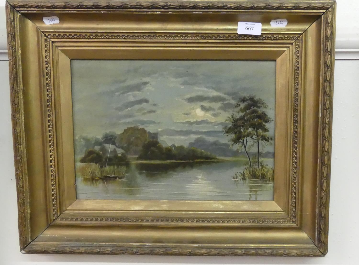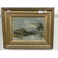 Framed Oil on Canvas - Loch Scene with Church in Moonlight - Unsigned 34 x 24cms