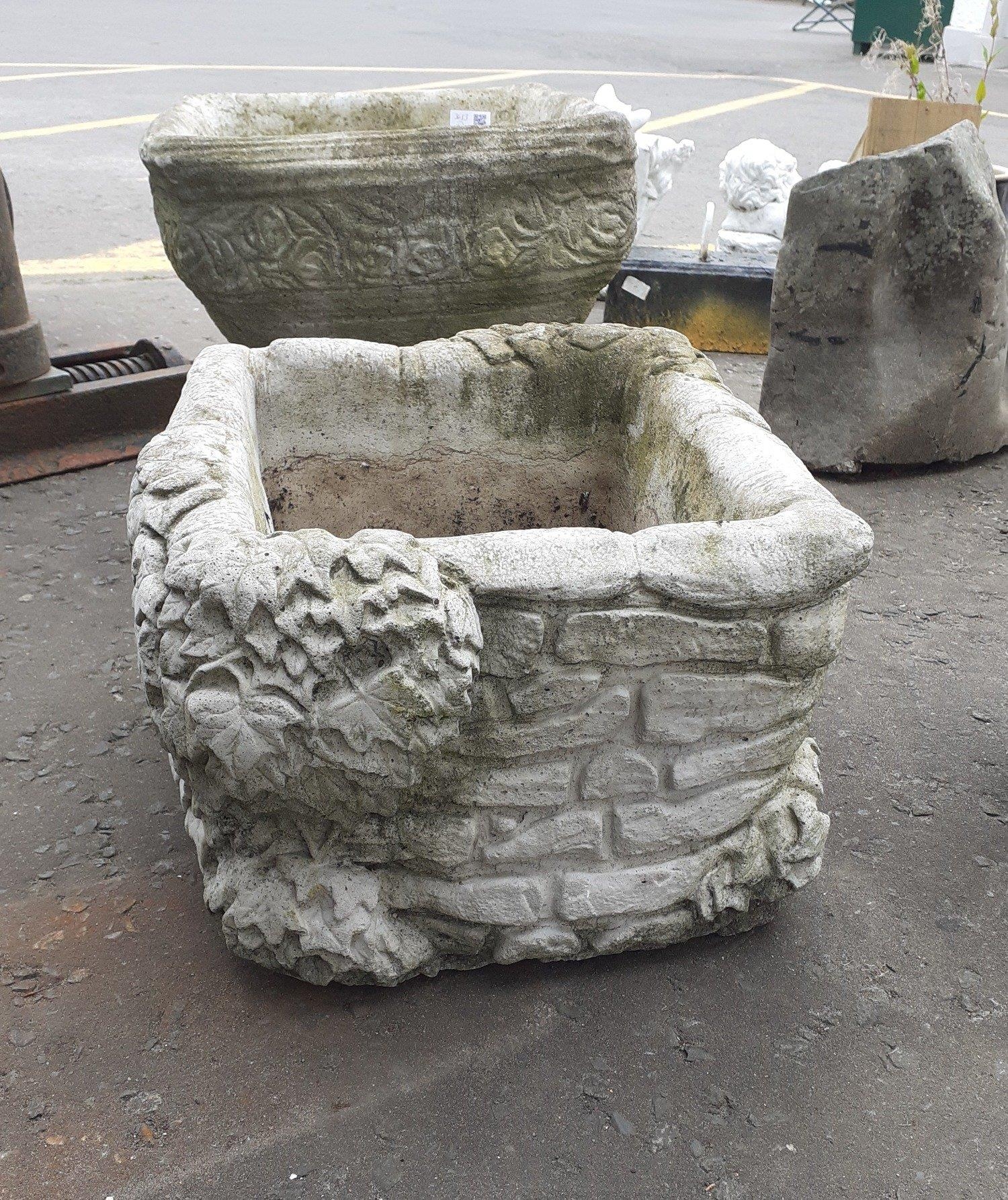 Garden planter square planter with wall and ivy effect finish. Stands 25cm high and measures 34cm across approx. Very attractive planter.