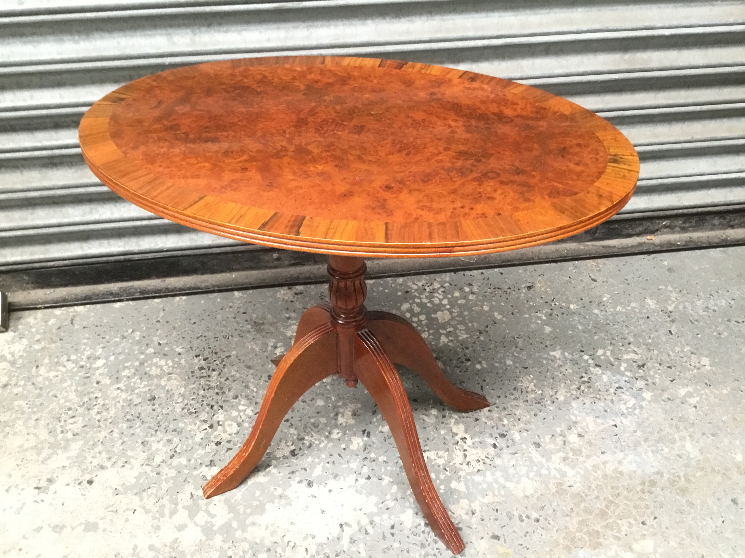Vintage oval tilt top table with burr walnut finish circa 1970’s