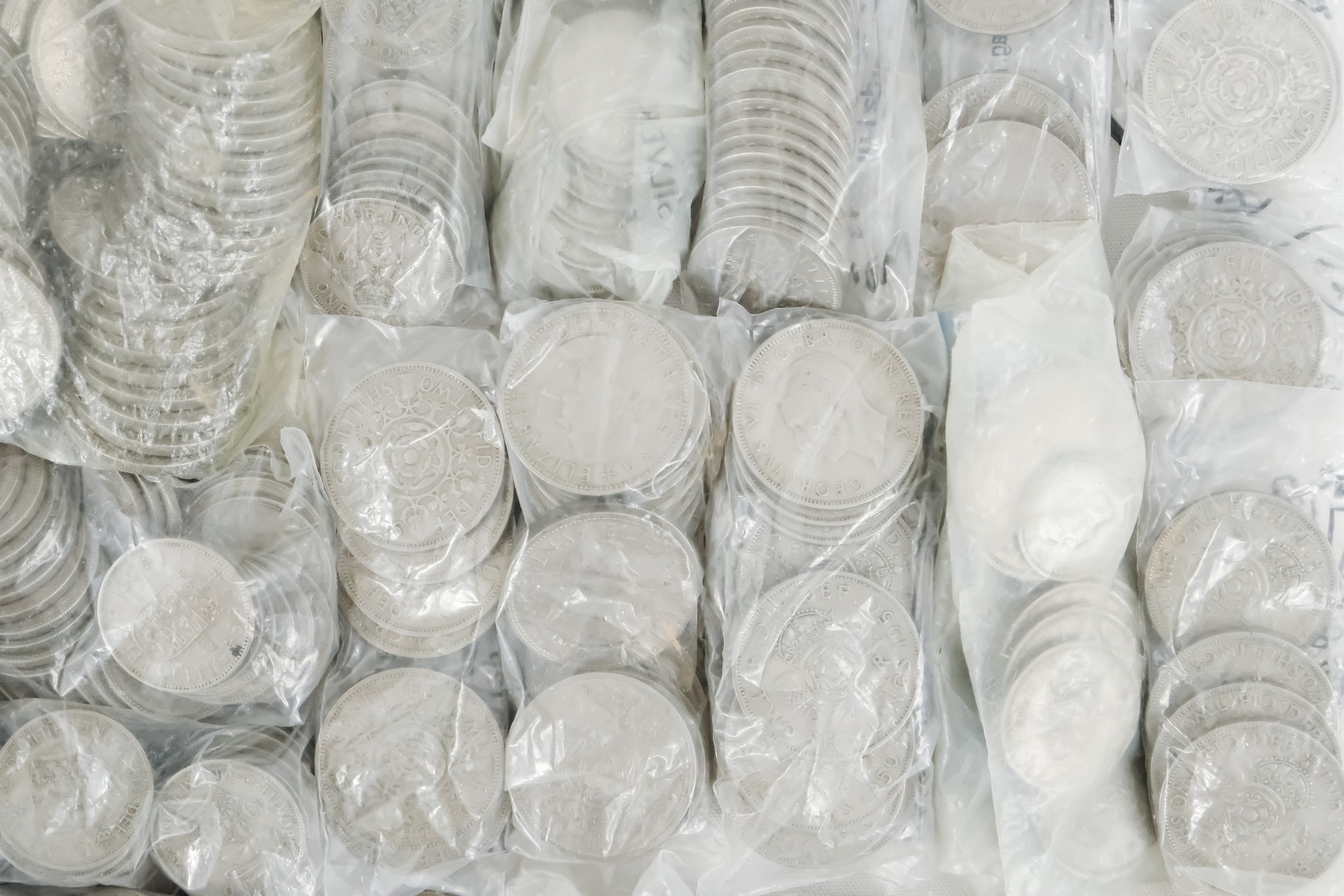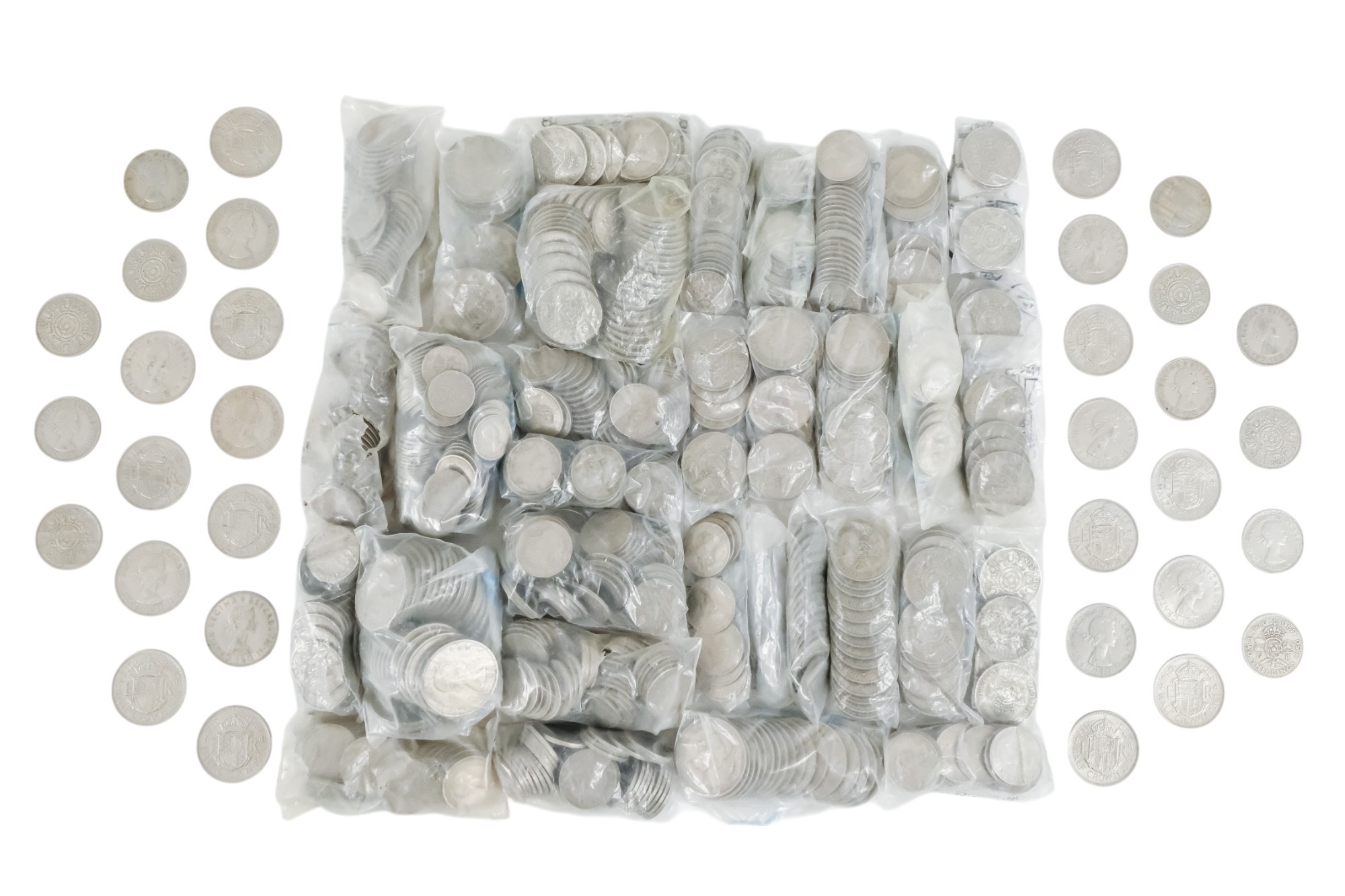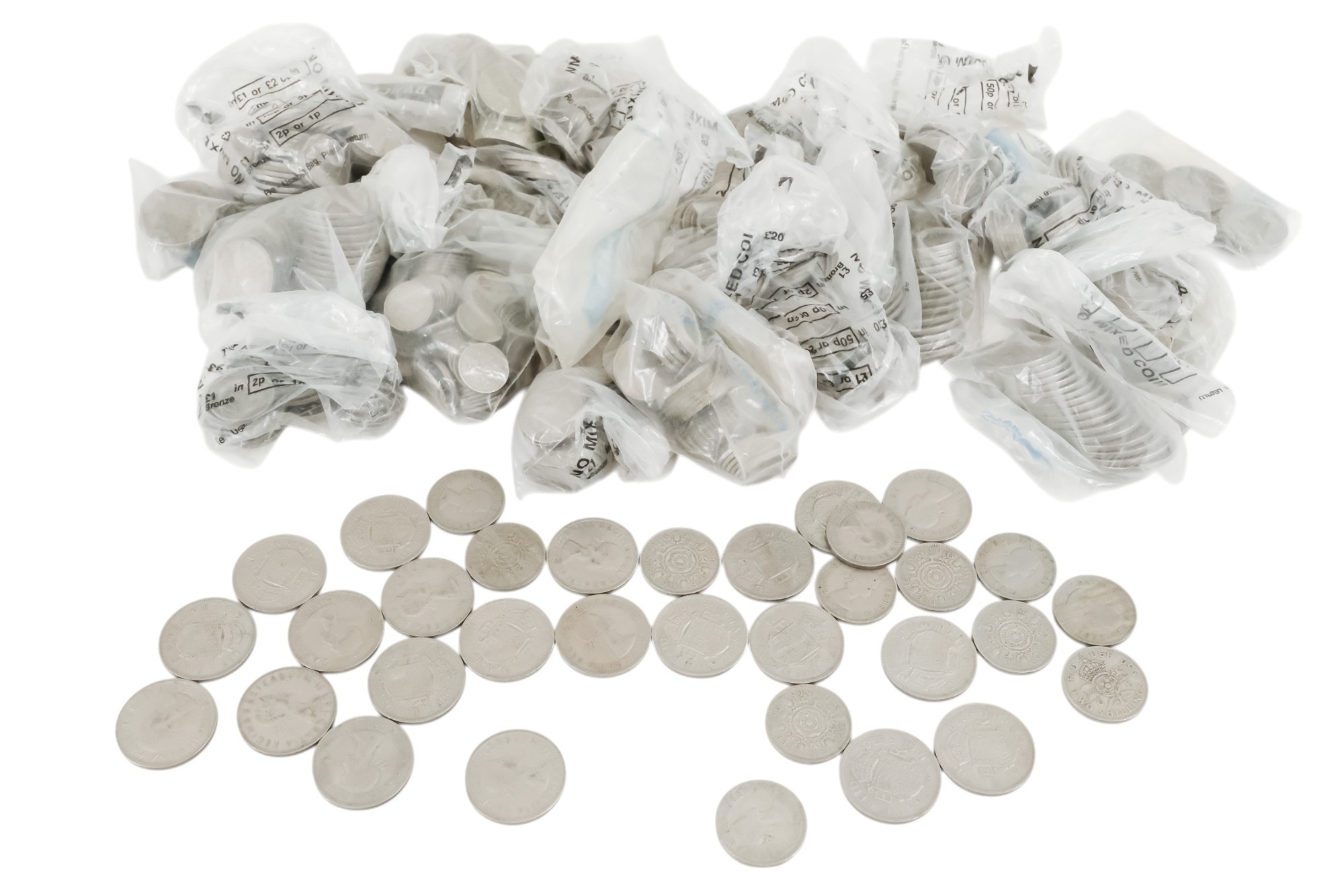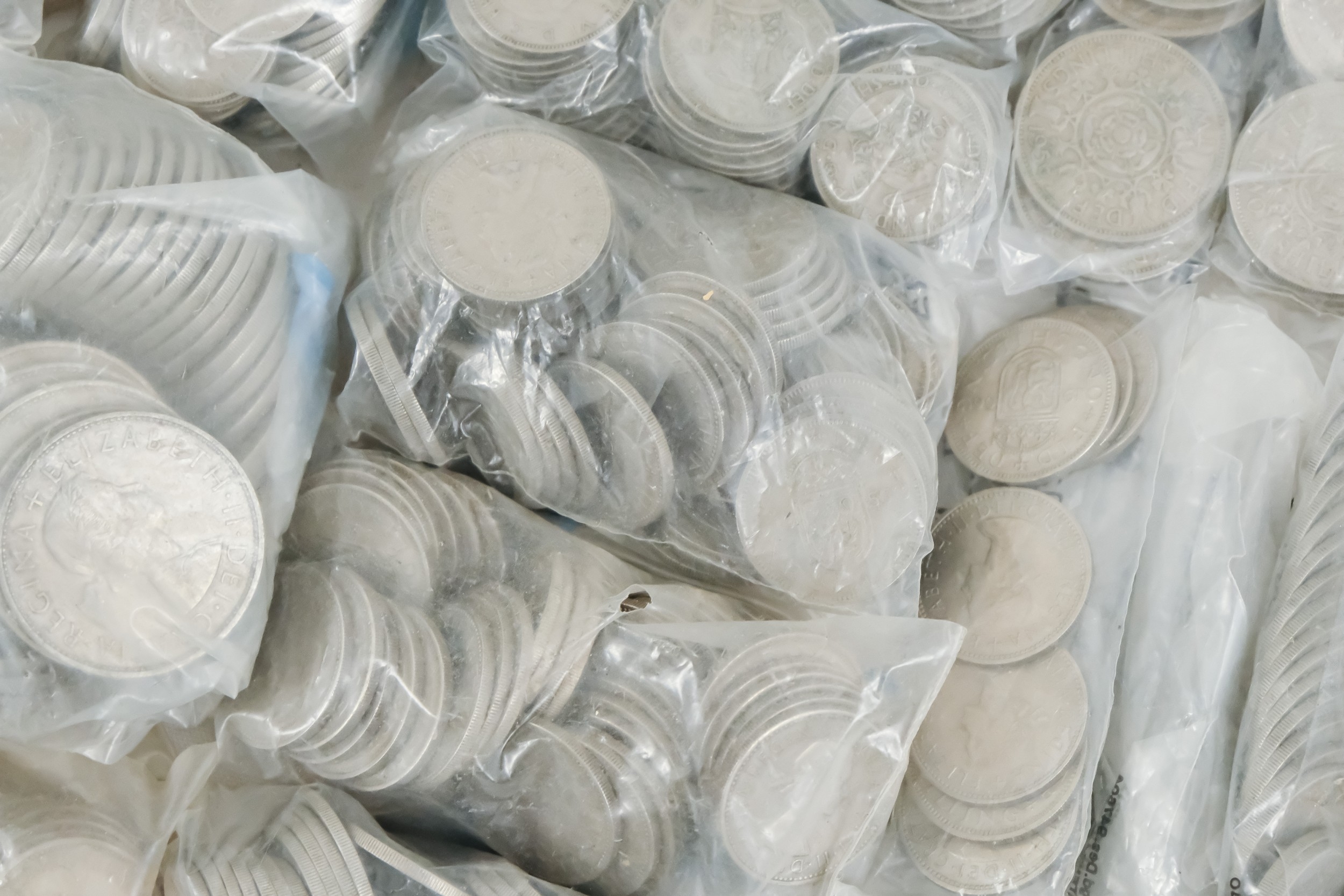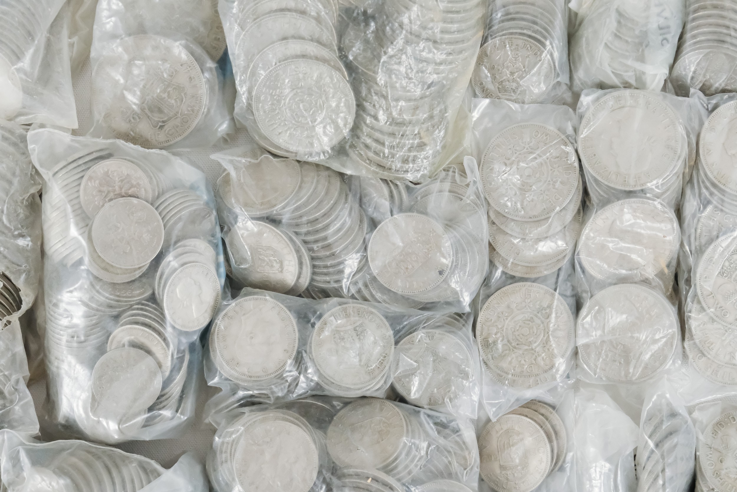 A large quantity of Great British cupel nickel coins - half-crowns, florins, shillings and sixpences in bags - 5.8 kg.