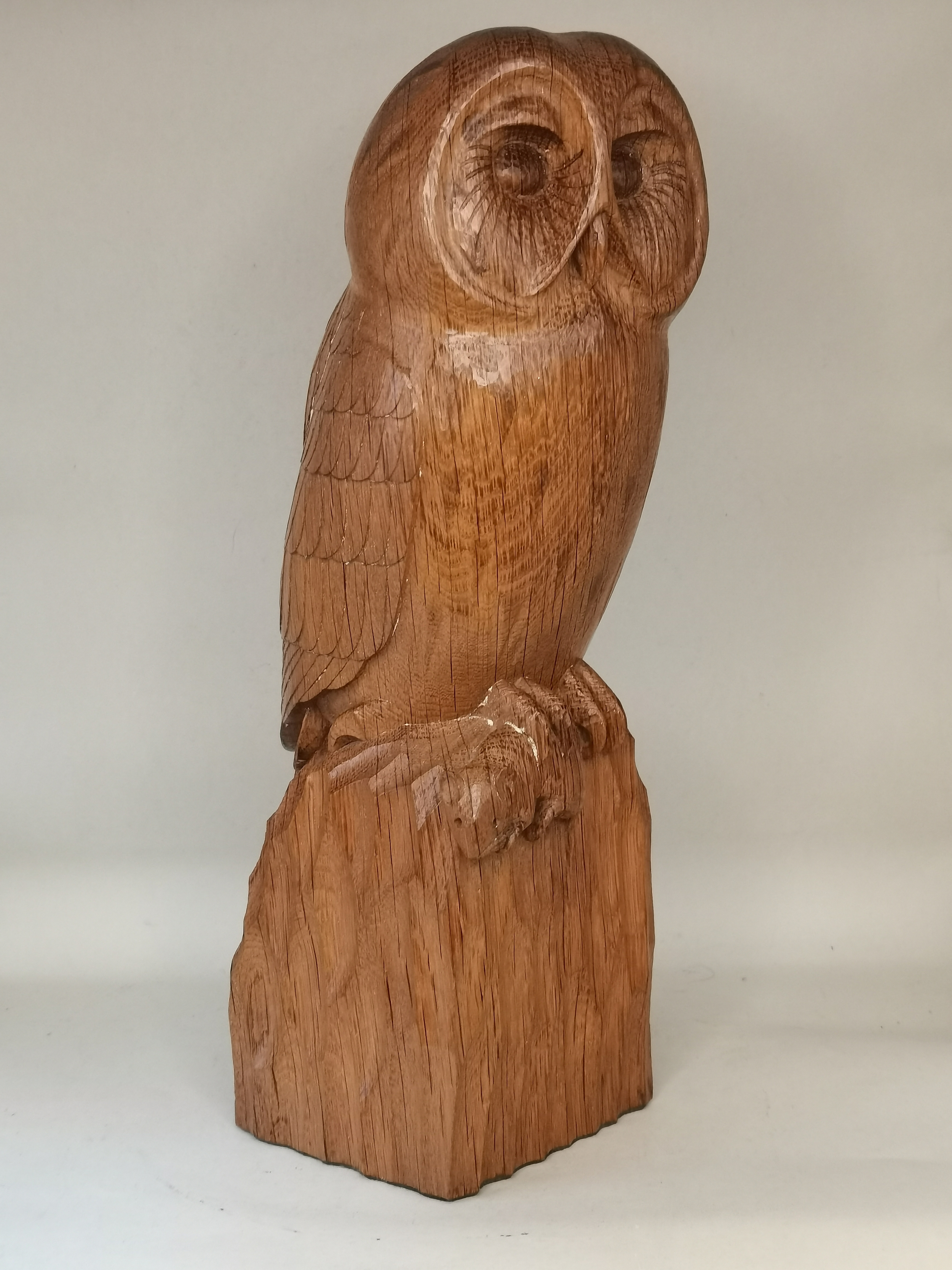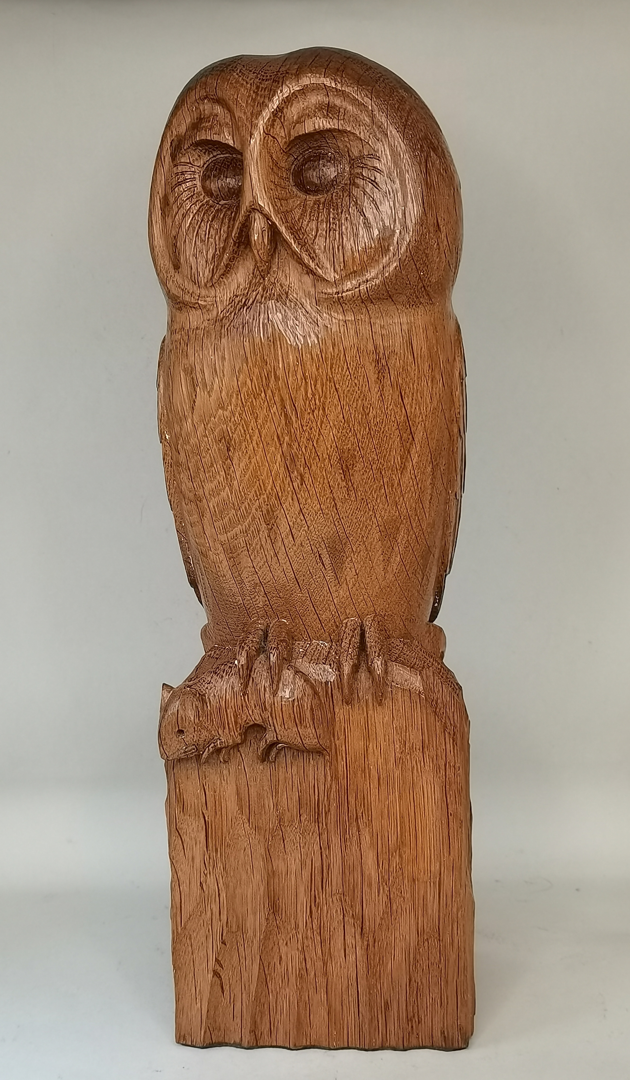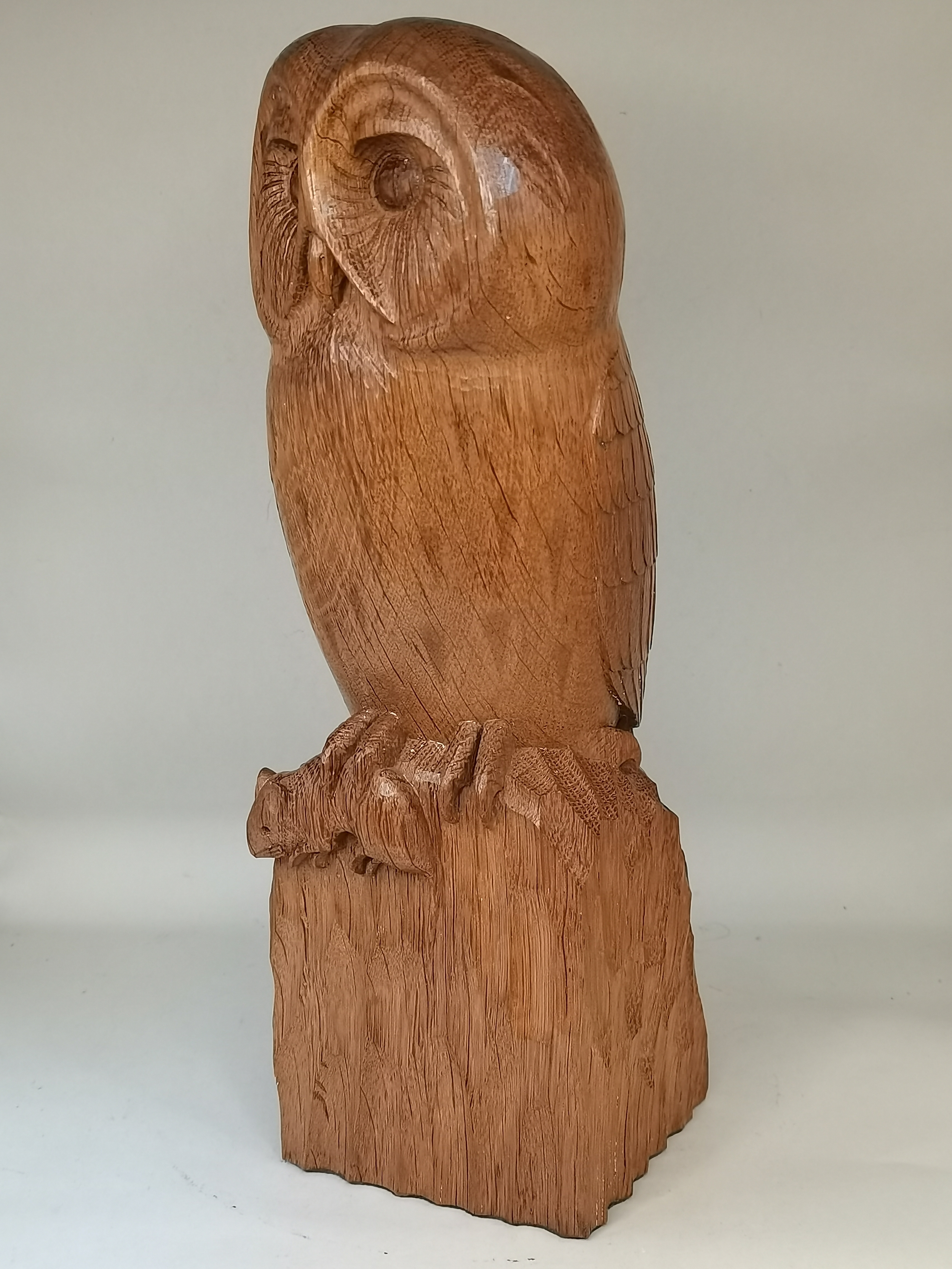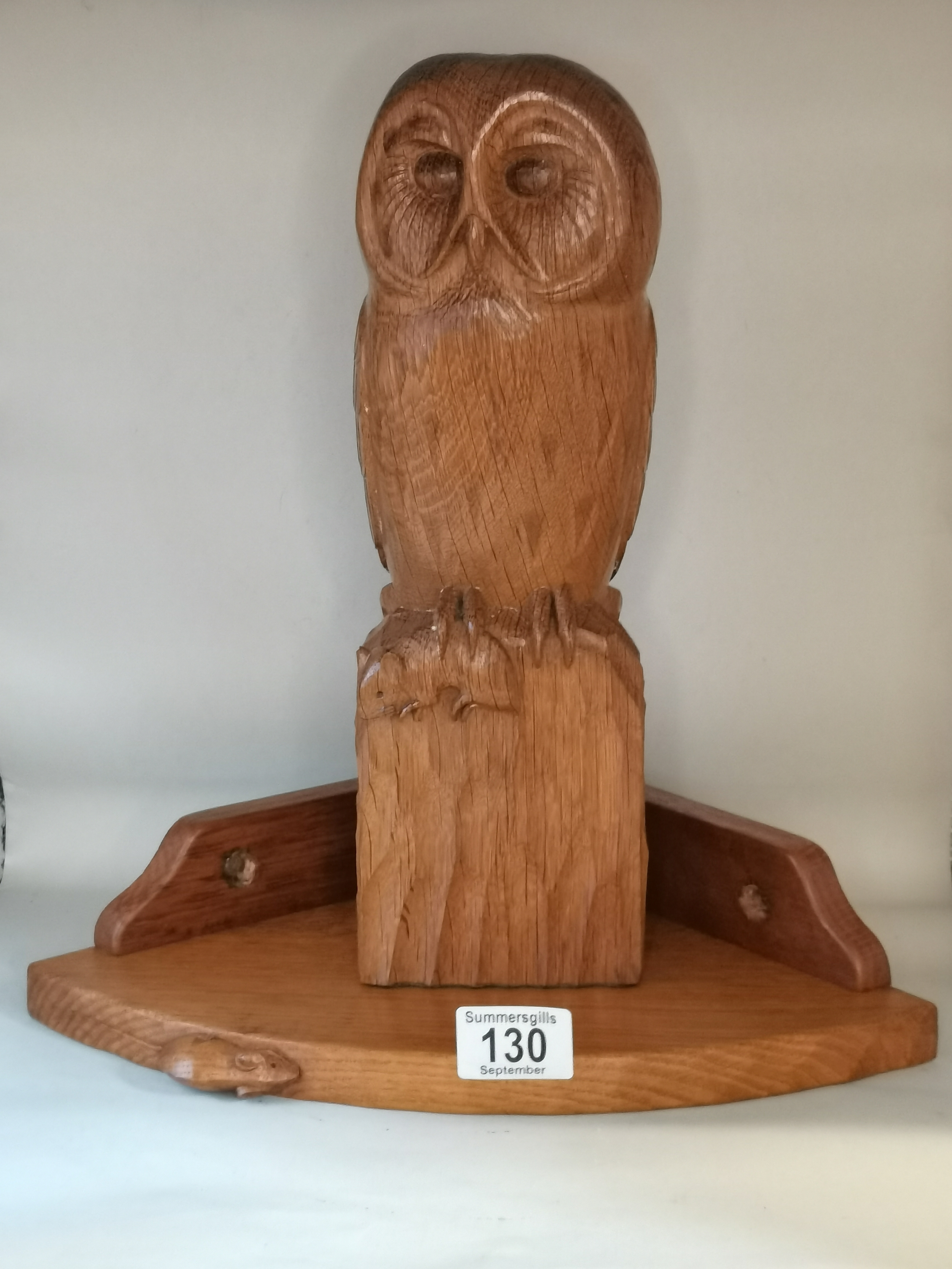 Exquisite Mouseman Owl with mouse in claw and a commissioned Mouseman corner shelf. H32cm Ex Condition