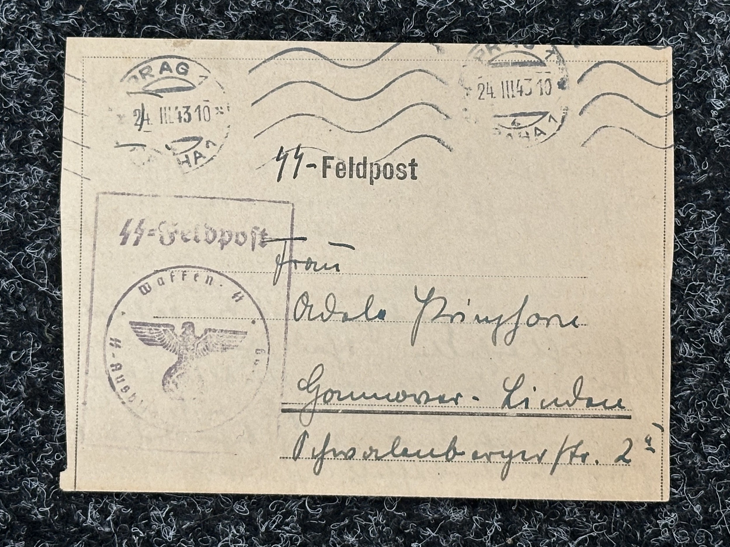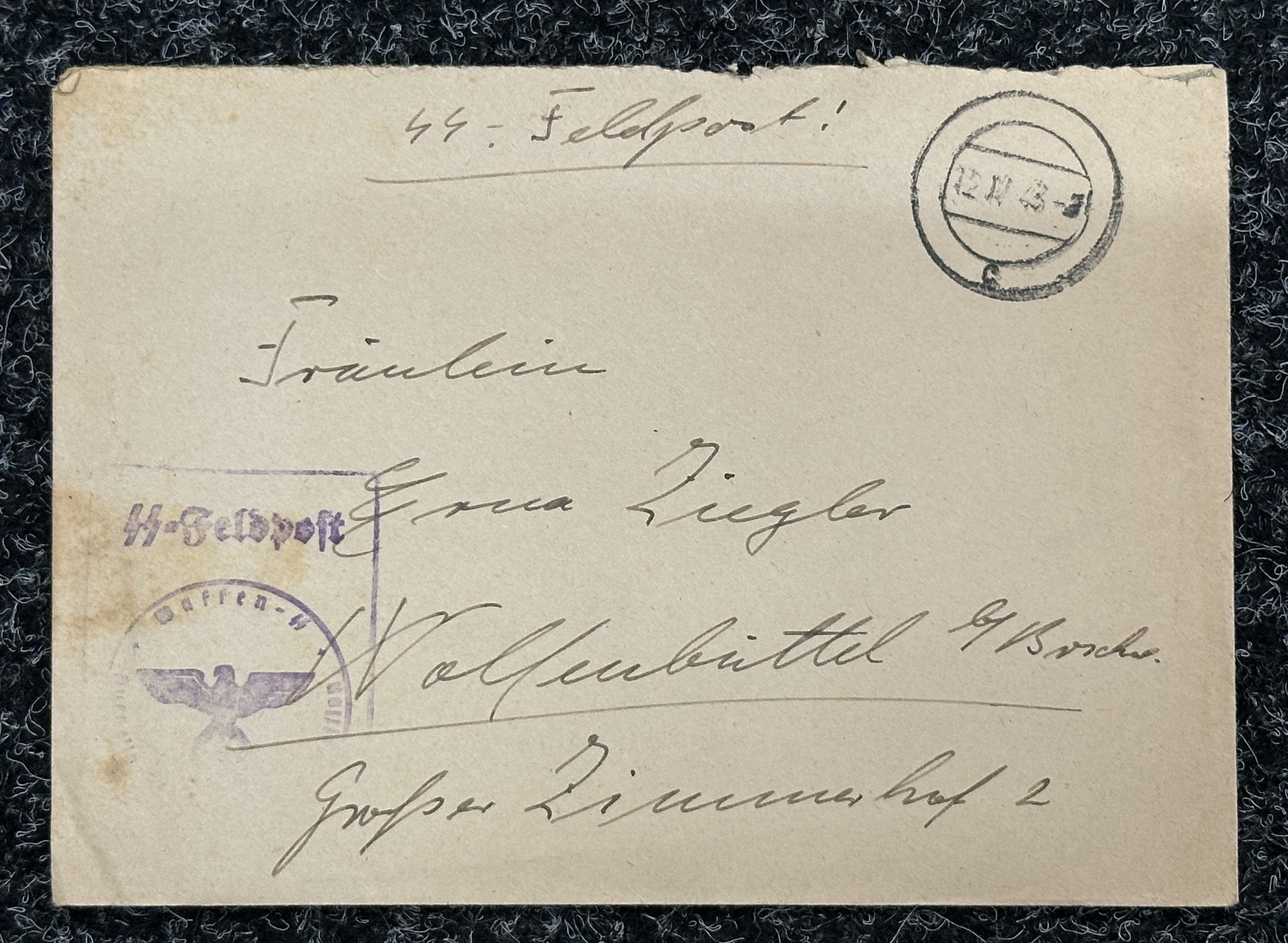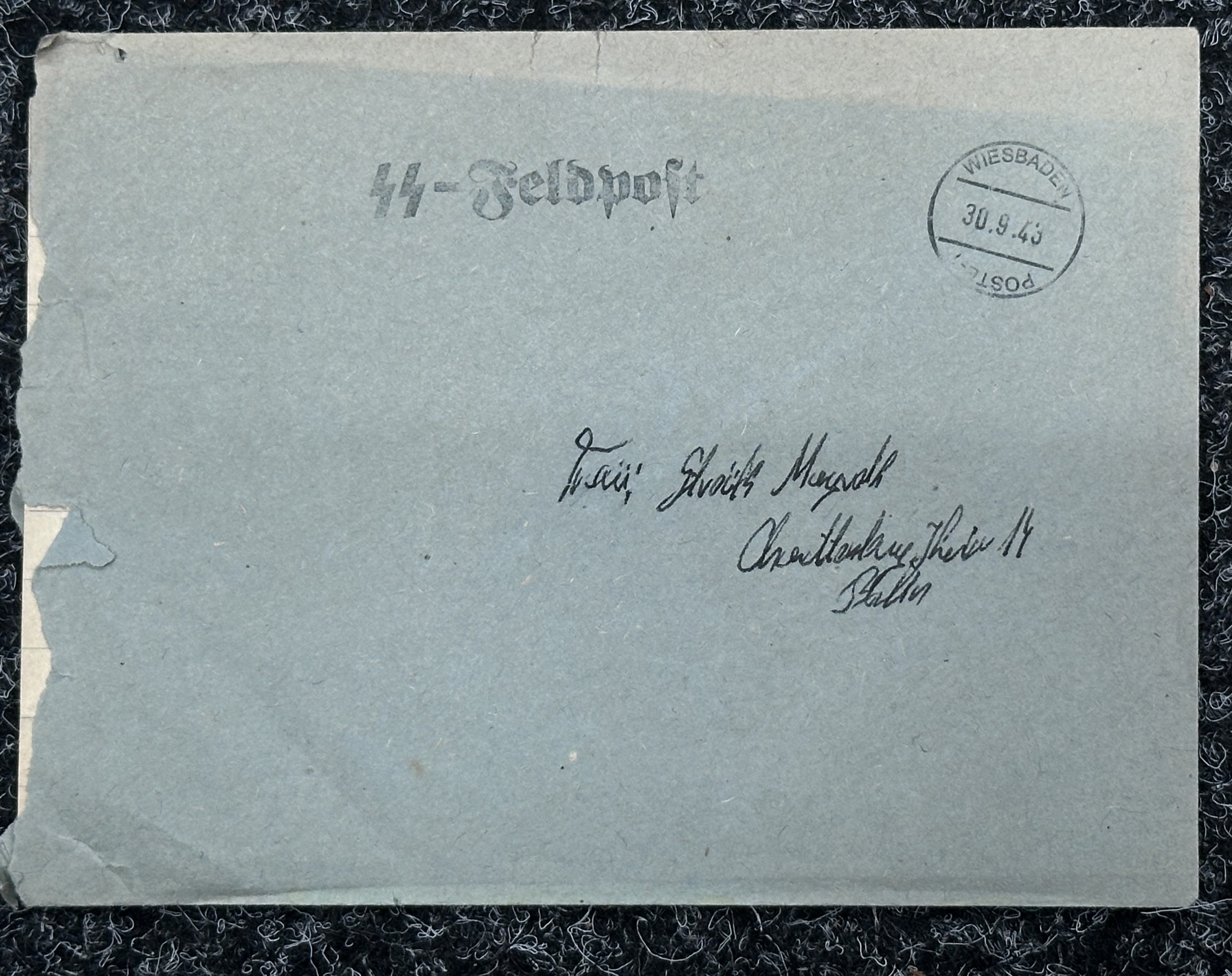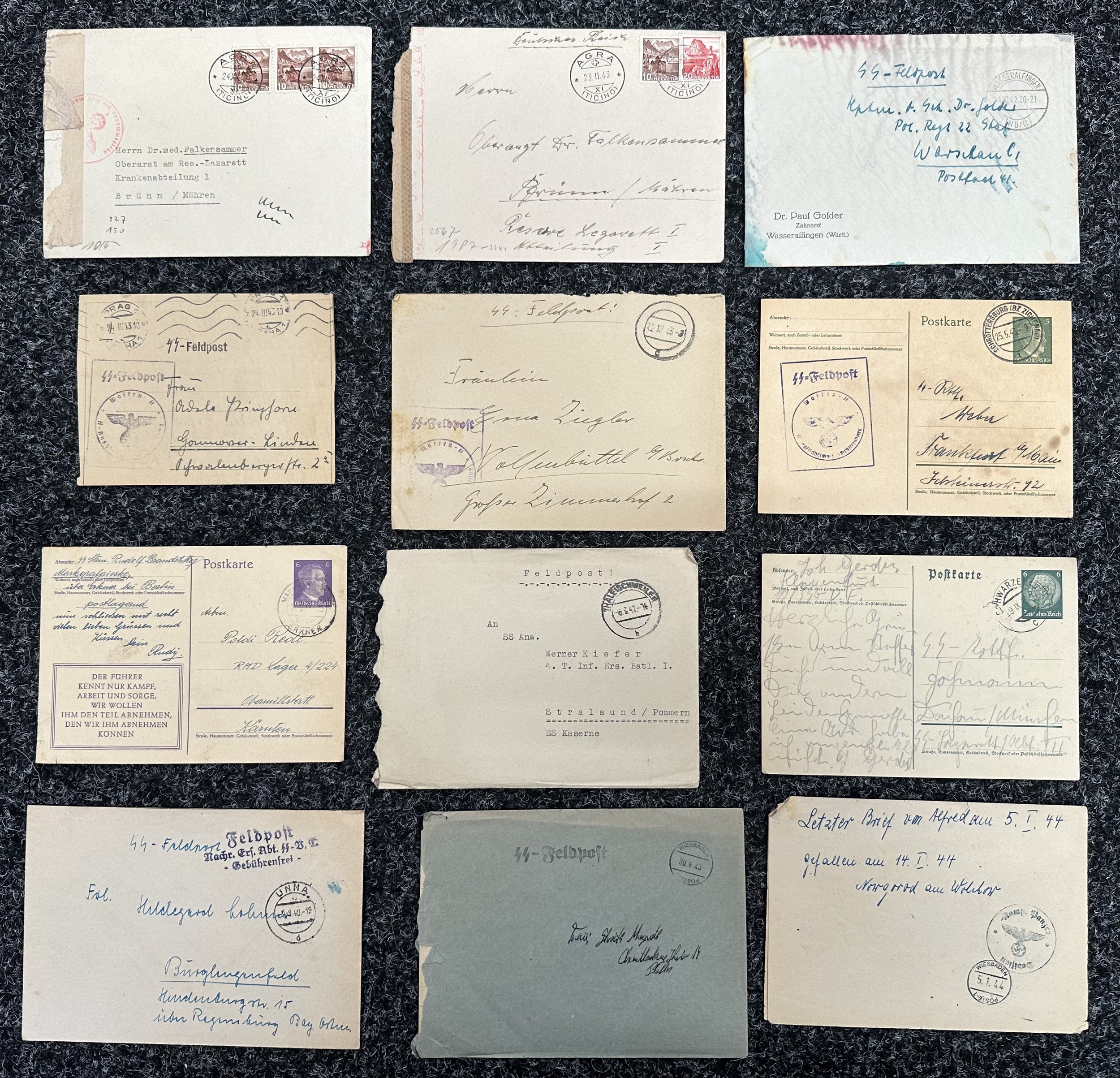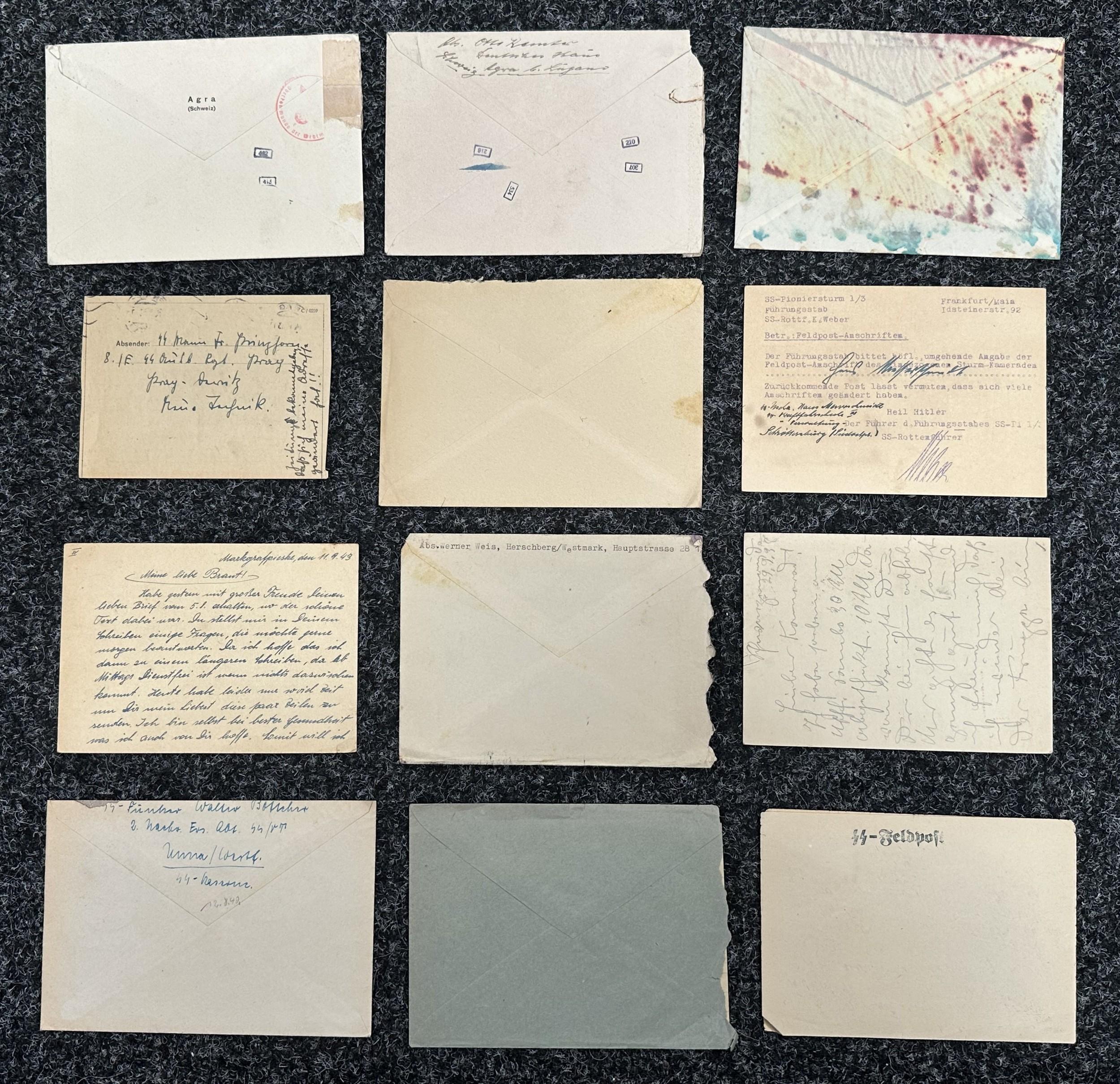WW2 Third Reich Waffen SS Feldpost letter collection. Two sent to the same Dr. Various units including Totenkopf Inf Regt, SS Police, SS-VT, etc. One letter sent by a soldier later KIA. (12)