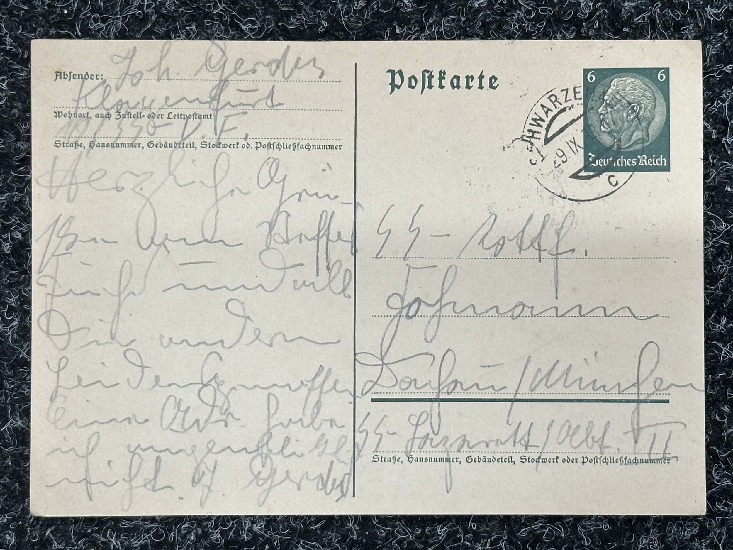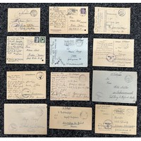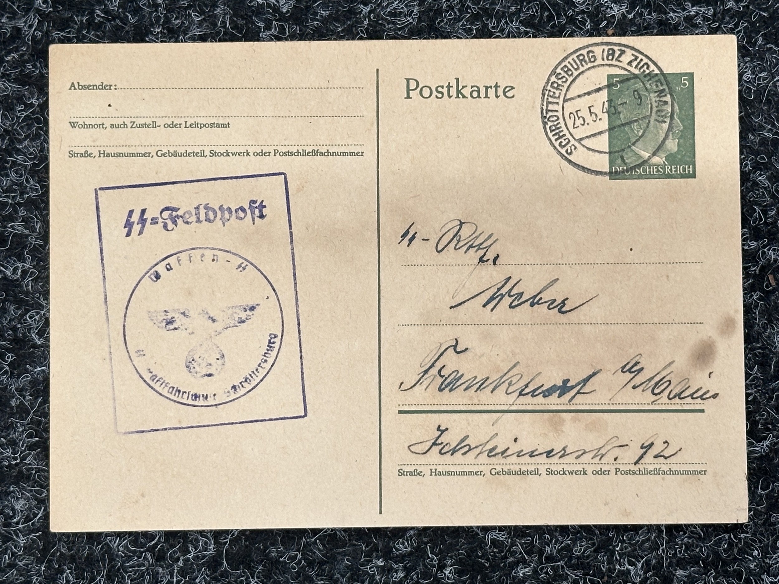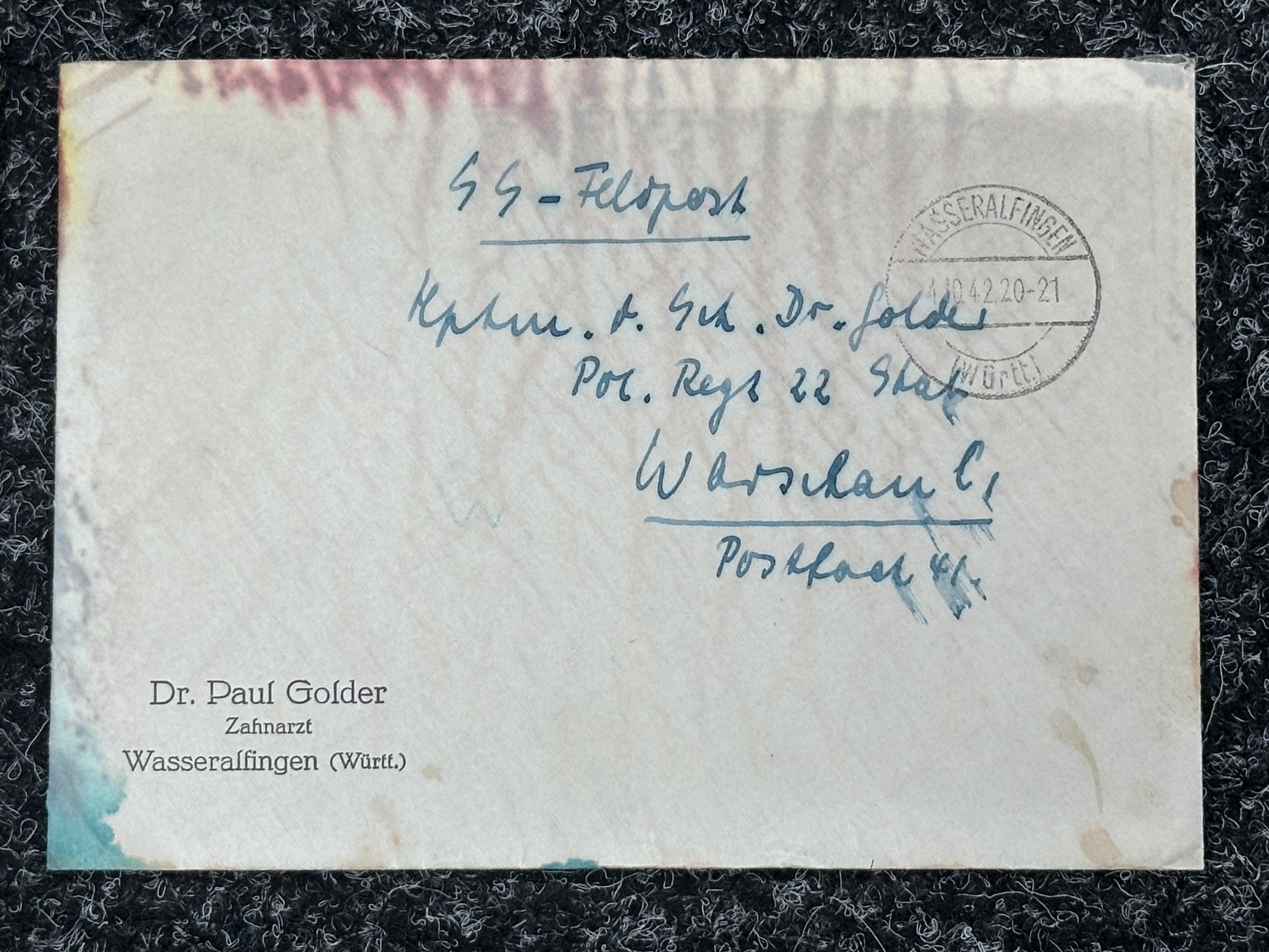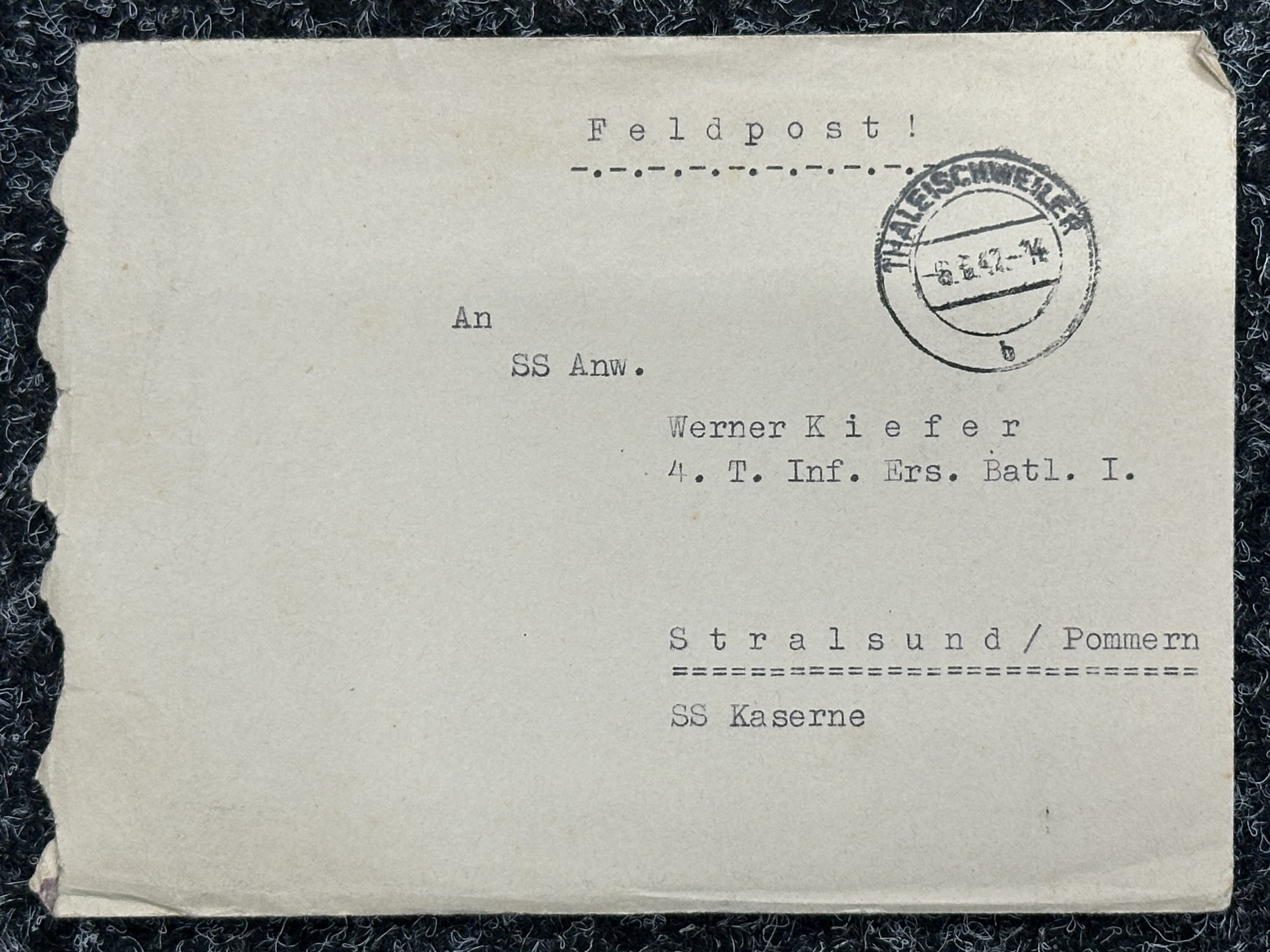 WW2 Third Reich Waffen SS Feldpost letter collection. Two sent to the same Dr. Various units including Totenkopf Inf Regt, SS Police, SS-VT, etc. One letter sent by a soldier later KIA. (12)