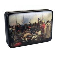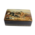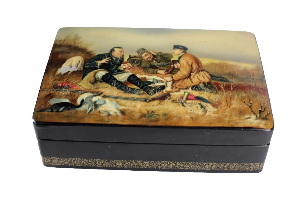 Fedoskino Pegockuno, 21st Century Russian SchoolAn attractive rectangular Russian lacquered Box, the top with attractive hand painted landscape scene after Skripunov "Hunters at Halt," signed lower left and right, stamped on inside with red interior, the bottom with interleaved gilt design, approx. 22 cms (8 1/2"). (1)