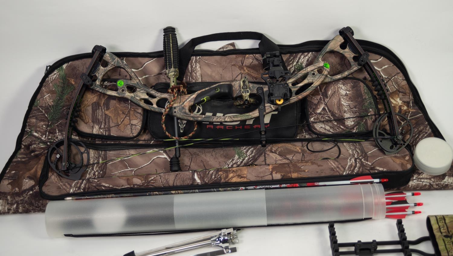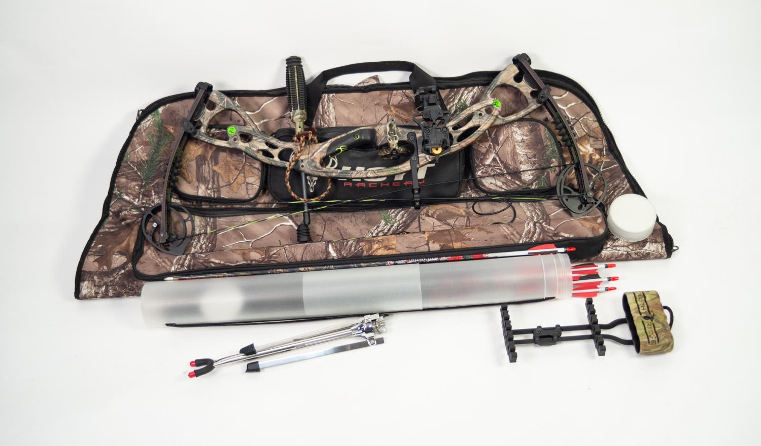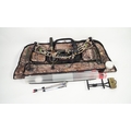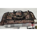 LEFT HANDED HOYT BONE COLLECTOR COLLECTOR’S EDITION COMPOUND BOW, IN CAMO, together with INSTRUCTION MANUAL, ‘TROPHY RIDGE’ ARROW HOLDER, ‘V-LOCK STRAP’, ‘TRU BALL MAX PRO 4 THUMB RELEASE AID, STRINGS, SET OF TWELVE ‘BLOODLINE 330 9.4GPI CARBON ARROWS, in expandable plastic tube, FOLDING CHROME STAND, etc, in a ‘HOYT ARCHERY’ SOFT CAMO CASE