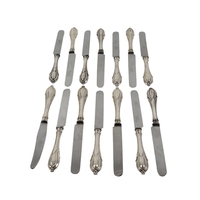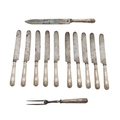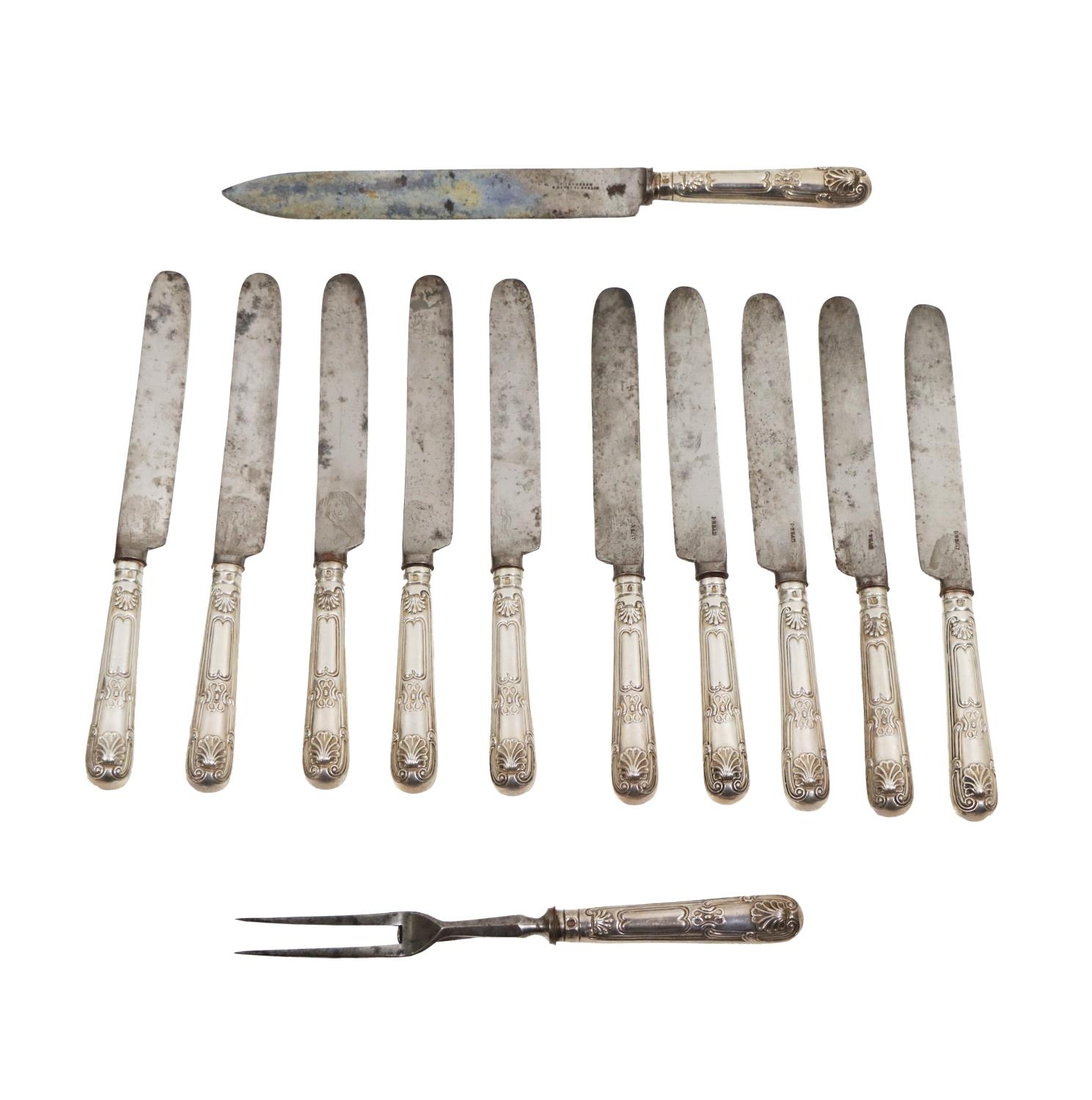 A set of 10 Irish Georgian period silver handled Kings pattern Dinner Knives, with stamped blades 'I. Read,' together with a carving Knife and Fork, en-suite. (12)