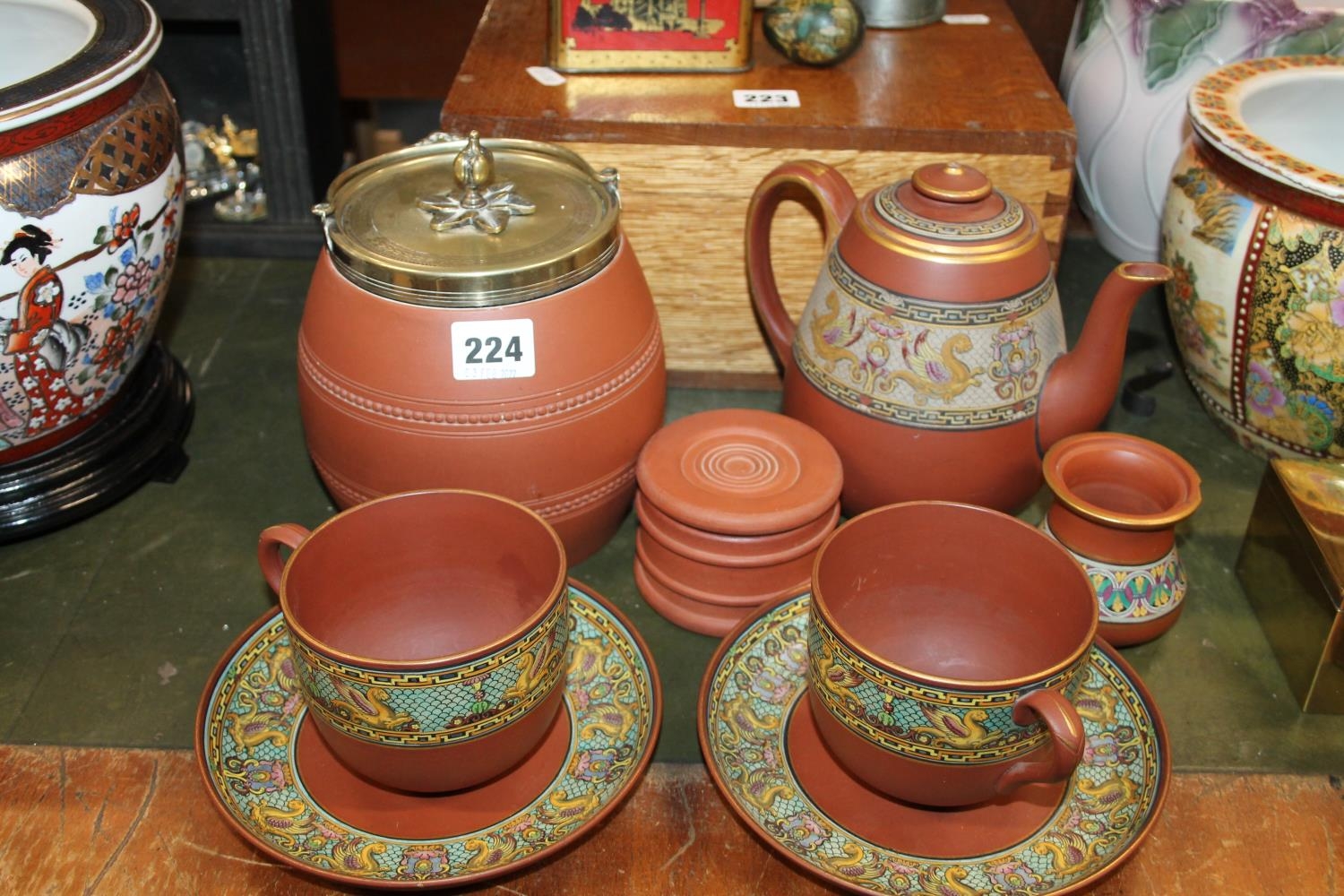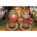 Victorian terracotta ware to include biscuit barrel, teapot, cups and saucers, etc.