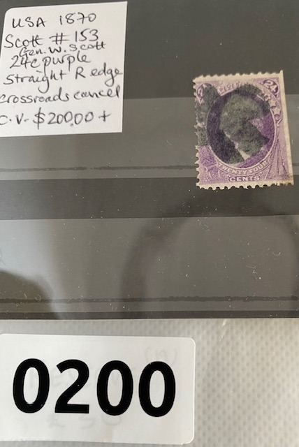 US Gen W Scott 24c purple stamp 1870 with rare crossroads cancel. USA Scott # 153 high catalogue value $ 200