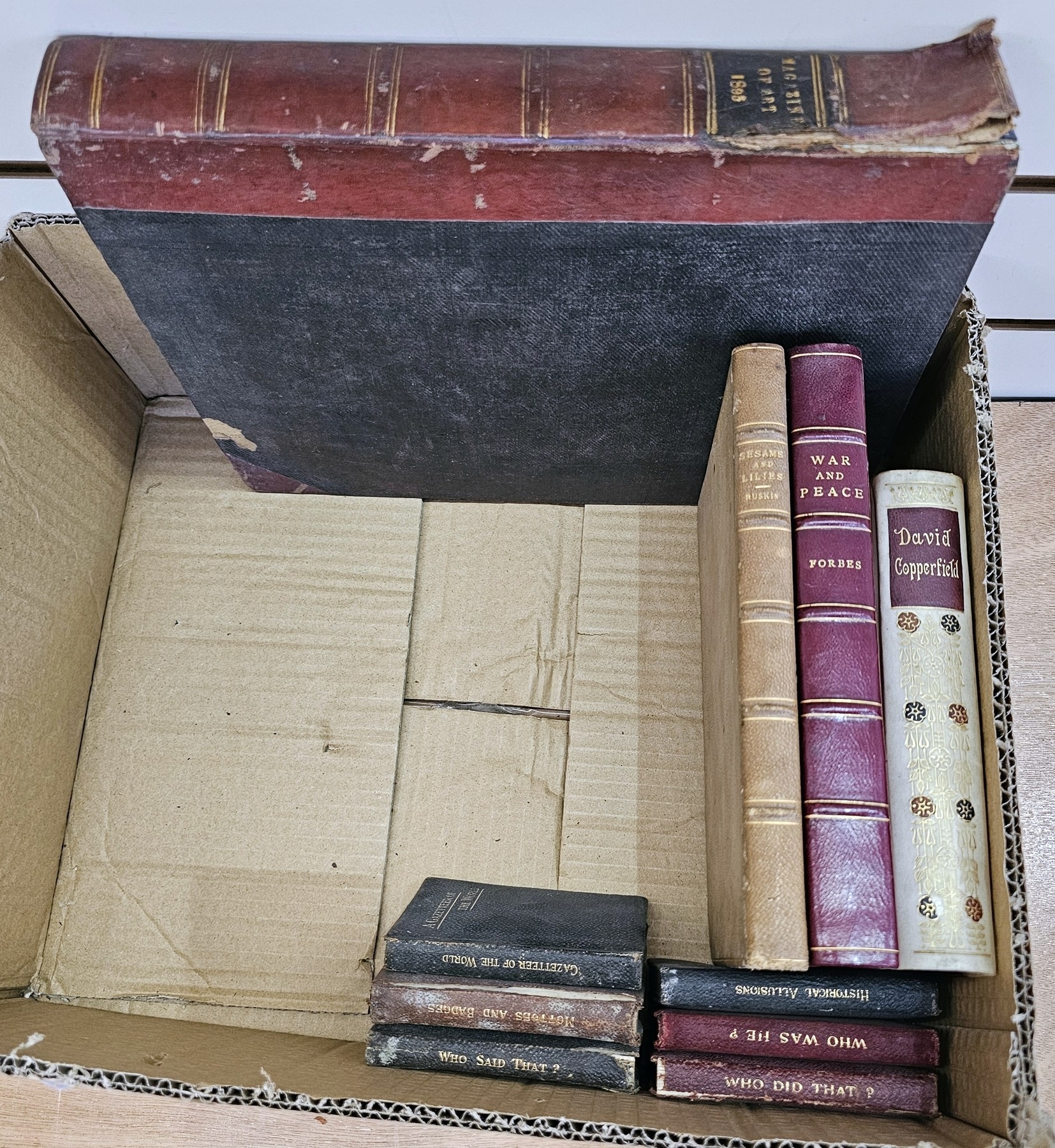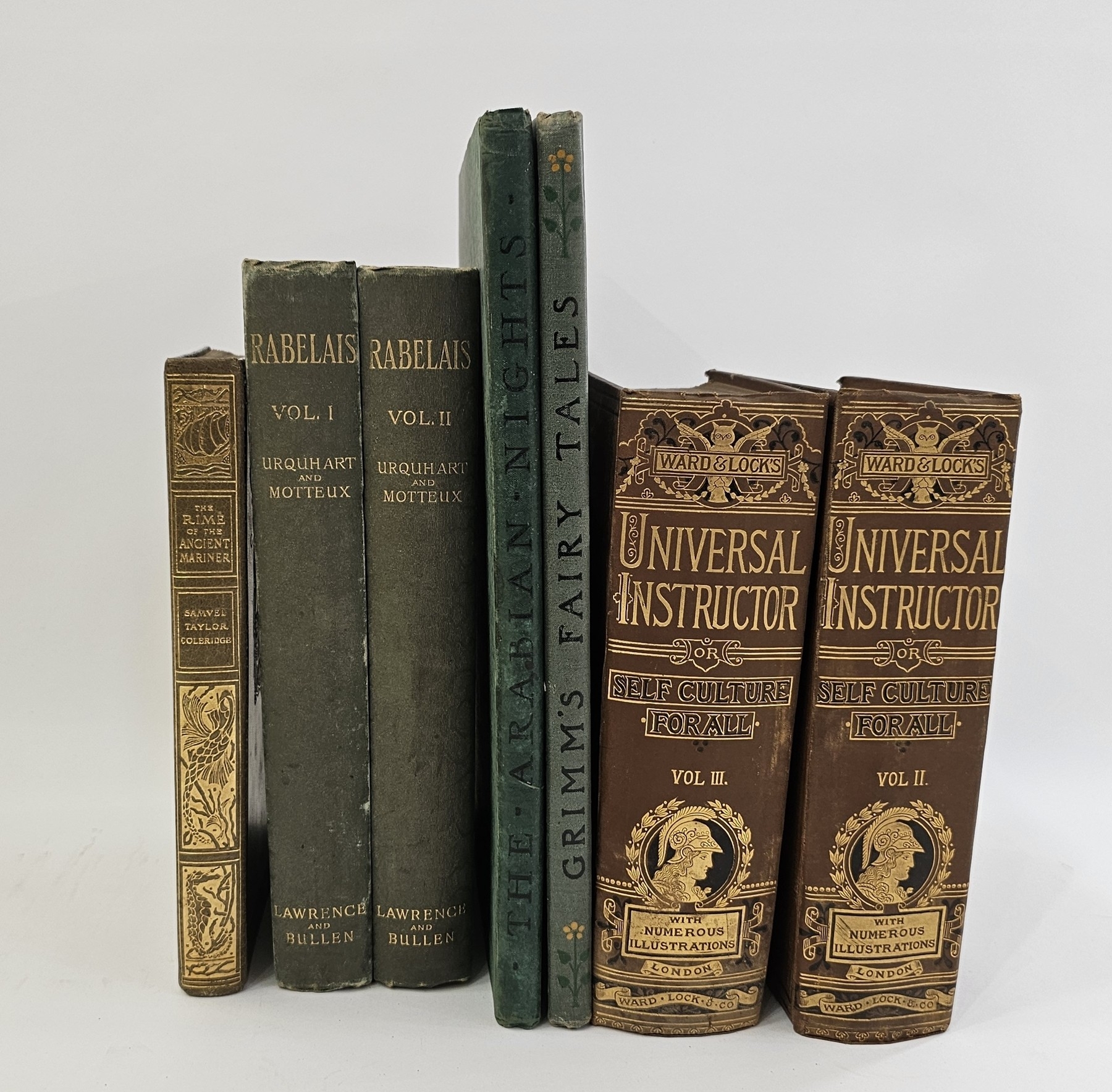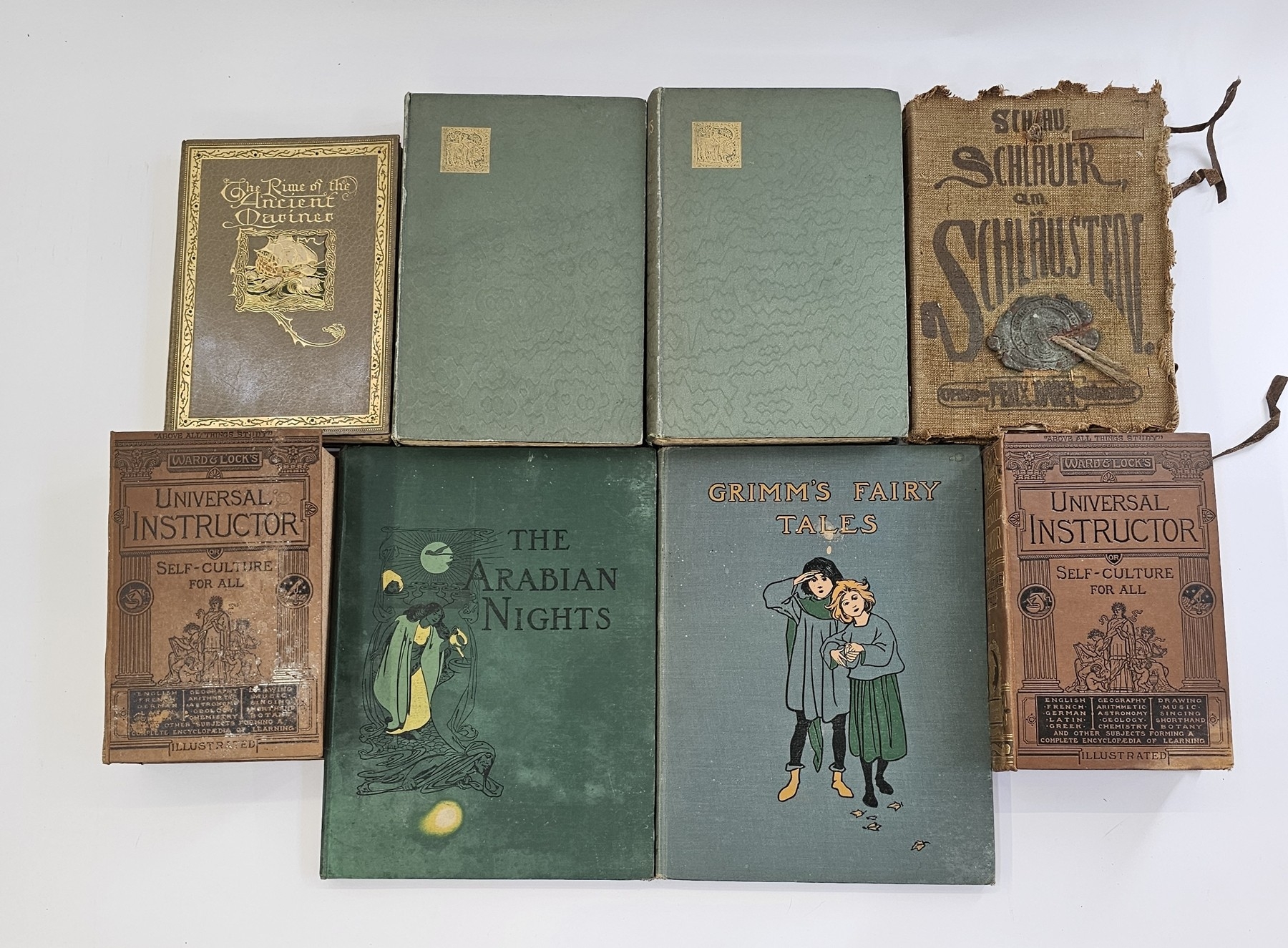 Pogany, Willy "The Rime of the Ancient Mariner in seven parts by Samuel Taylor Coleridge", George G Harrap n.d., colour plates, illustrations in text, decorations, marbled ep, full morocco with gilt pictorial titles and decorations, pages loose, deckle edges, Ruskin, John "The Works of John Ruskin Sesame and Lilies", vol 1 only, George Allan 1887, decorated ep, bookseller label Edwin Chapple, George Street, Plymouth, gilt dentelles, full leather, gilt titles and raised band, leather is soiled and rubbed, fine binding - Forbes, Archibald "Memories and Studies of War and Peace", Cassell & Co 1895, marbled ep, small bkpl top left hand corner inside front board, half maroon leather with marbled boards and gilt rules, gilt titles, raised bands, top corners are bruised, The Tudor Classics - Dickens, Charles "David Copperfield", Edward Henry Wells, Faringdon Street, quarter velum, with Art Nouveau gilt and coloured decorations to backstrip, pastedown title, Stratton, Helen (ills) "Grimms Fairy Tales" and "The Arabian Nights", Blackie & Son, folio, pictorial boards, Urquhart and Motteux "Rabelais" 2 vols, Lawrence & Bullen, green cloth, 6 vols of The Miniature Reference Library, full leather, to include "Who Did That", "Who Was He", etc, 2 vols of The Universal Instructor and Smart Smarter Smartest - German text, a Facsimile of Ancient Egyptian volume (1 box and 3 vols)