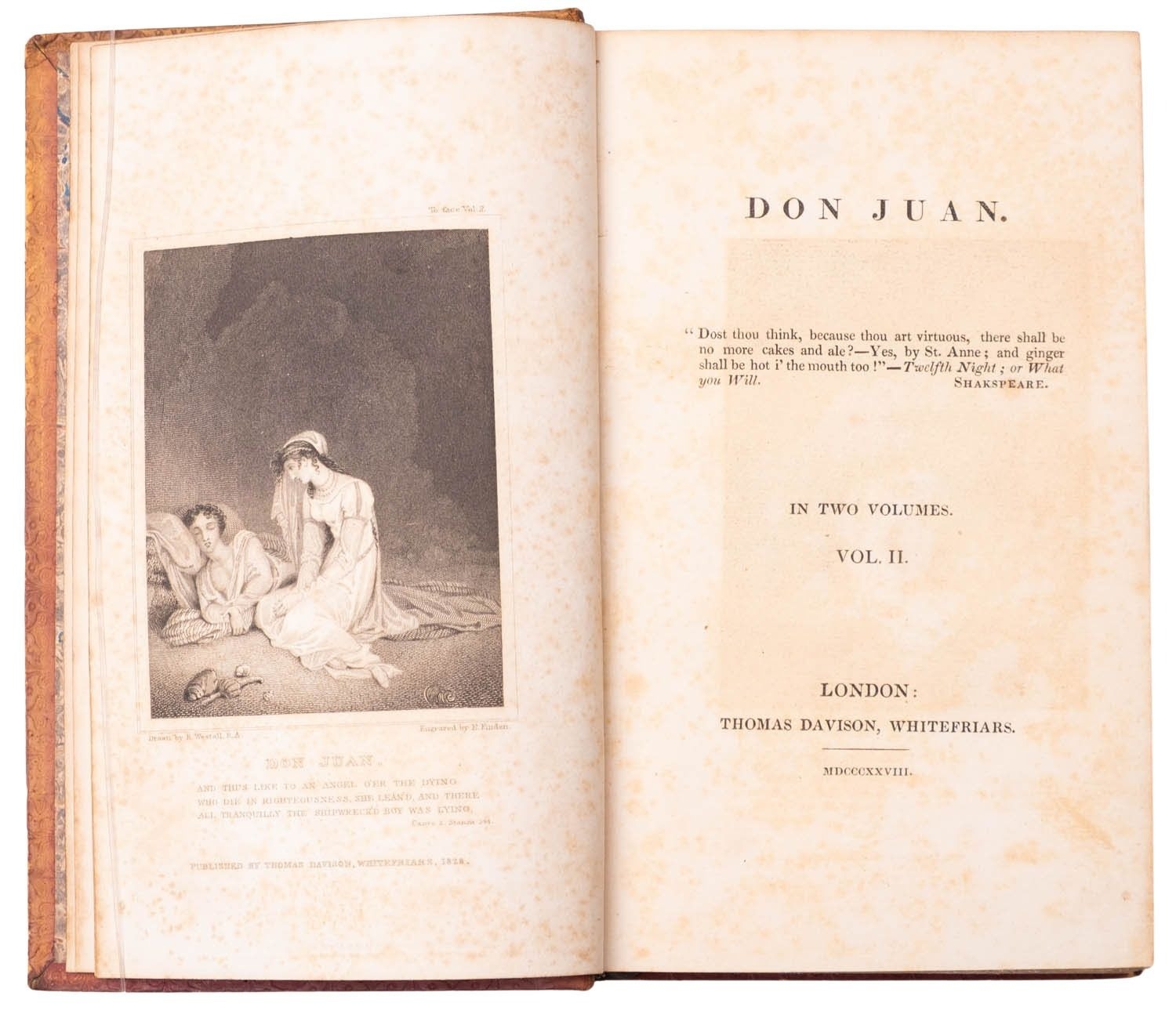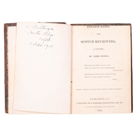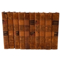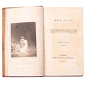 BYRON, George Gordon. 10 vols. uniformly bound, comprising: The Works, in 6 vols., London: John Murray, 1827; The Works, vols, VII & VIII, London: John and H. L. Hunt, 1824; Don Juan, 2 vols., London: Thomas Davison, 1828; foxing, contemp. panelled calf gilt, scuffed, spine labels mostly lacking, marbled edges and endpapers, 12mo. (10)