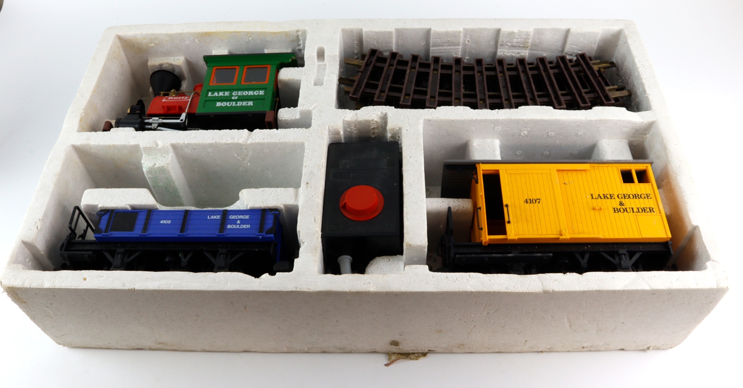 Lehmann L.G.B. 90770 'The Big Train' Fantasy Lake George & Boulder train set with 0-4-0 locomotive Rusty, 2x rolling stock, track, transformer & controller. Box water damaged a/f