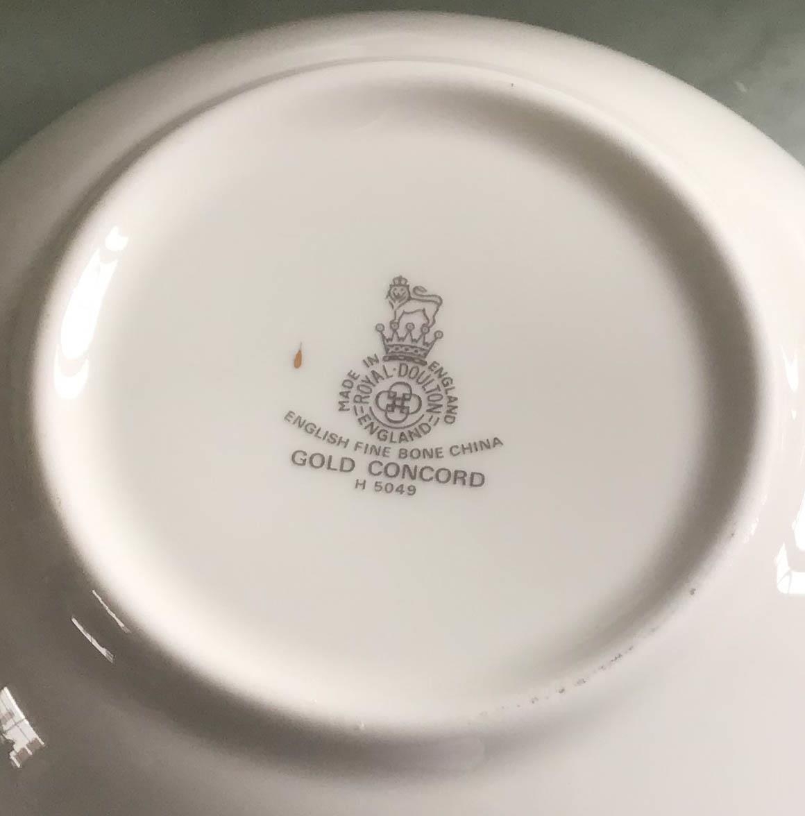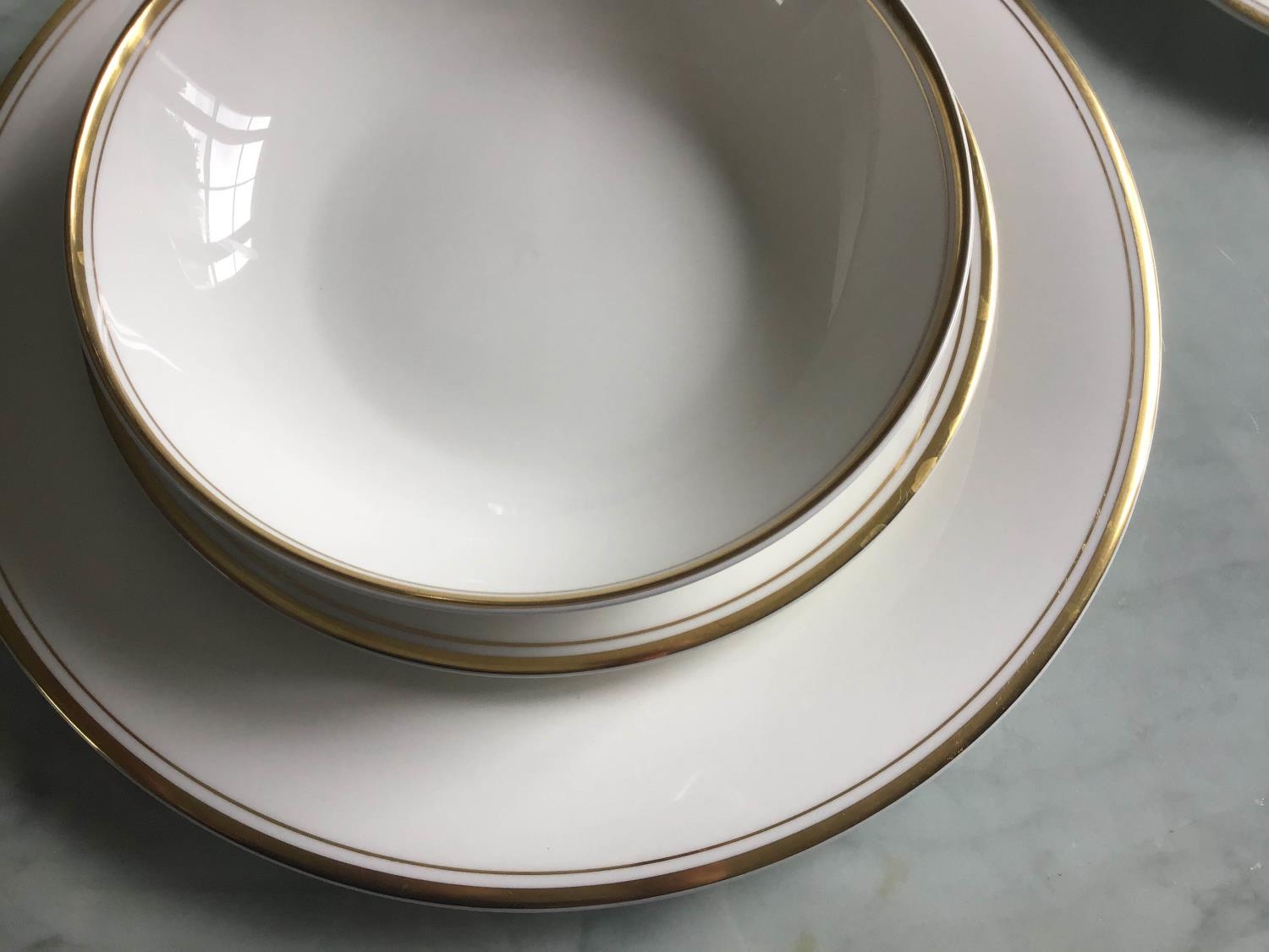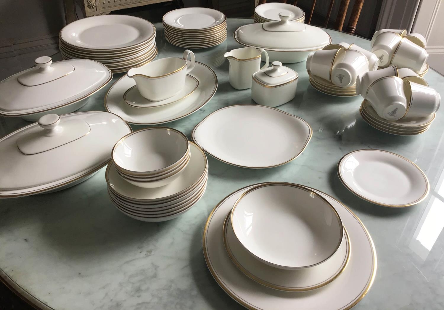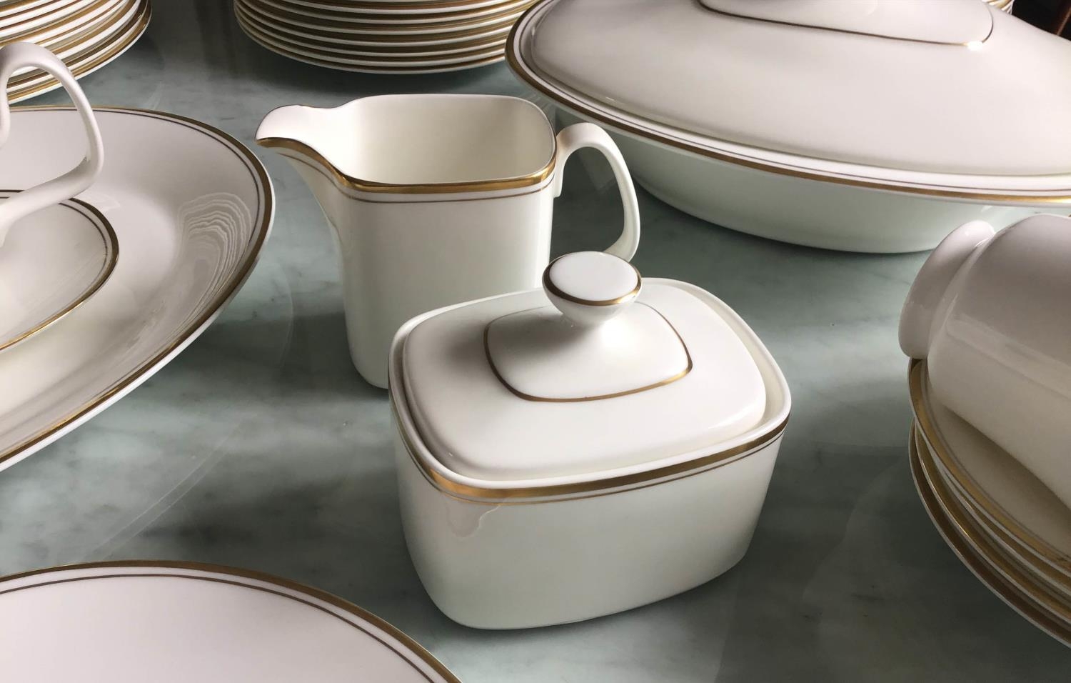 DINNER SERVICE, English fine bone china, Royal Doulton 'gold concorde', twelve place, six piece settings, approx. seventy-nine pieces. (Qty)