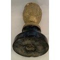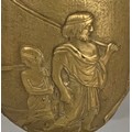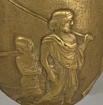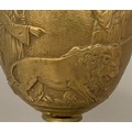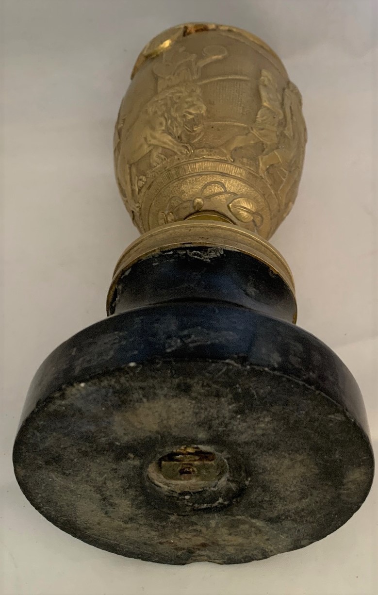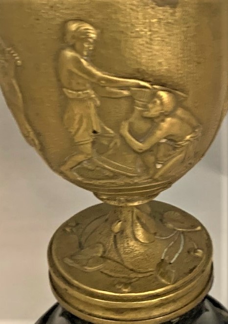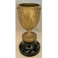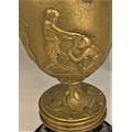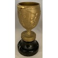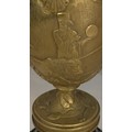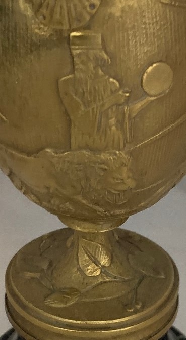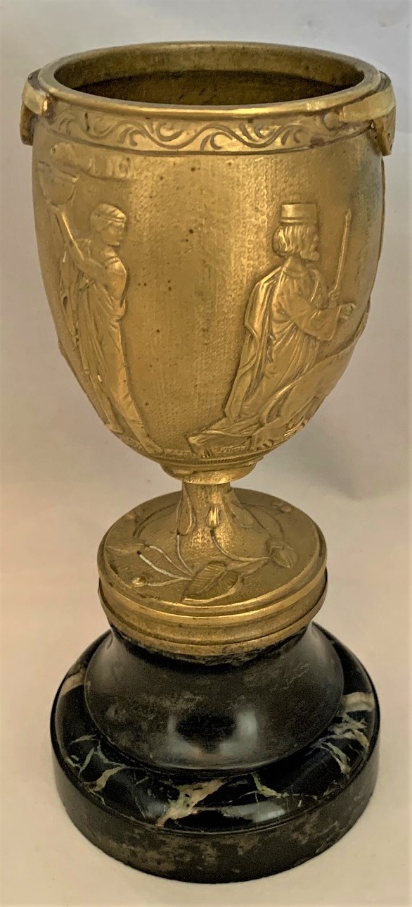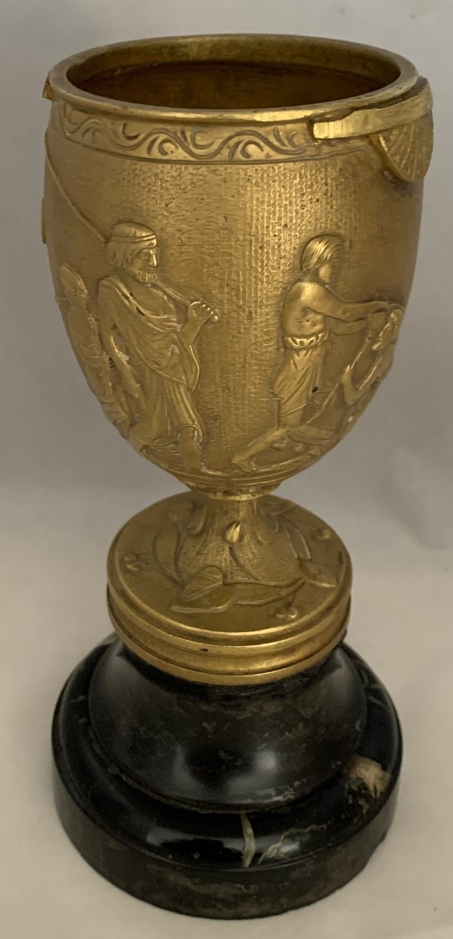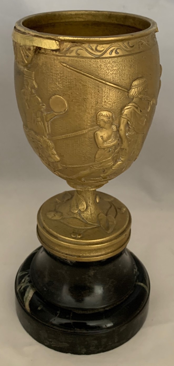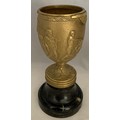 Gilded bronze Grand Tour chalice, 19th century, decorated in the Neoclassical taste with figures and a lion, set on a circular black marble base, 18cm high.