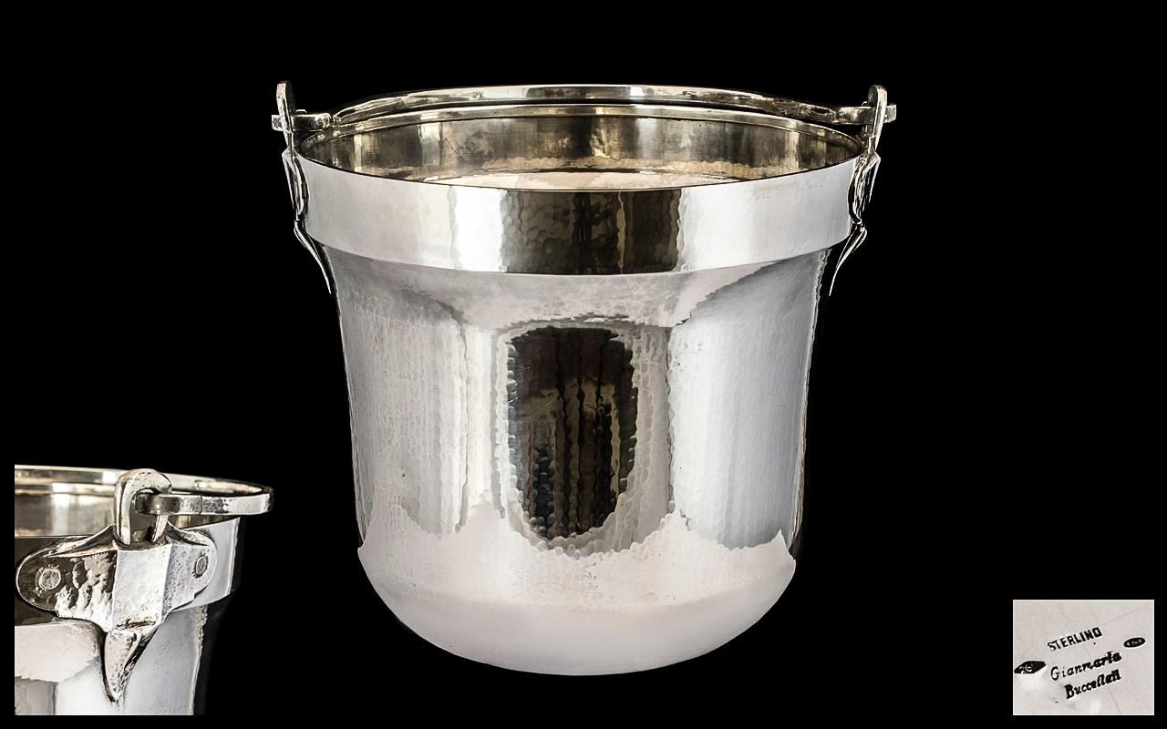 Gianmaria Buccellati Italian - Superb Large and Impressive Hand Crafted Planished Sterling Silver Ice Bucket with Carrying Swing Handle. c.1960. Wonderful Craftsmanship for The Luxury Market. Silver Weight 80 ozs. Height 10 Inches - 25 cms & Diameter 10,75 Inches - 26.90 cms. Marks to Underside of Ice Bucket - Sterling 925 and Signed Gianmaria Buccellati. Beautiful Condition In All Aspects. Very Low Estimate For This Quality.