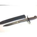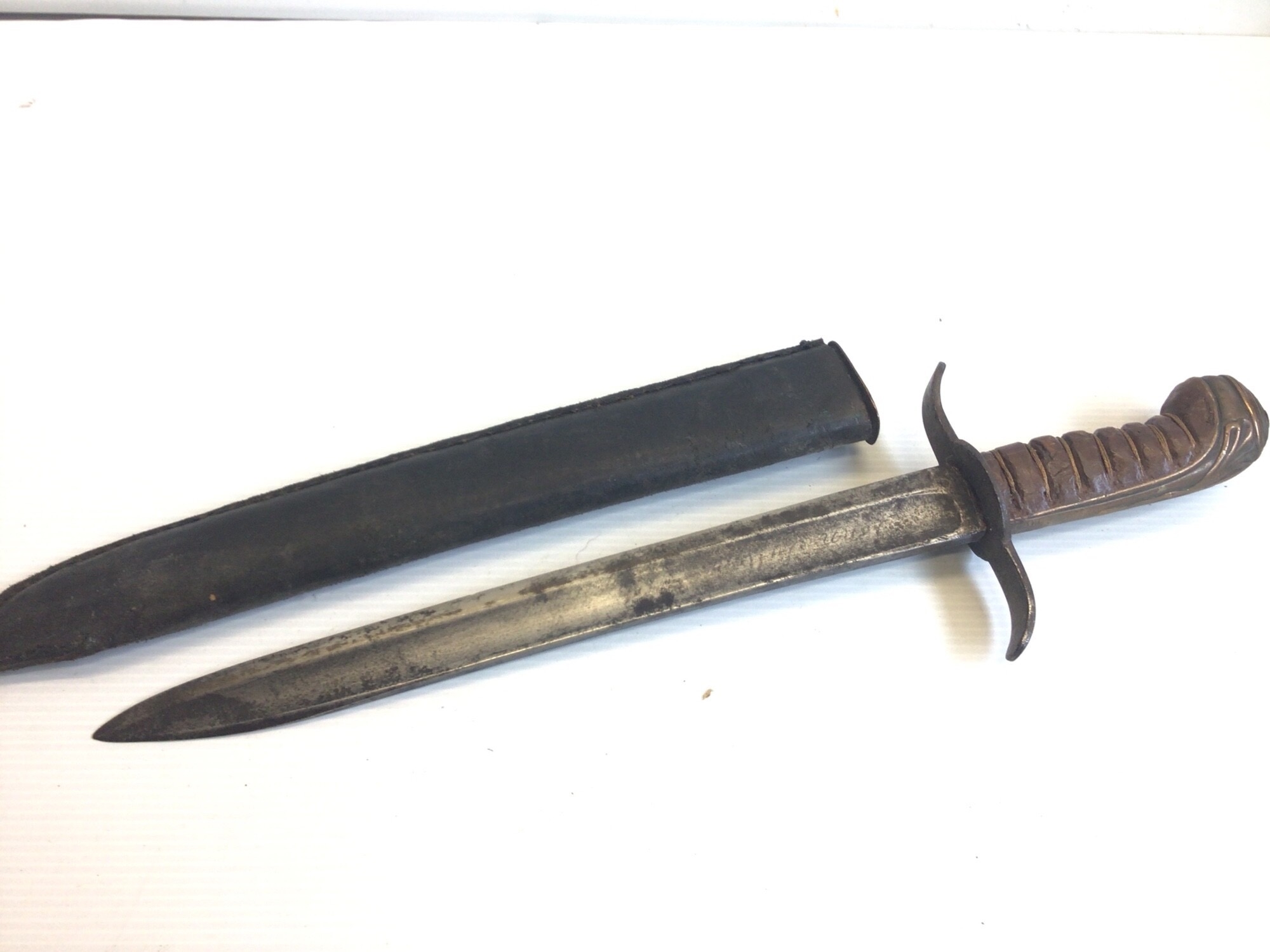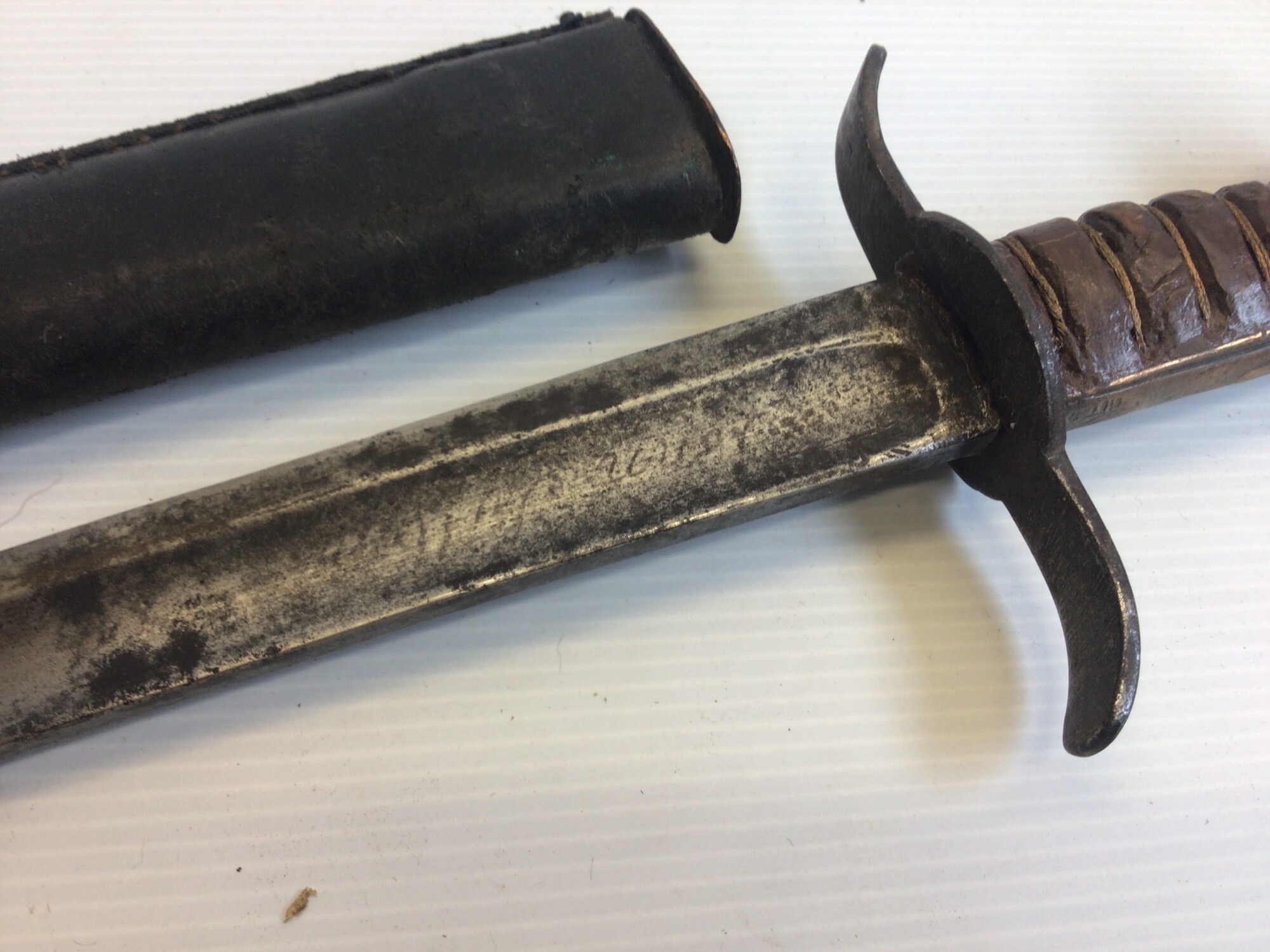 A 19th century short sword the steel blade with faint inscription wired grip and leather scabbard. Length 42cm