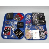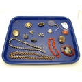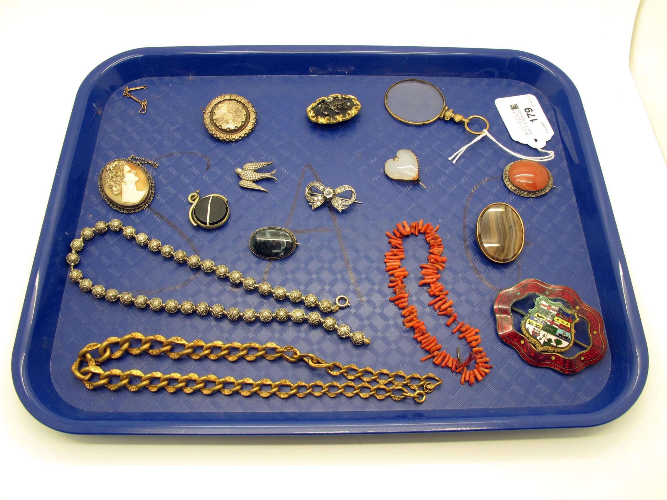 A Collection of Victorian and Later Brooches, including polished hardstone heart shape brooch, oval shell carved cameo brooch, magnifying glass, decorative graduated curb link chain, etc.