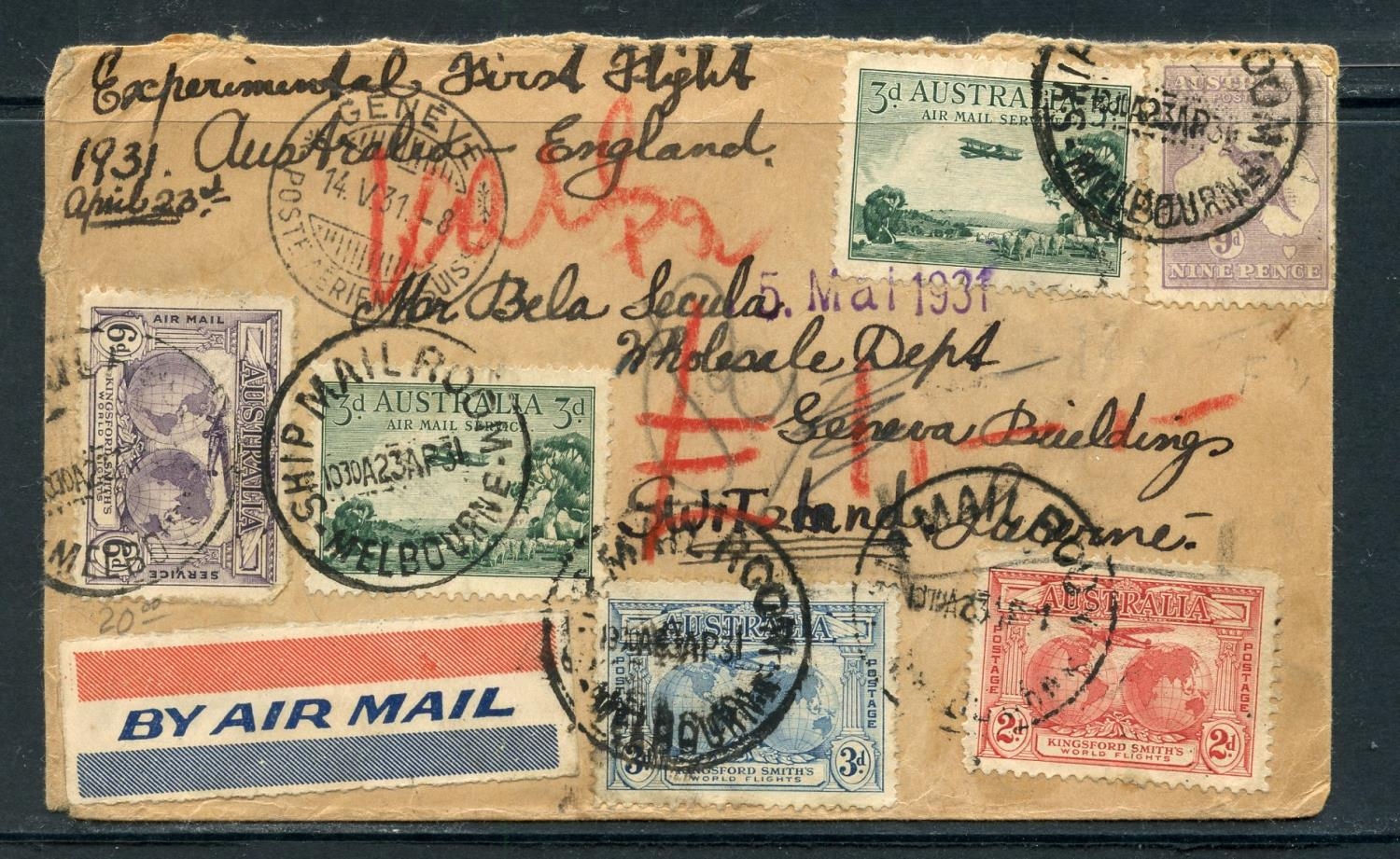 AUSTRALIA 1931 First Flight cover via Great Britain to Switzerland franked to 2/2d. Good decent condition.