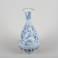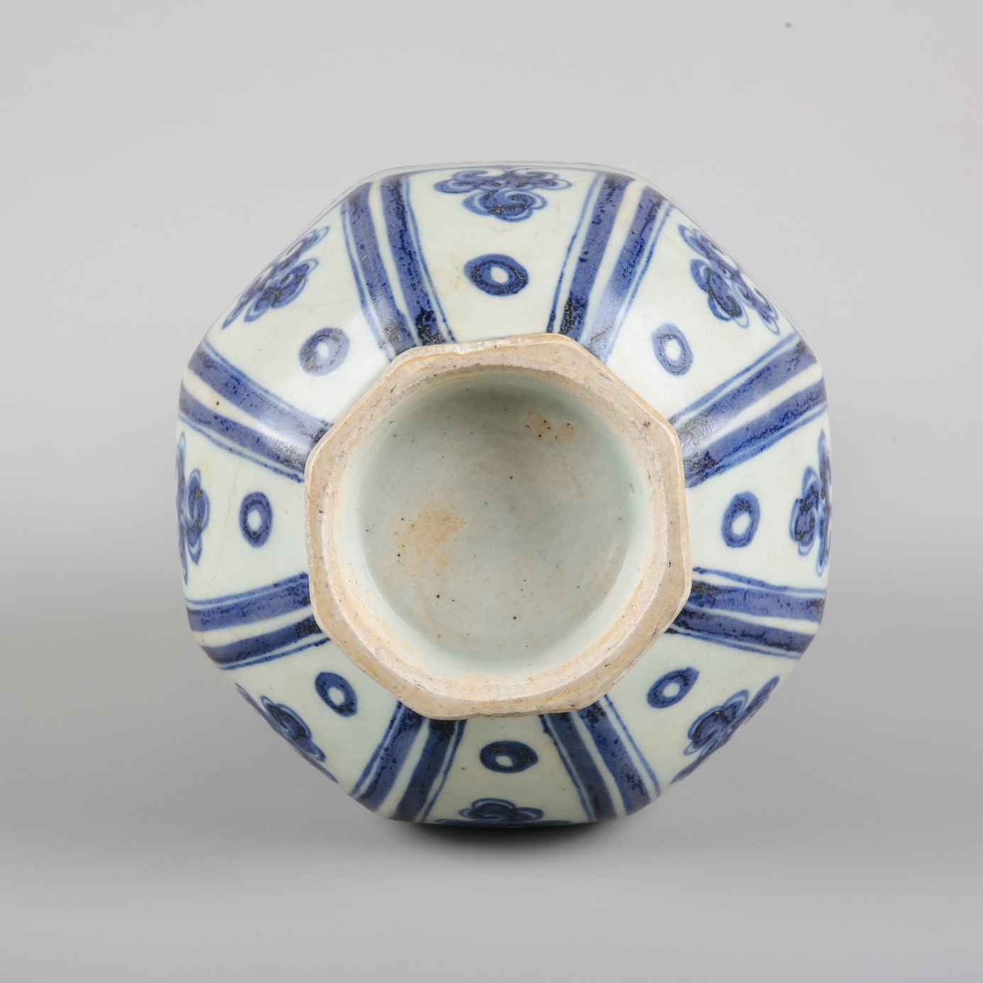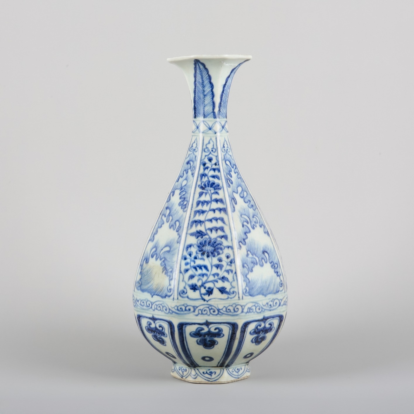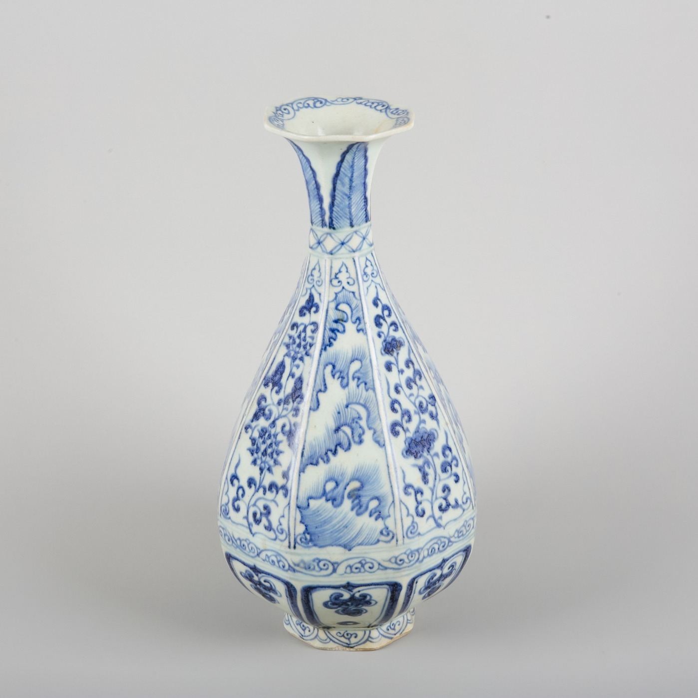 in Yuan dynasty style but likely later, in the Islamic taste, pear shaped and of octagonal section, decorated with alternating panels of trailing lotus flowers and waves, a plantain leaf border to the rim, 29cm high