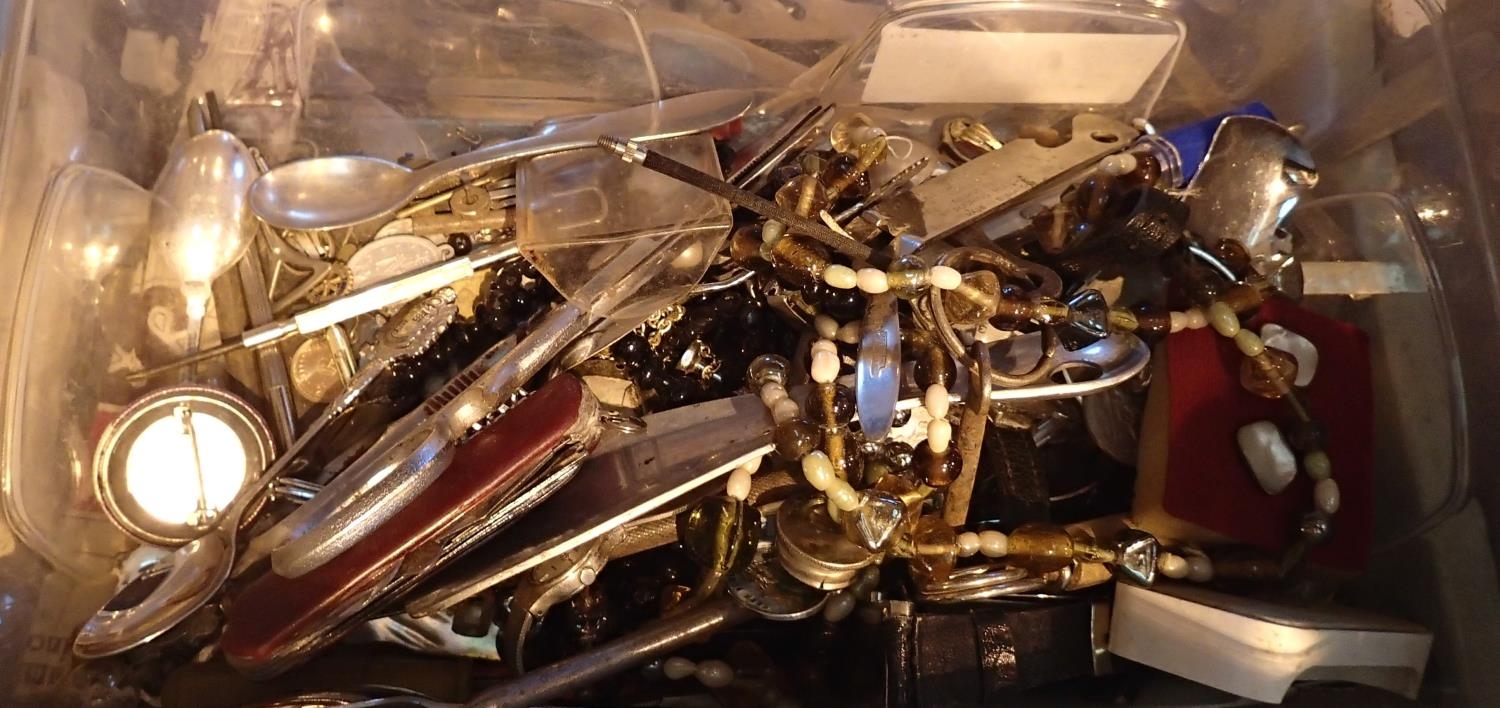 Large box of mixed kitchen utensils and flatware including silver plated cutlery, scissors etc. Not available for in-house P&P, contact Paul O'Hea at Mailboxes on 01925 659133
