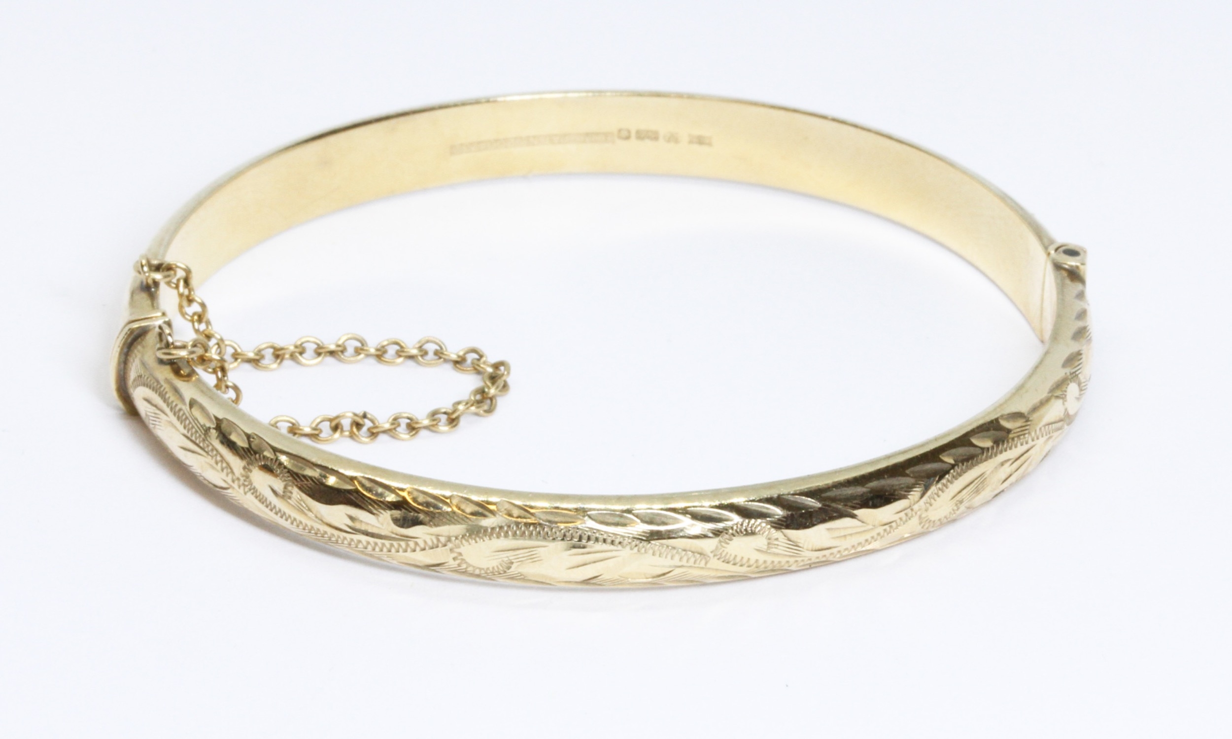 A 9ct gold bangle, convention marks, diameter 58mm, weight 8g.